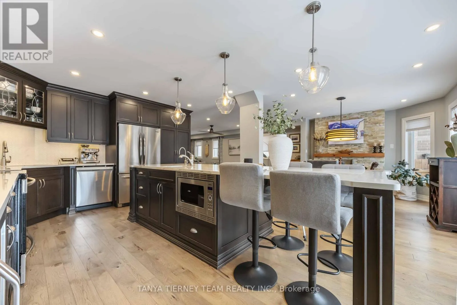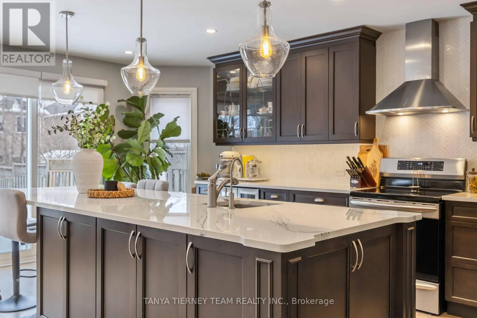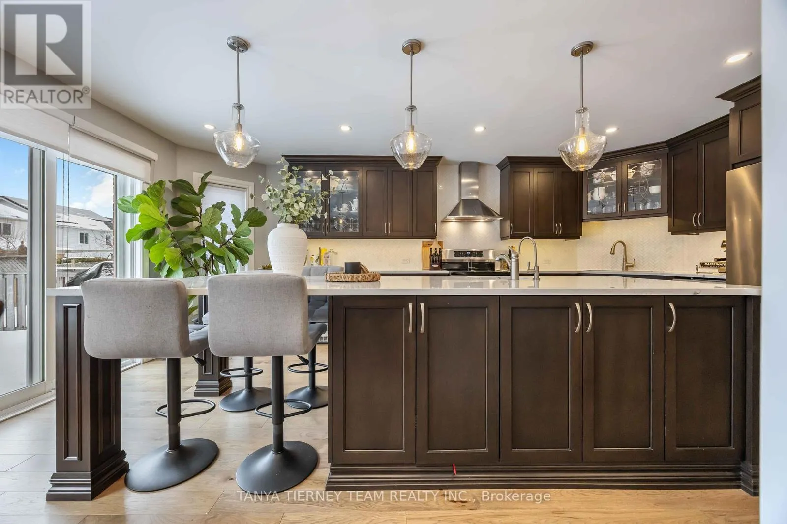 Whitby Shores Greenway & Four Winds This stunning Baycliffe-built Disney Wonder model offers approximately 2,070 sqft of beautifully updated living space with a custom open-concept floor plan designed for modern living! The professionally redesigned kitchen is the heart of the home, featuring an impressive 11-foot quartz island with seating, two sinks, custom cabinetry, under-cabinet lighting, and premium finishes throughout. The main floor has been fully redesigned with smooth ceilings and pot lights, creating a bright and elegant atmosphere. Hardwood flooring extends throughout the main and second floors, including all four spacious bedrooms. The primary suite features a walk-in closet, luxurious 4-piece ensuite complete with a relaxing soaker tub and balcony to enjoy your morning coffee in peaceful surroundings overlooking the beautifully landscaped front gardens. This home offers four bedrooms and three bathrooms, with numerous professionally renovated spaces including the main bathroom with double sinks, updated powder room, and renovated laundry room. The professionally finished basement is ideal for entertaining and relaxing, showcasing a wet bar, pot lights, large recreation room, and a dedicated exercise area with french doors. Additional highlights include new garage doors '26, closet organizers in bedrooms, and exceptional attention to detail throughout. Nestled in the demand Port Whitby community, steps to schools, parks, shops, scenic waterfront trails, Iroquois Sports complex, GO Train & hwy 401 access! (id:27476)