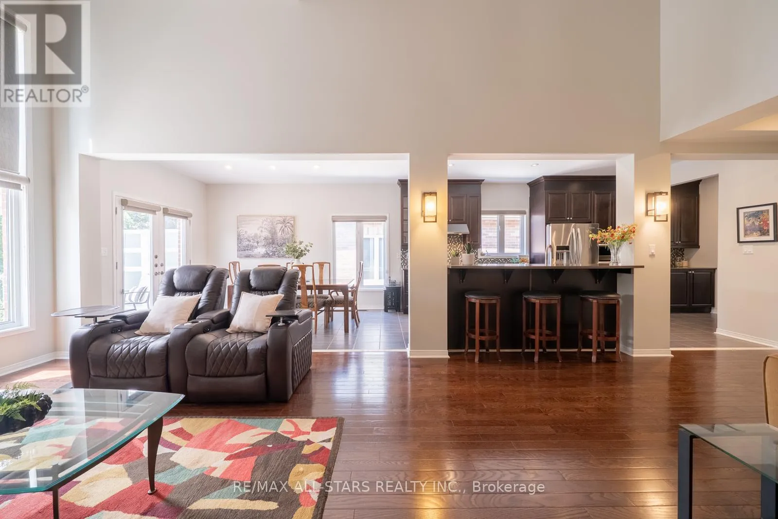10th Line & Forsyth Farm APPROX 5000SQFT FINISHED LIVING SPACE. Welcome to a rare blend of space, comfort, and style. Tucked away on a mature 54 x 101 ft lot in a quiet, family-focused neighbourhood, this bungaloft is designed for real life and unforgettable moments. The main level features rich hardwood floors and an airy open-concept layout, where the formal dining area connects to a convenient butler's pantry and a chef's kitchen made for cooking, hosting, and gathering. The great room, with its dramatic ceiling height, brings in beautiful natural light and anchors the heart of the home.The main-floor primary suite feels like a retreat, with peaceful garden views and a spa-inspired four-piece ensuite. Upstairs, a practical loft provides the perfect bonus living space, accompanied by two spacious bedrooms and a shared four-piece bath.The walk-out lower level adds endless versatility-whether you imagine a home studio, gym, theatre room, additional bedrooms, or all of the above. A full bathroom and thoughtful storage make the space both functional and flexible.Outside, the backyard is a true highlight. A covered composite upper deck offers year-round enjoyment overlooking a beautifully landscaped yard designed for relaxing, entertaining, and enjoying nature.Just steps from the Old Elm GO Station and close to top schools, parks, and daily conveniences, this home strikes the perfect balance of luxury, practicality, and location. It's a rare find-made to live in and love. (id:27476)