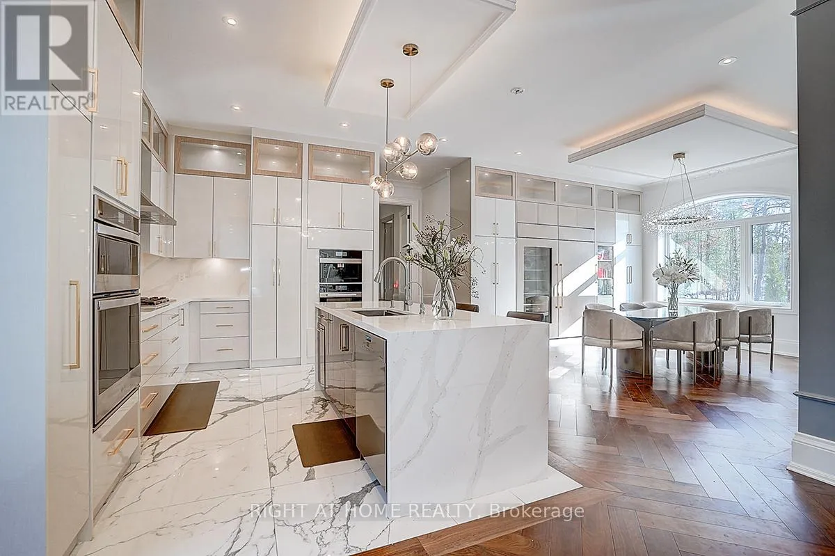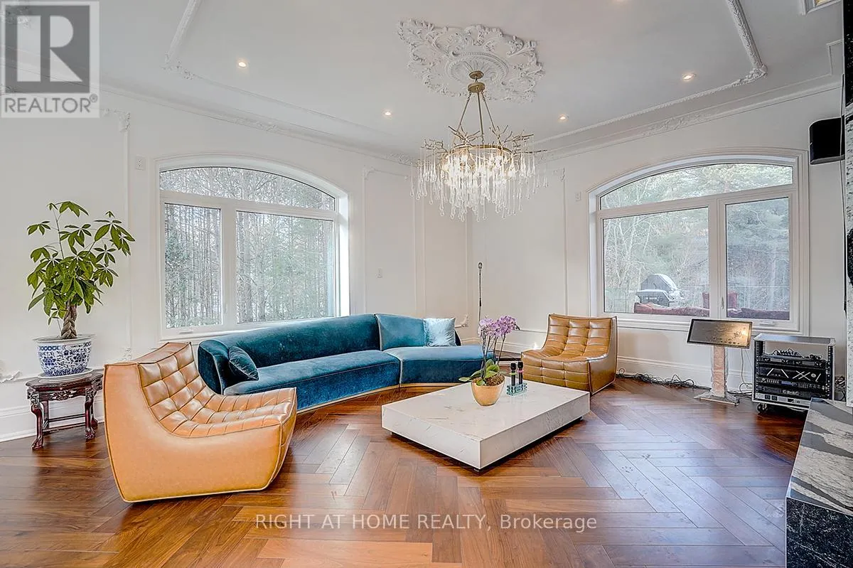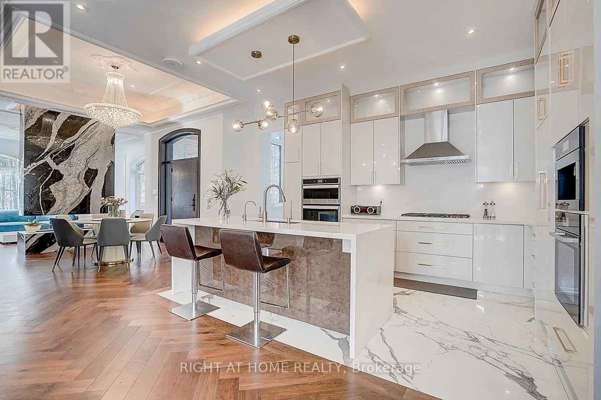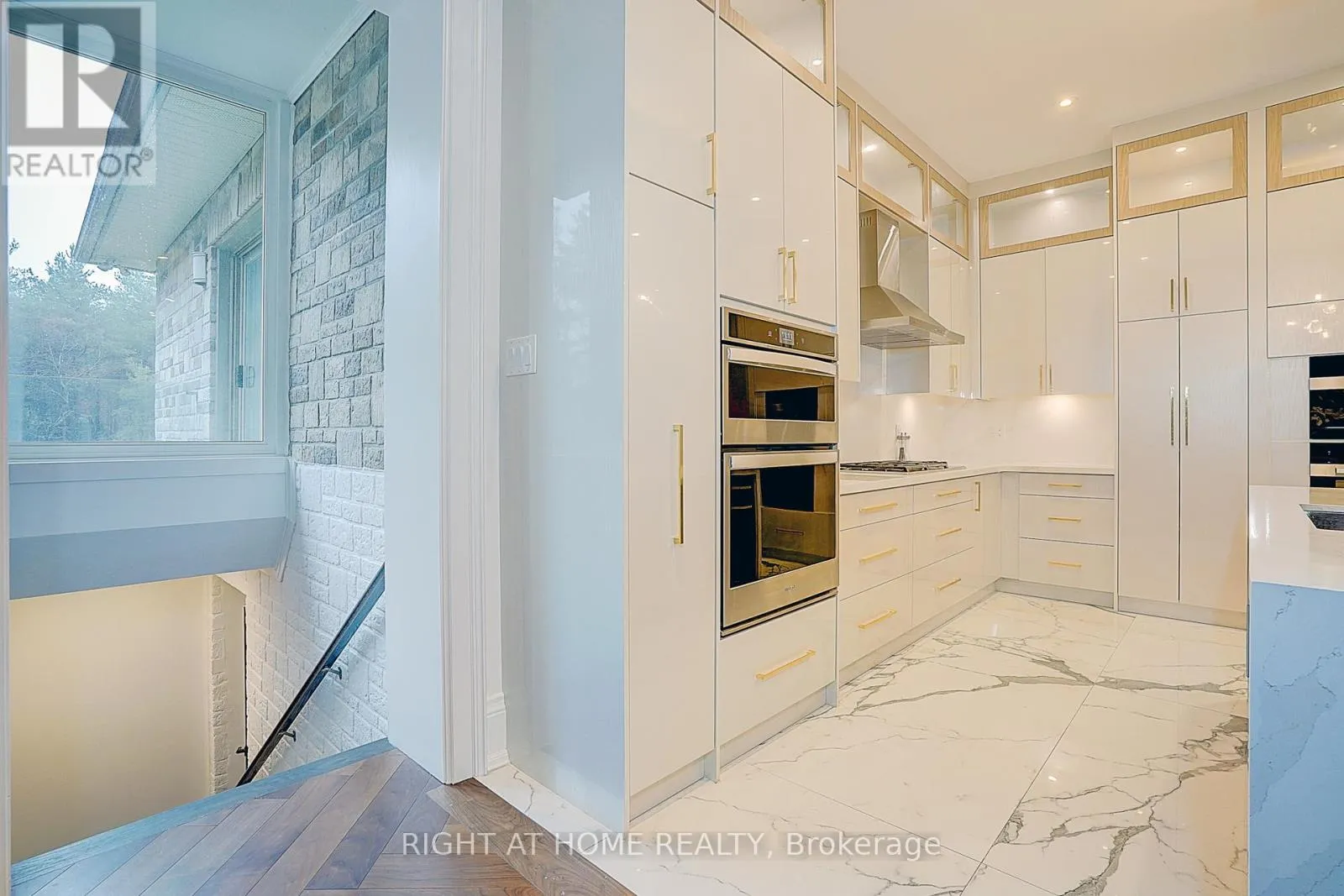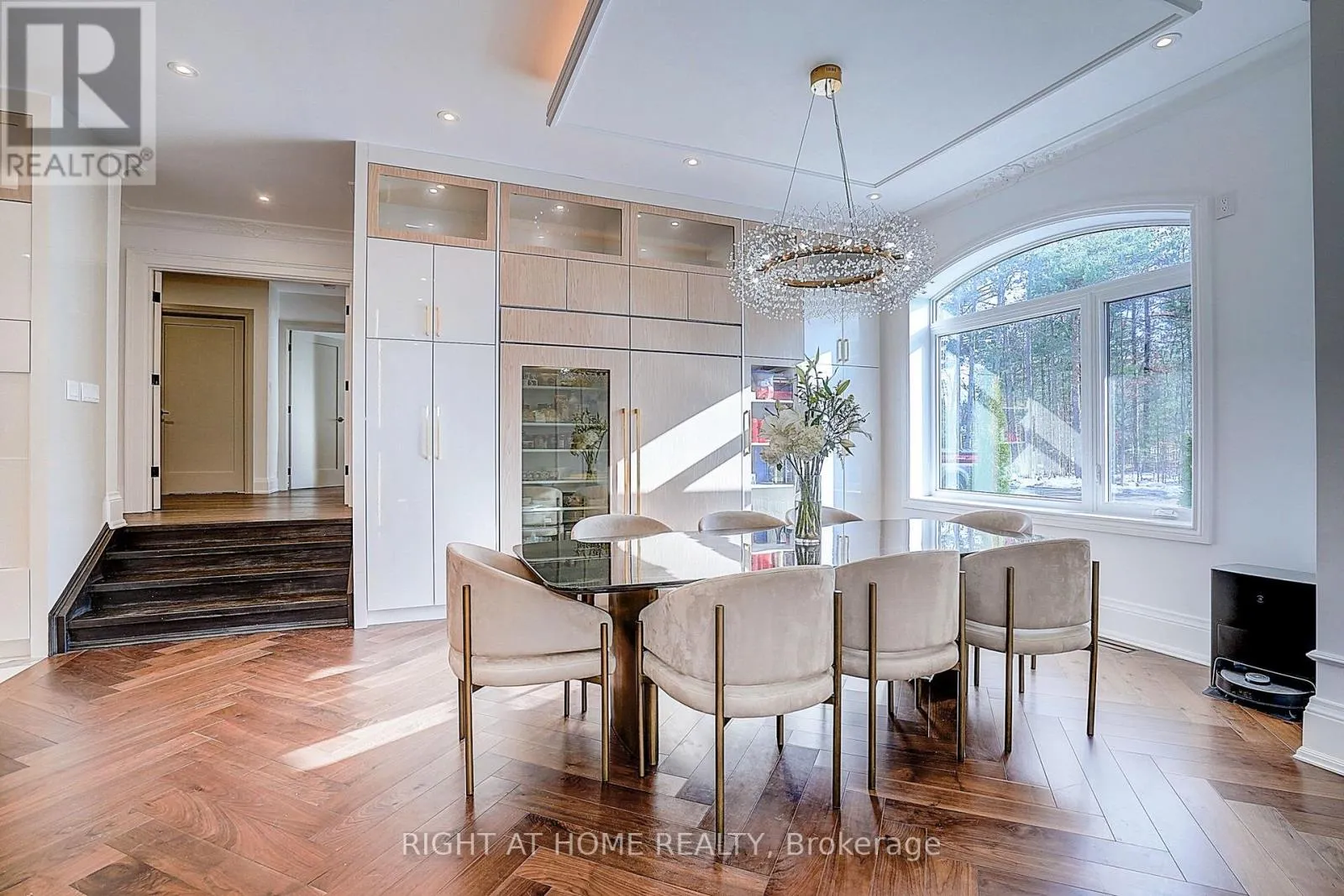 Aurora Rd & Mccowan Rare Modern French Luxury Bungalow Estate. A rare offering in today's market, this exceptional Modern French-inspired luxury bungalow redefines high-end living by seamlessly combining estate-level luxury with unparalleled everyday convenience-all on one expansive level. Set on a 2-acre private lot backing onto an endless forest, the home welcomes you with a crescent-shaped driveway and refined architectural detailing. Inside 12' ceiling (Main), solid walnut chevron flooring, custom plaster wall trims, medallion ceilings, and a dramatic floating marble TV and fireplace wall reflect timeless Modern French craftsmanship. The gourmet kitchen is fully equipped with elite appliances, including a 72" see-through Sub-Zero refrigerator and freezer, Wolf gas cooktop, and Miele built-in coffee machine, steam oven, and dishwasher-designed to elevate daily living hile supporting effortless entertaining. The main-level primary suite offers a true spa retreat, featuring a luxury ensuite bathroom with wet sauna, premium fixtures, and smart toilets that enhance comfort and hygiene throughout. An elegant entryway with floating custom cabinetry provides discreet and functional storage. What truly sets this bungalow apart is its fully developed 3,000-square-foot lower level, thoughtfully designed for both lifestyle and recreation. It includes a professional dance studio (10'), gym, walk-in temperature-controlled wine cellar, traditional wood sauna, snooker area, private Home Theater, and an additional ensuite bedroom-ensuring space for every passion without sacrificing main-floor convenience. The three-car garage features a golf simulator room and an upper loft offering exceptional flexibility. Outdoor living is elevated with a super-sized concrete rooftop deck, creating a four-season retreat surrounded by nature. An extended concrete driveway into the backyard further enhances functionality and scale. (id:27476)