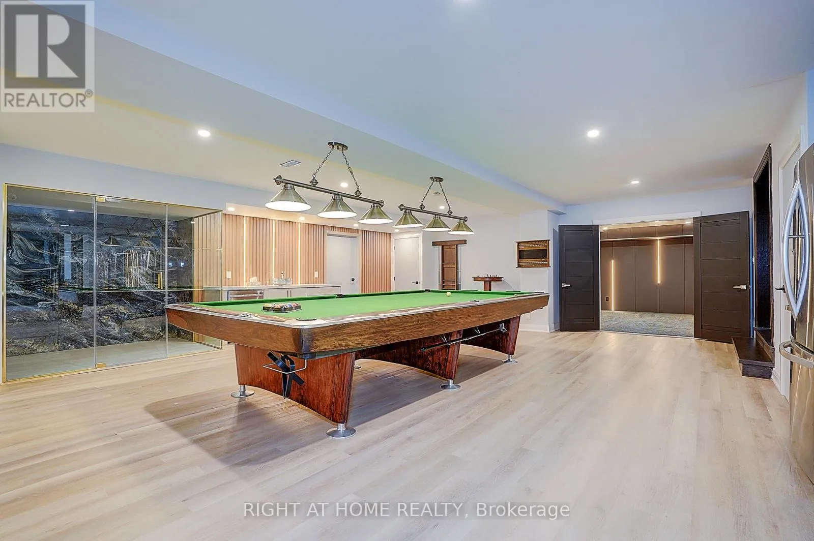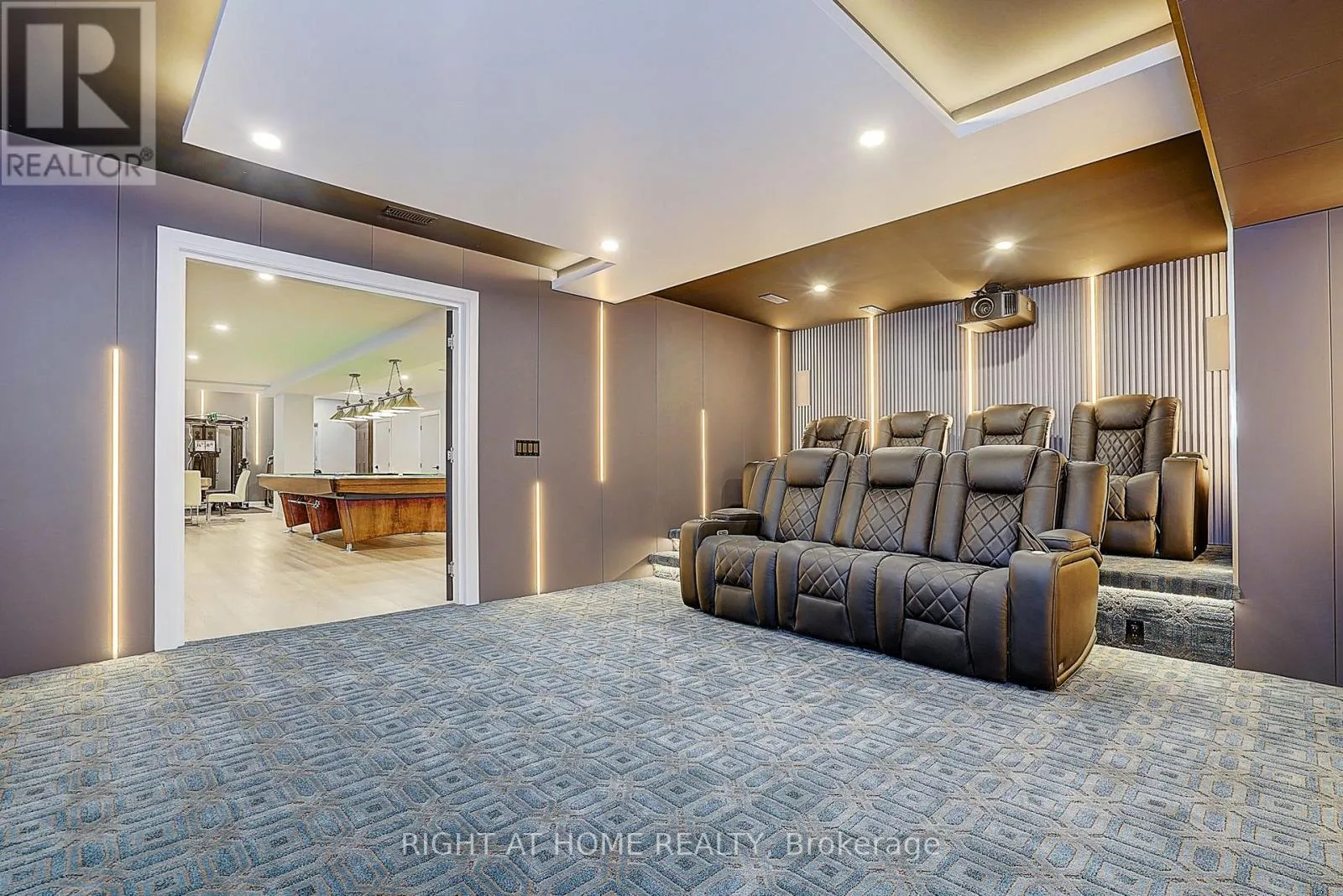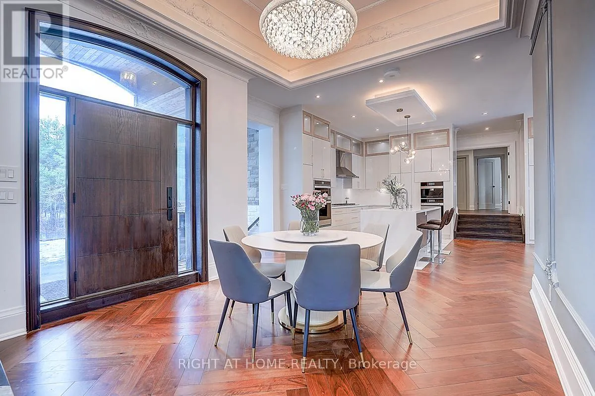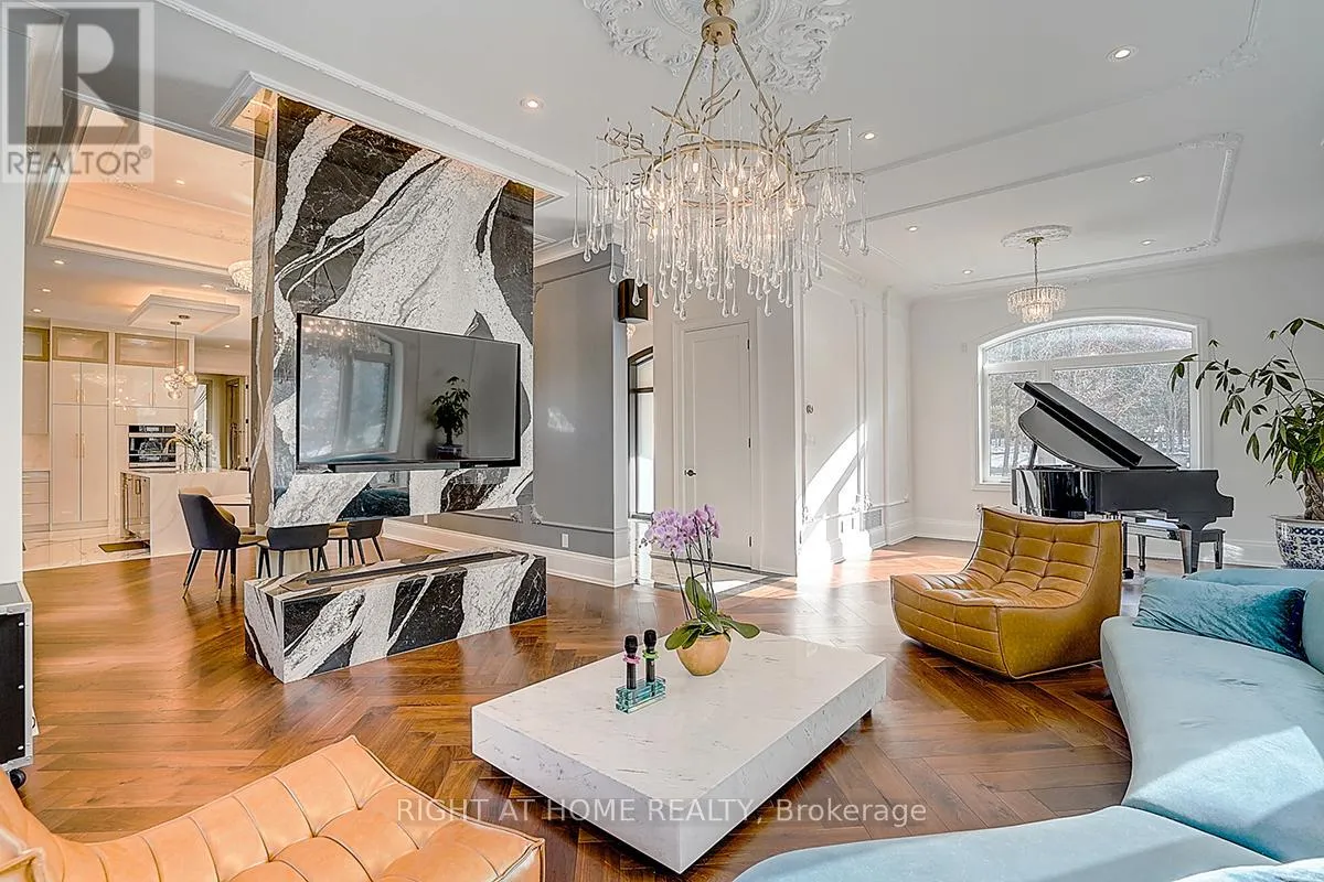 Aurora Rd & Mccowan Rare Modern French Luxury Bungalow Estate. A rare offering in today's market, this exceptional Modern French-inspired luxury bungalow redefines high-end living by seamlessly combining estate-level luxury with unparalleled everyday convenience-all on one expansive level. Set on a 2-acre private lot backing onto an endless forest, the home welcomes you with a crescent-shaped driveway and refined architectural detailing. Inside 12' ceiling (Main), solid walnut chevron flooring, custom plaster wall trims, medallion ceilings, and a dramatic floating marble TV and fireplace wall reflect timeless Modern French craftsmanship. The gourmet kitchen is fully equipped with elite appliances, including a 72" see-through Sub-Zero refrigerator and freezer, Wolf gas cooktop, and Miele built-in coffee machine, steam oven, and dishwasher-designed to elevate daily living hile supporting effortless entertaining. The main-level primary suite offers a true spa retreat, featuring a luxury ensuite bathroom with wet sauna, premium fixtures, and smart toilets that enhance comfort and hygiene throughout. An elegant entryway with floating custom cabinetry provides discreet and functional storage. What truly sets this bungalow apart is its fully developed 3,000-square-foot lower level, thoughtfully designed for both lifestyle and recreation. It includes a professional dance studio (10'), gym, walk-in temperature-controlled wine cellar, traditional wood sauna, snooker area, private Home Theater, and an additional ensuite bedroom-ensuring space for every passion without sacrificing main-floor convenience. The three-car garage features a golf simulator room and an upper loft offering exceptional flexibility. Outdoor living is elevated with a super-sized concrete rooftop deck, creating a four-season retreat surrounded by nature. An extended concrete driveway into the backyard further enhances functionality and scale. (id:27476)