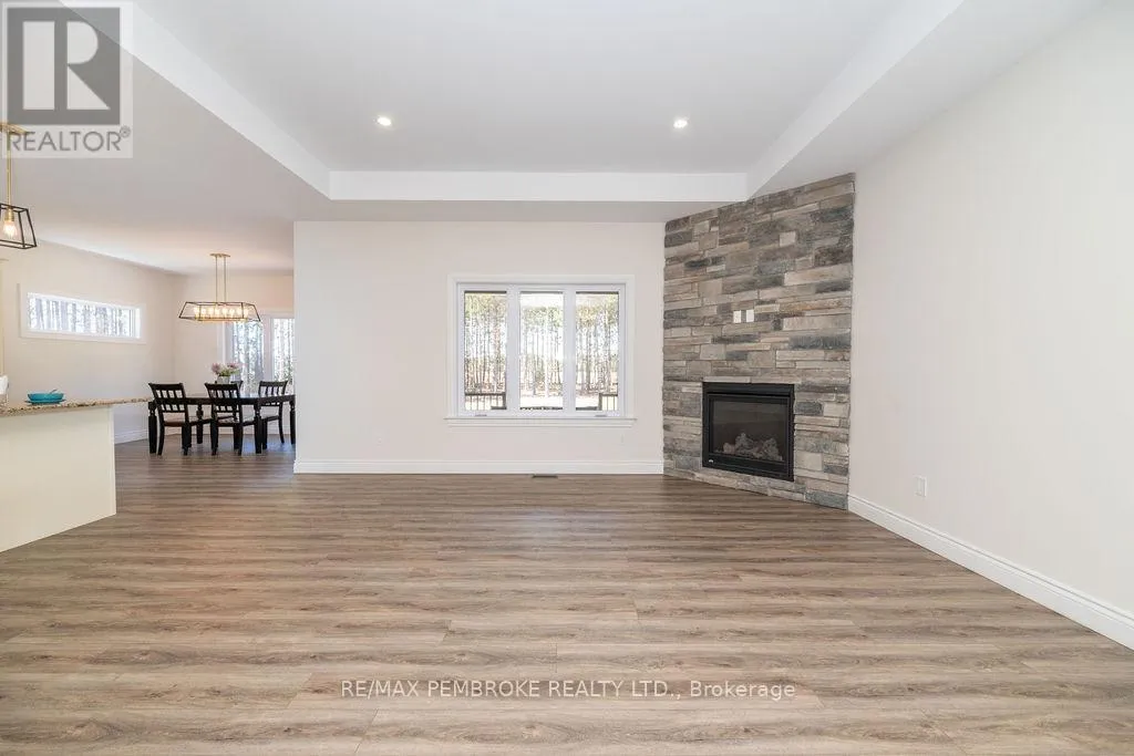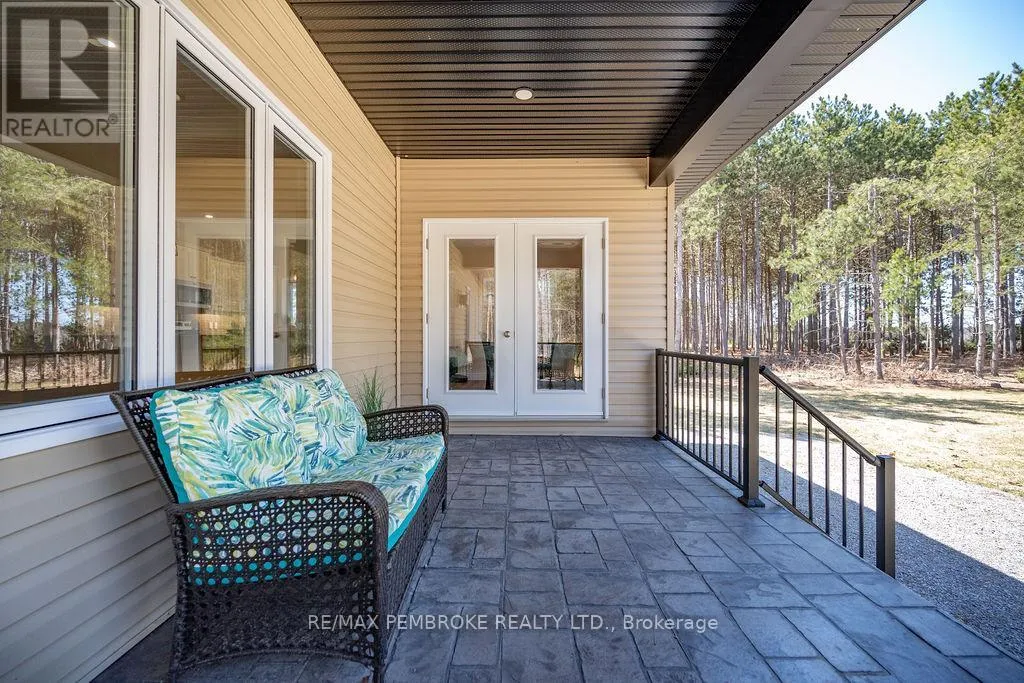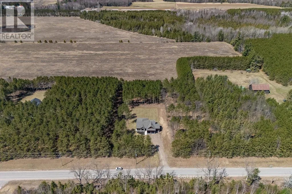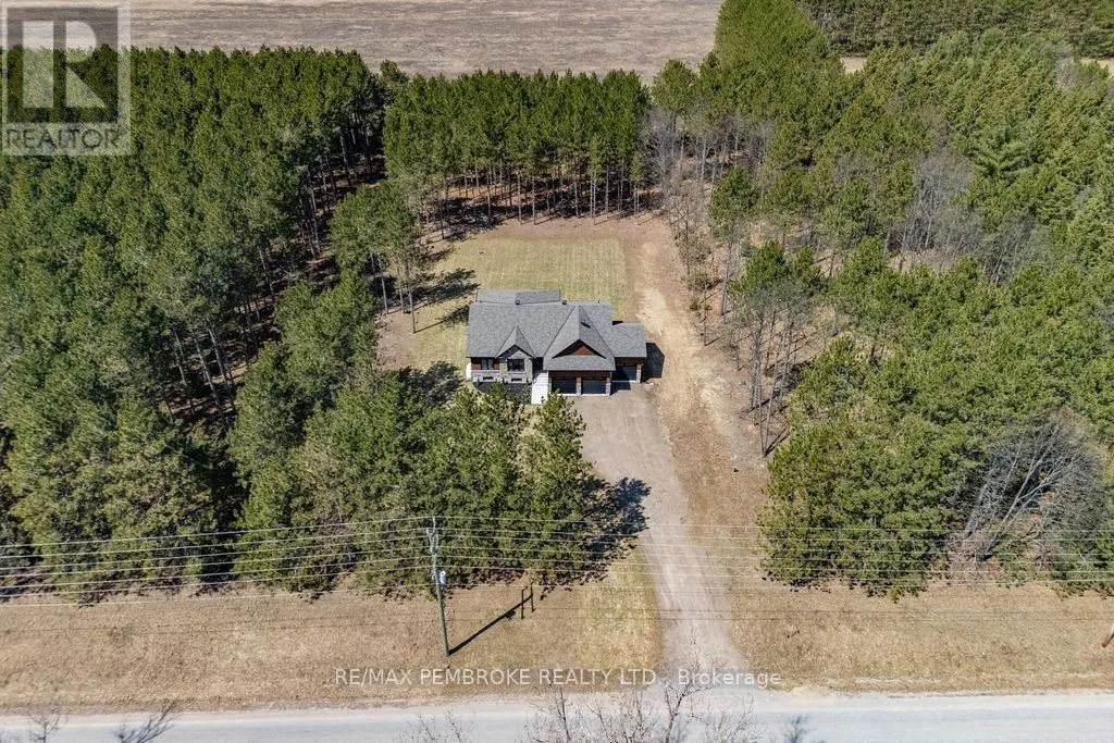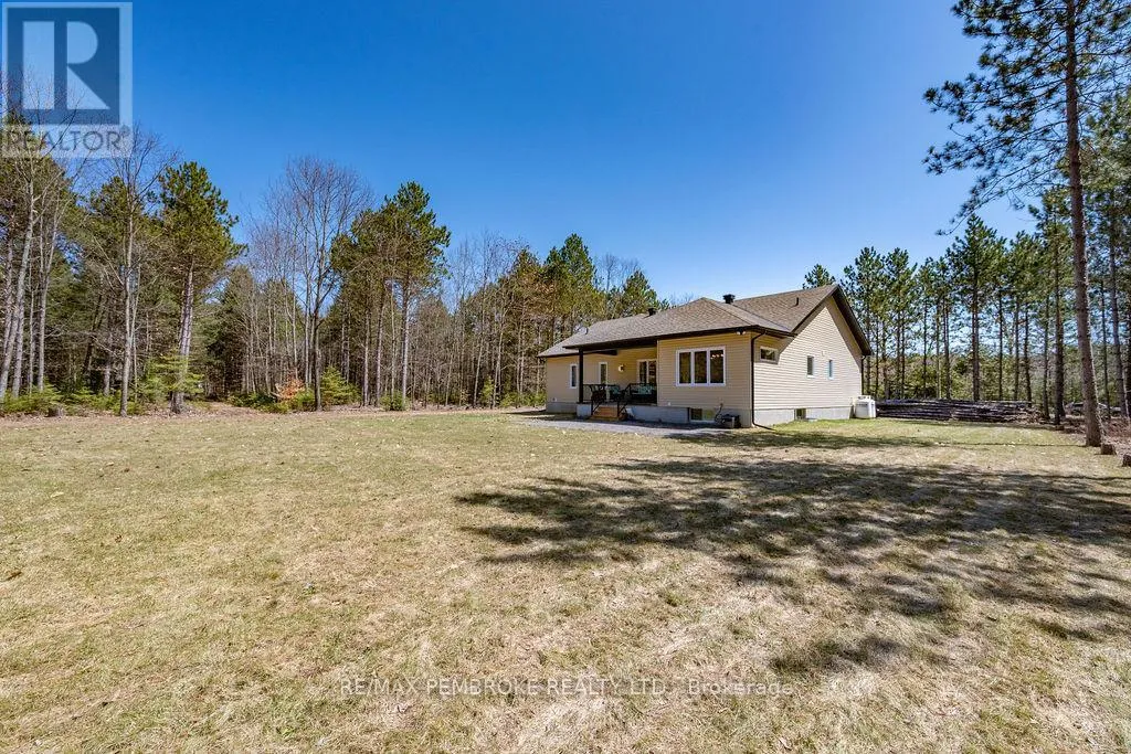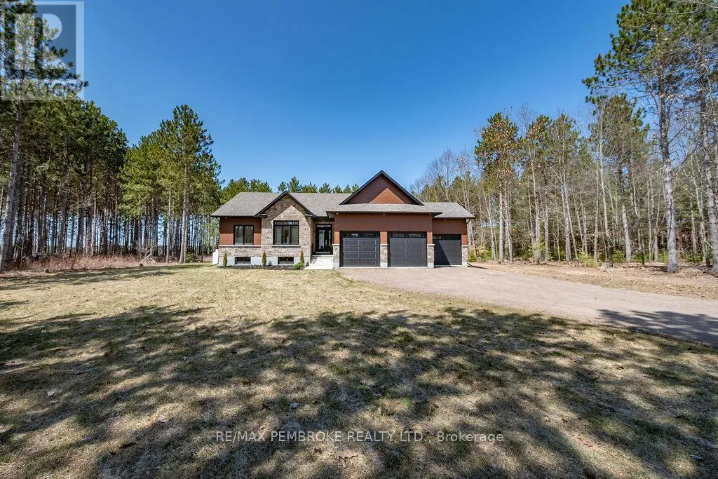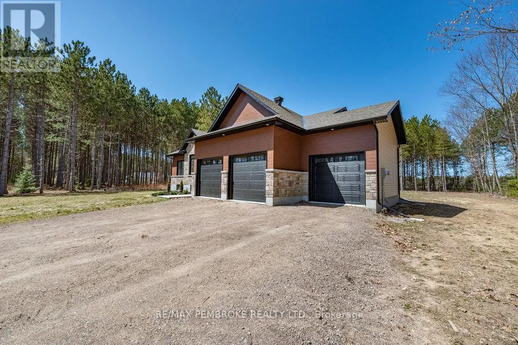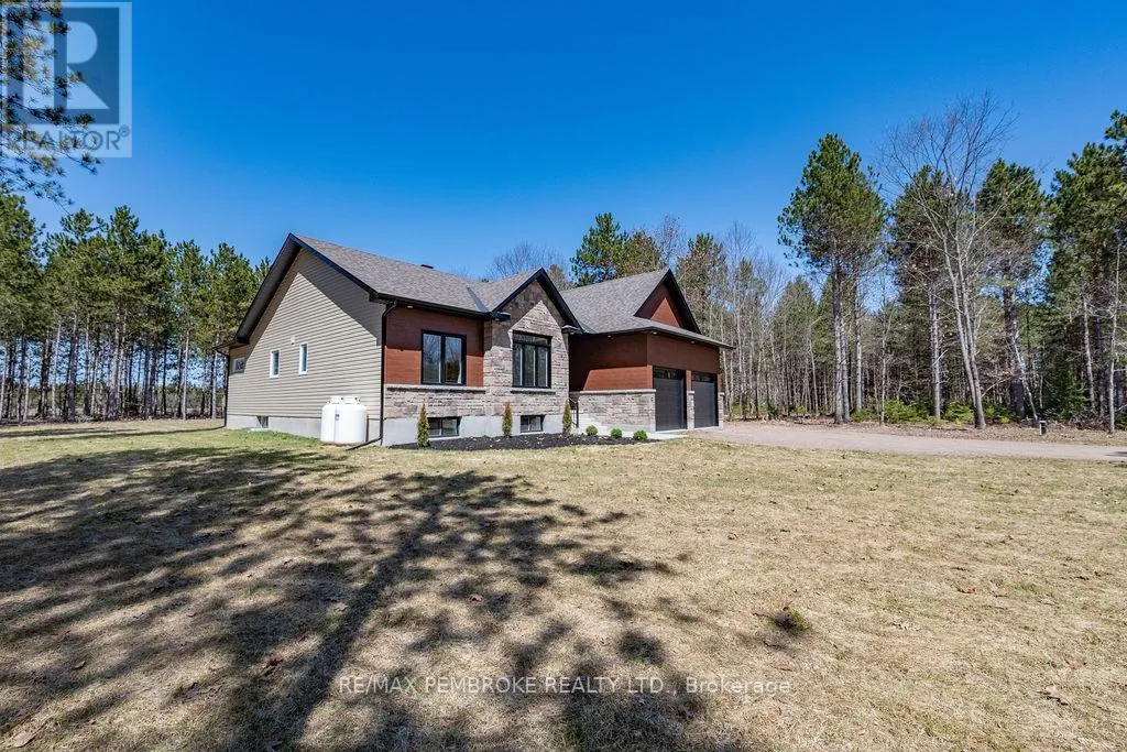 Cross Streets: Zion Line and Pappin Rd. ** Directions: Beachburg road, right on Zion Line, Left on Pappin Road. Welcome to the Gildchrist! This luxury-inspired model from award winning Legacy Homes, has it all and sits in a country setting on 3 acres only 15mins from Pembroke. Designed w space & comfort it offers 9 ceiling and flooded w natural light w an open concept floorplan featuring a spacious entry [w double closet] and access to the triple garage, living area [featuring a 10 tray ceiling & gas f/p], stunning custom kitchen [complete w a huge amount of cabinetry, U-shaped stone countertop], dining area w elegant French doors to an amazing covered porch, a luxurious primary bedroom also featuring a 10 tray ceiling, W/I closet + beautiful ensuite [w Jacuzzi, a 2-sink vanity, gorgeous custom tiled shower w additional features such as body jets and/or rain head shower], 2 additional bright bedrooms, a full 4pc bath plus main floor laundry closet finishes off the main level. The fully finished lower level is also bathed in natural light and offers a lot of additional living space. This model could easily host a granny-suite [see digitally staged photos] and still have room to spare. A large L-shaped rec rm, 3 additional bedrooms, full 4pc bath, storage closet + huge utility/storage room. The stunning exterior makes a statement w craftsman style architecture & extravagant stonework, windows, and premium board and batten siding. Many builders upgrades incl. gas furnace & oversized heat pump [to increase efficiency], Rub R Wall to exterior foundation, R60 in attic, insulated slab in basement. This little gem of a location offers community-based places of interest nearby and literally just down the road is Little Lake Mountain Biking Trails where you can park, swim & bike or hike a loop trail around the lake [and features a beautiful sand beach, benches, pavilions and washrooms]. Please see Spec Sheet for additional information on this build. Elec: $118/m[ave], Propane: $800/yr[approx]. 24hr Irrevocable on all Offers. (id:27476)
