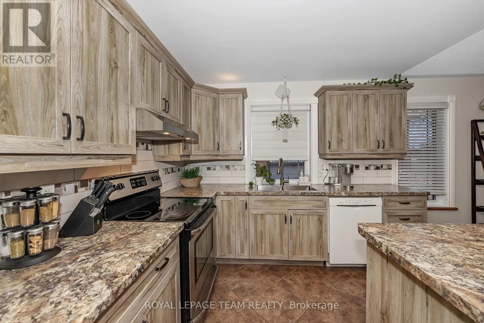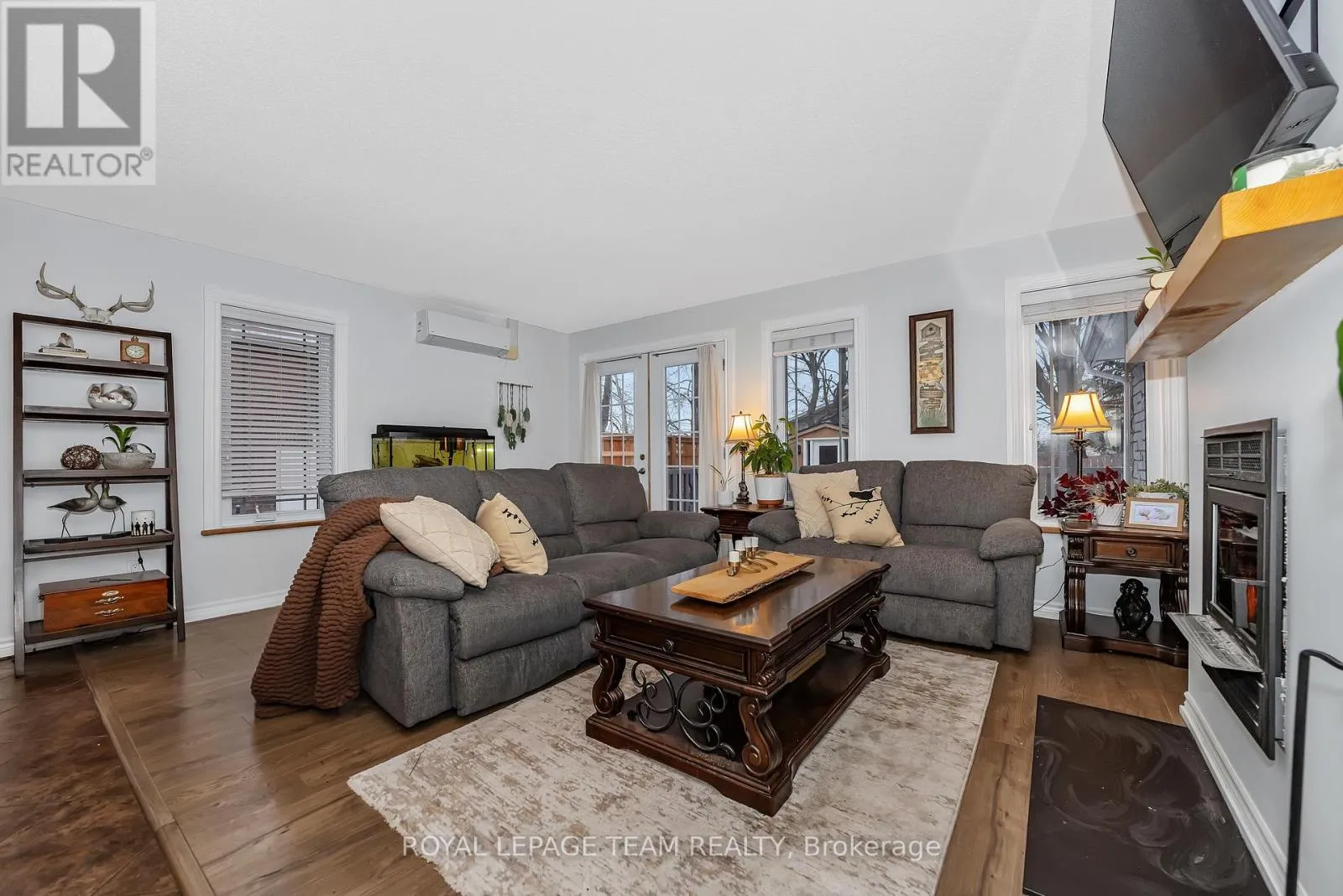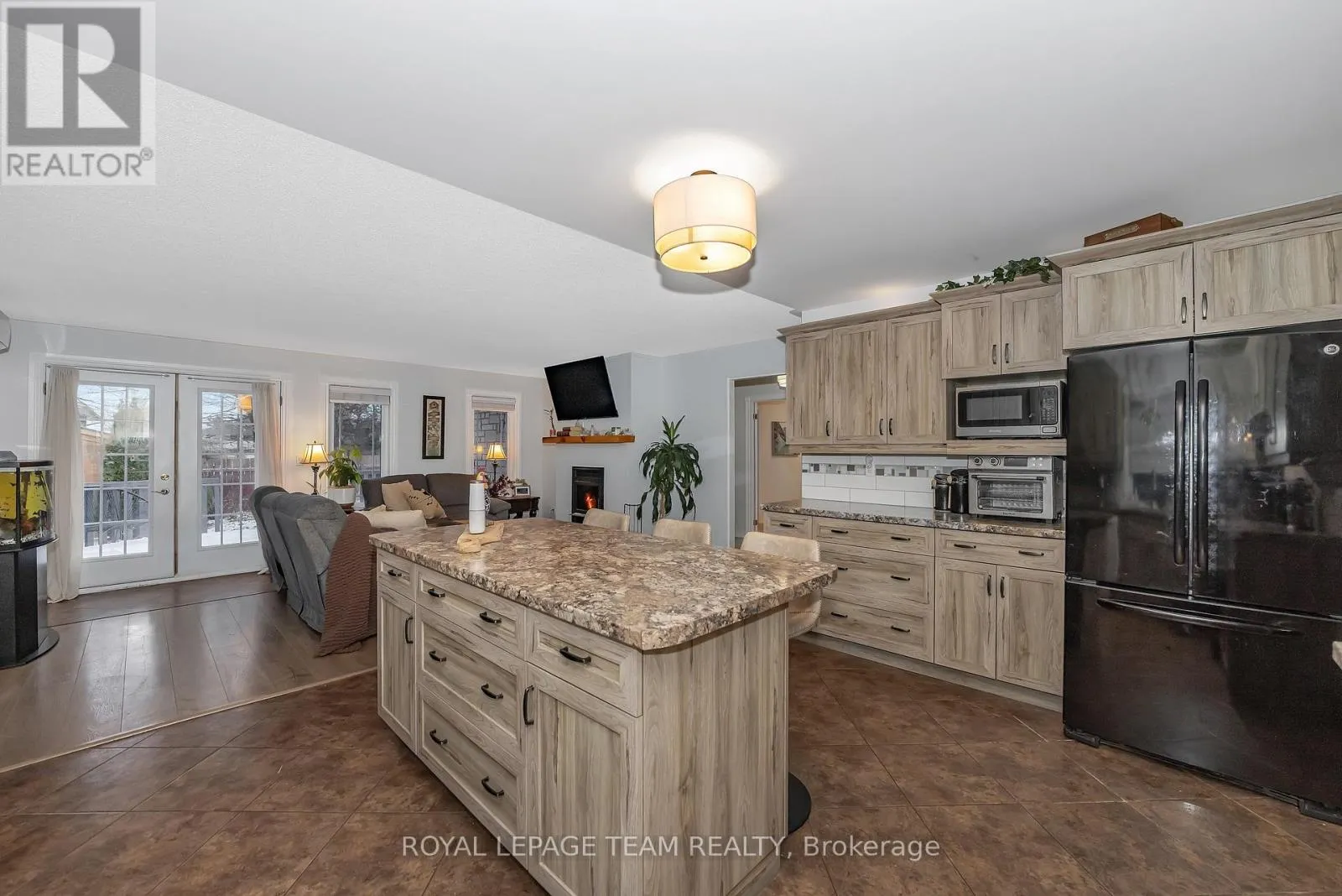 Hwy 417 to Main Street Beautiful Stone 3 Bedroom Bungalow with Lake Views and Exceptional Outdoor Living. This beautifully crafted 3 bedroom home is currently a 2 bedroom with a front office . Enjoy this 1,734 Sq Ft stone bungalow, built in 2007, exudes charm and curb appeal. The home features an oversized attached garage, a wide driveway. A welcoming covered verandah offers peaceful views of the river, while the partially fenced, private yard includes a large south-facing deck (18 x 17 ft)-perfect for relaxing or entertaining during the warmer months. Inside, enjoy one-level living with heated floors throughout and a bright, airy layout filled with natural light. The spacious foyer opens to an expansive front office/3rd bedroom with waterviews that flows into the dining room creating a perfect setting for gatherings and entertaining, kitchen with a large centre island, double sink, and abundant cabinet and counter space. The kitchen overlooks the inviting living/family room, highlighted by a WETT-certified wood-burning fireplace installed in 2025- ideal for cozy family nights . The primary bedroom features both a walk-in closet and a second closet, along with a cheater ensuite to the updated full bathroom, which includes a new tub, tile, flooring, and solid wood cabinetry, an additional spacious bedroom complete the interior layout. Recent updates include new light fixtures throughout, added privacy fencing, and a newer heat pump for efficient heating and cooling. The partially fenced yard, storage shed, and beautifully landscaped grounds complete the package. Enjoy peaceful lake views and a fantastic location close to the beach, boat launch, restaurants, golf, and highway access. (id:27476)