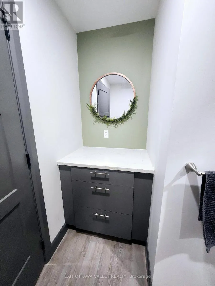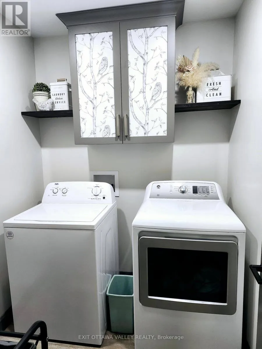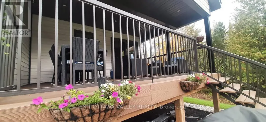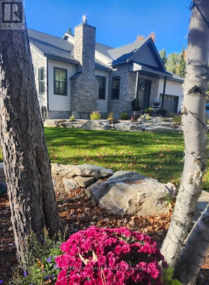 Cross Streets: Rapid Road and Gervais Road. ** Directions: From Beachburg Road Turn Left on Westmeath Road, Follow to Village. Go Straight at 4 way Stop on Rapid Road. Follow to 1485 near Gervais Road. For those who love nature and seek privacy, this newly built home in 2023 may be for you. Nestled amongst the trees on a large lot, this unique farmhouse style bungalow is beautifully landscaped with natural stones, perennials and features a stone steps to a Fibron covered porch into house. Enter through the front foyer with barn style french doors. Hang your jacket and tuck your boots away in the mudroom with shelving, hooks and bench seat. Lovely open concept main floor has a modern farmhouse feel and features Kitchen with granite counter tops, stainless steel appliances including propane range, glass tile backsplash and pantry with butcher block shelves. Dining space accommodates a larger table and seating, and living room features propane fireplace and natures view from every window. Main level also includes laundry room, 4 pc bathroom with cultured marble topped vanity, and barn board ceramic in tub, as well as 2nd bedroom with glass sliding closet doors. Finally the primary suite features walk in closet and 3pc ensuite with shower and vanity with butcher block top and vessel sink. Basement layout was designed with an older child in mind. 2 large bedrooms with a common area at the bottom of stairs. 3pc bathroom with shower and hanging vanity also features a 3x3 area home to a makeup area with marble top. Family room is sunny and has a bump out for a future fireplace. Garage is drywalled and insulated with mezzanine storage and Fibron step with Regal Railing into house. Your favourite spot to sit will be the covered deck at the back with Fibron decking, Regal Railing metal railing and flush mounted lighting. It has a great view of the yard and flag stone patio below, custom shed and garden area with raised beds. House also features Generlink which connects to any portable generator, front interlocking stone path way and tons of parking. Only 20 minutes to Pembroke! Come check out country living! (id:27476)