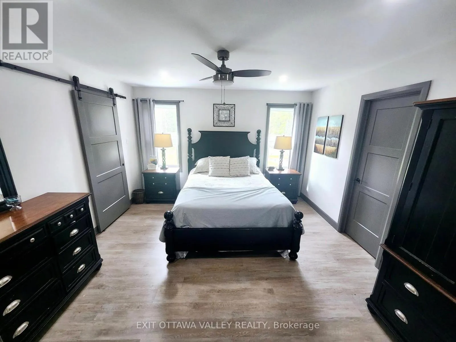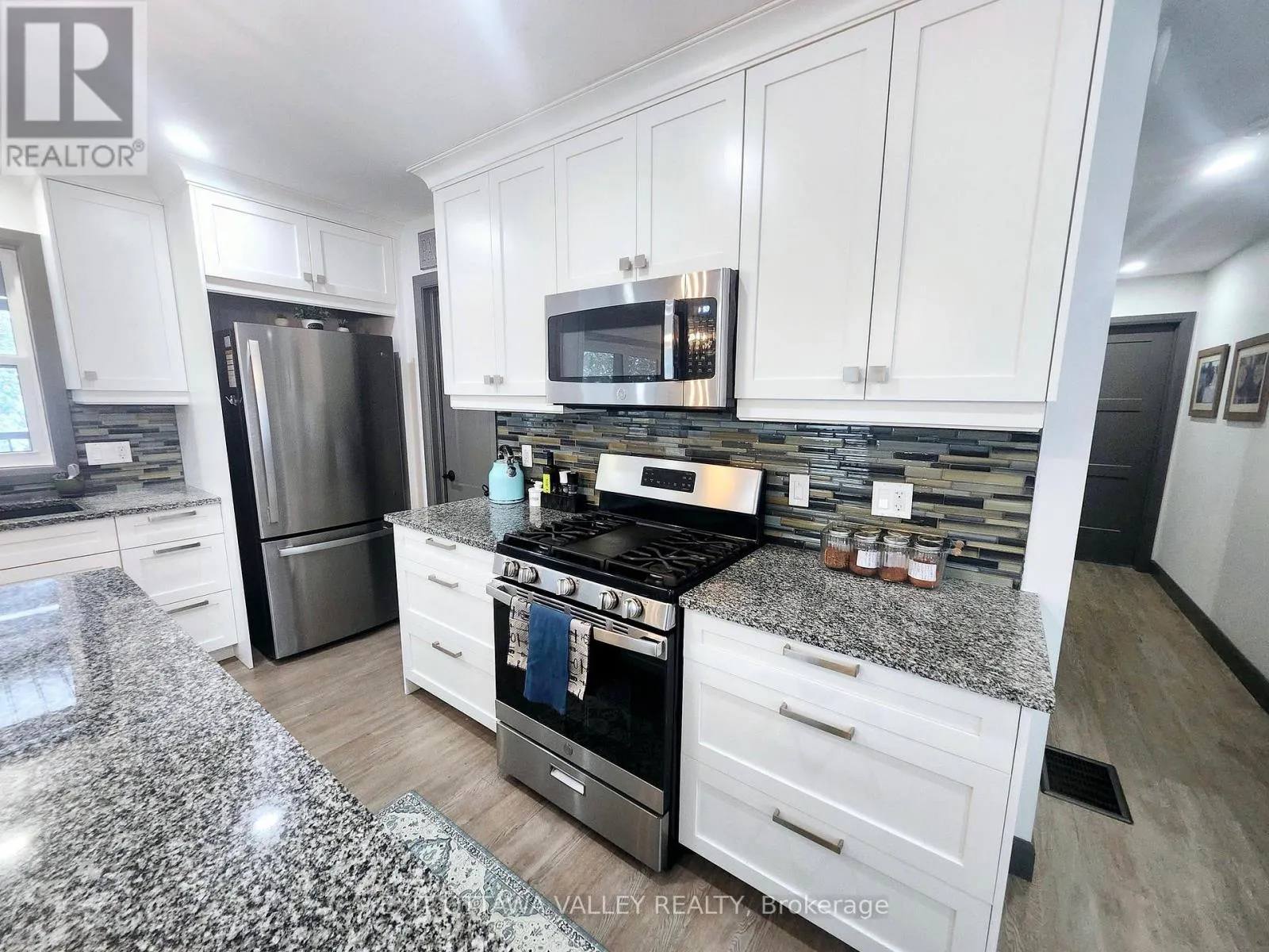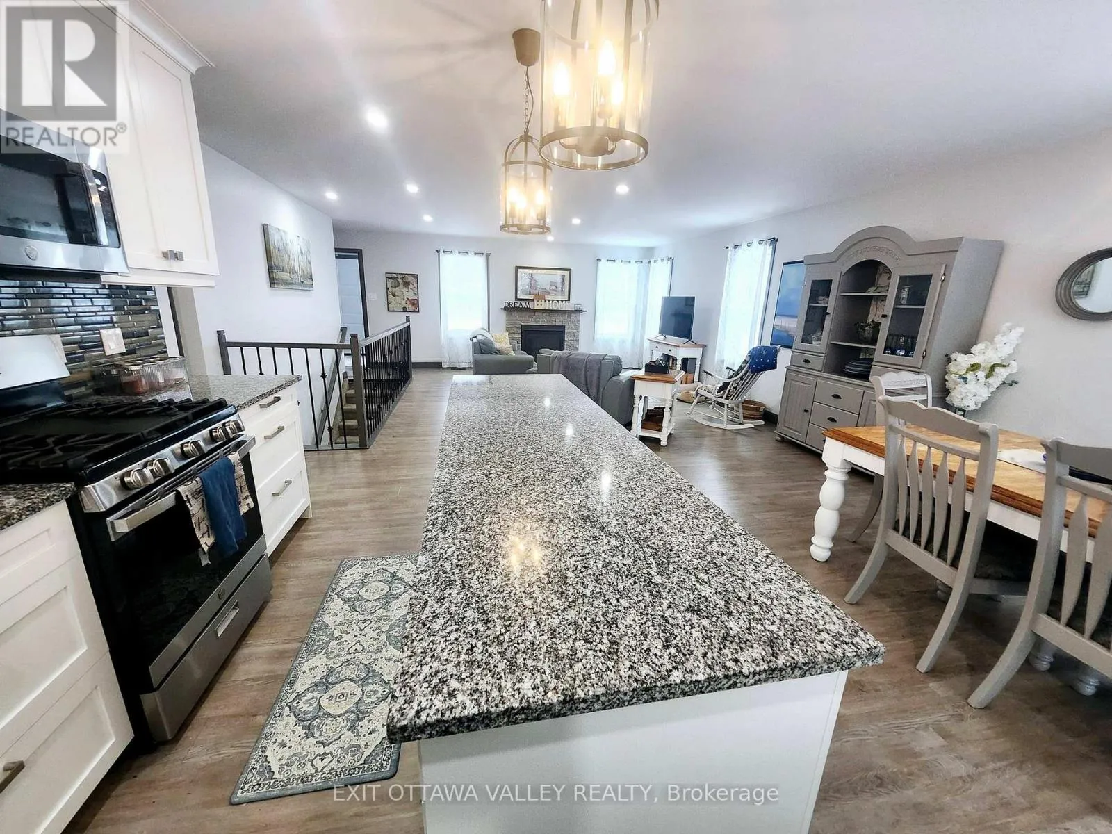 Cross Streets: Rapid Road and Gervais Road. ** Directions: From Beachburg Road Turn Left on Westmeath Road, Follow to Village. Go Straight at 4 way Stop on Rapid Road. Follow to 1485 near Gervais Road. For those who love nature and seek privacy, this newly built home in 2023 may be for you. Nestled amongst the trees on a large lot, this unique farmhouse style bungalow is beautifully landscaped with natural stones, perennials and features a stone steps to a Fibron covered porch into house. Enter through the front foyer with barn style french doors. Hang your jacket and tuck your boots away in the mudroom with shelving, hooks and bench seat. Lovely open concept main floor has a modern farmhouse feel and features Kitchen with granite counter tops, stainless steel appliances including propane range, glass tile backsplash and pantry with butcher block shelves. Dining space accommodates a larger table and seating, and living room features propane fireplace and natures view from every window. Main level also includes laundry room, 4 pc bathroom with cultured marble topped vanity, and barn board ceramic in tub, as well as 2nd bedroom with glass sliding closet doors. Finally the primary suite features walk in closet and 3pc ensuite with shower and vanity with butcher block top and vessel sink. Basement layout was designed with an older child in mind. 2 large bedrooms with a common area at the bottom of stairs. 3pc bathroom with shower and hanging vanity also features a 3x3 area home to a makeup area with marble top. Family room is sunny and has a bump out for a future fireplace. Garage is drywalled and insulated with mezzanine storage and Fibron step with Regal Railing into house. Your favourite spot to sit will be the covered deck at the back with Fibron decking, Regal Railing metal railing and flush mounted lighting. It has a great view of the yard and flag stone patio below, custom shed and garden area with raised beds. House also features Generlink which connects to any portable generator, front interlocking stone path way and tons of parking. Only 20 minutes to Pembroke! Come check out country living! (id:27476)