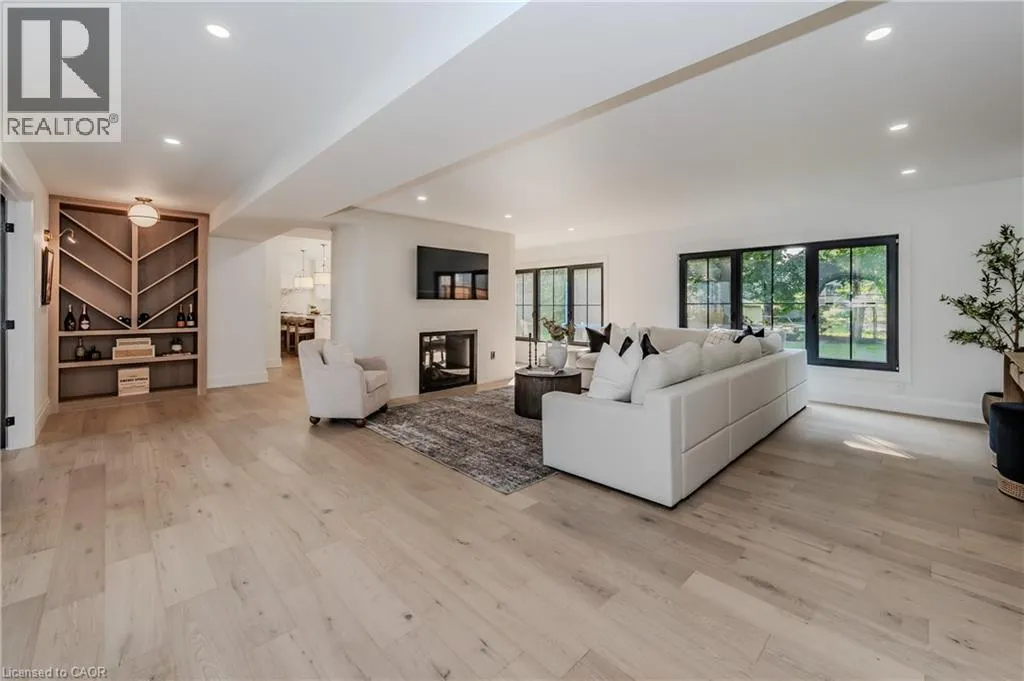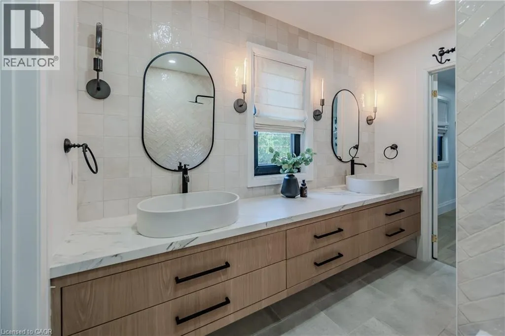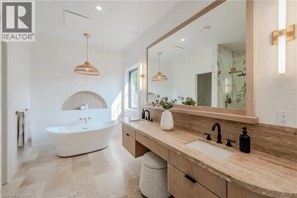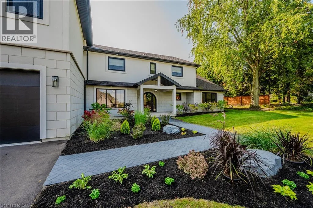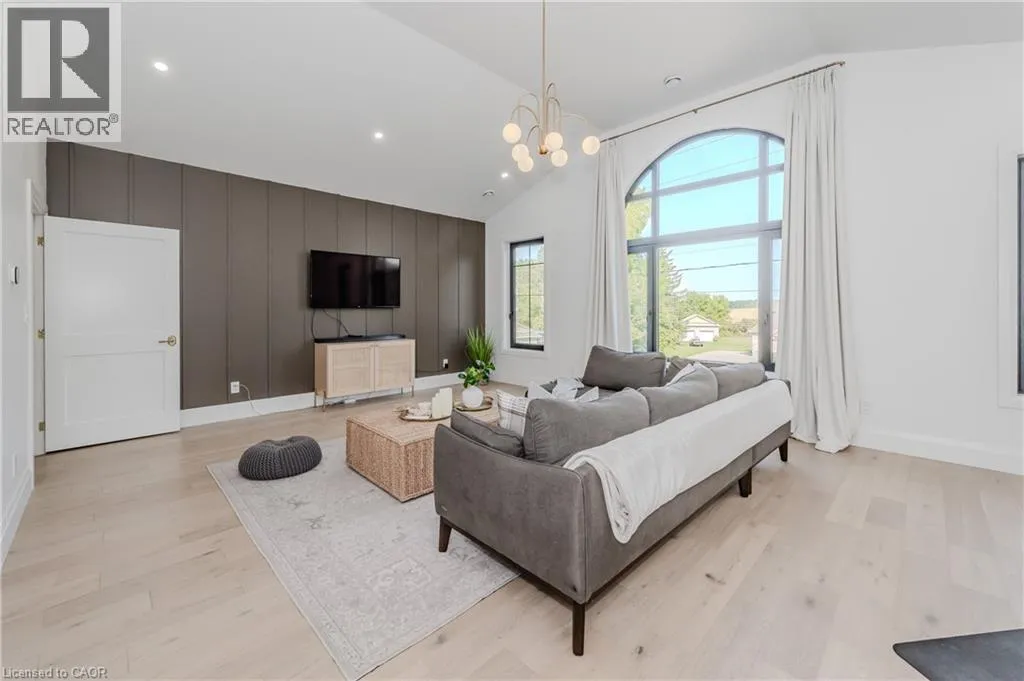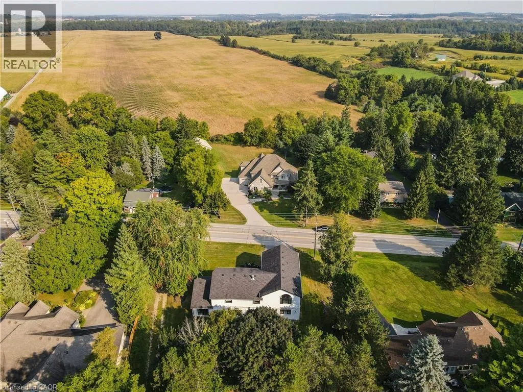 Erbs Road to Queen Street to Bleams Road Welcome to a newly constructed luxury estate with over 6,500 sq ft of professionally designed space on a rare 107 Ã 146 ft private lot, minutes from Kitchener-Waterloo. Built in 2023 and curated by Lush Designs, this architectural residence blends timeless European-inspired design with modern family functionality â delivering a level of craftsmanship and scale rarely available in the region. From the moment you enter, soaring ceilings, expansive sightlines, and oversized triple-glazed European windows create an atmosphere of light, openness, and luxury. The main level is designed for both elegant entertaining and everyday living, featuring a grand open-concept layout anchored by a striking double-sided Roman clay fireplace connecting the living and dining spaces. The chefâs kitchen is a showpiece, complete with custom white oak cabinets, a 10-ft double waterfall porcelain island, paneled high-end appliances, walk-in prep pantry, and a designer range â seamlessly blending beauty with performance. Upstairs, the home offers a spacious and thoughtfully designed second level with five large bedrooms, each with ensuite access, a luxurious primary retreat featuring cathedral ceilings, fireplace, spa-like ensuite, and a generous walk-in closet. A bonus flex living area provides space for a family lounge, home gym, or office. The fully finished lower level adds over 1,600 sq ft of additional space, including a media zone, wet bar, guest area, and flexible recreation spaces â ideal for multi-generational living/entertaining. Set on a premium lot with a long private driveway, double garage, and room for outdoor amenities such as a pool or cabana, this property offers a combination of estate-style privacy with unmatched proximity to urban conveniences, minutes from Highway 7/8, shopping, universities, and Waterlooâs tech hub. A truly exceptional offering for buyers seeking space, design excellence, and long-term value in one of the regionâs most desirable locations. (id:27476)