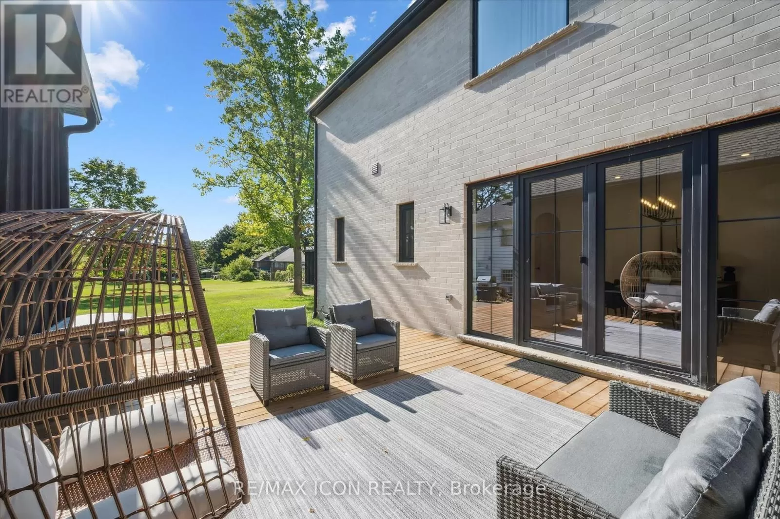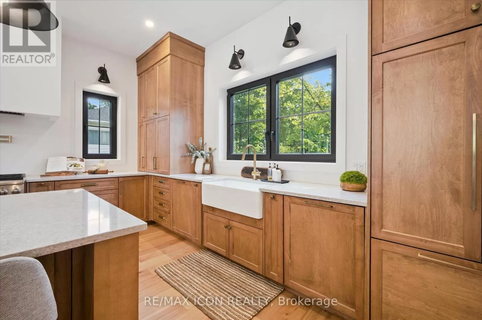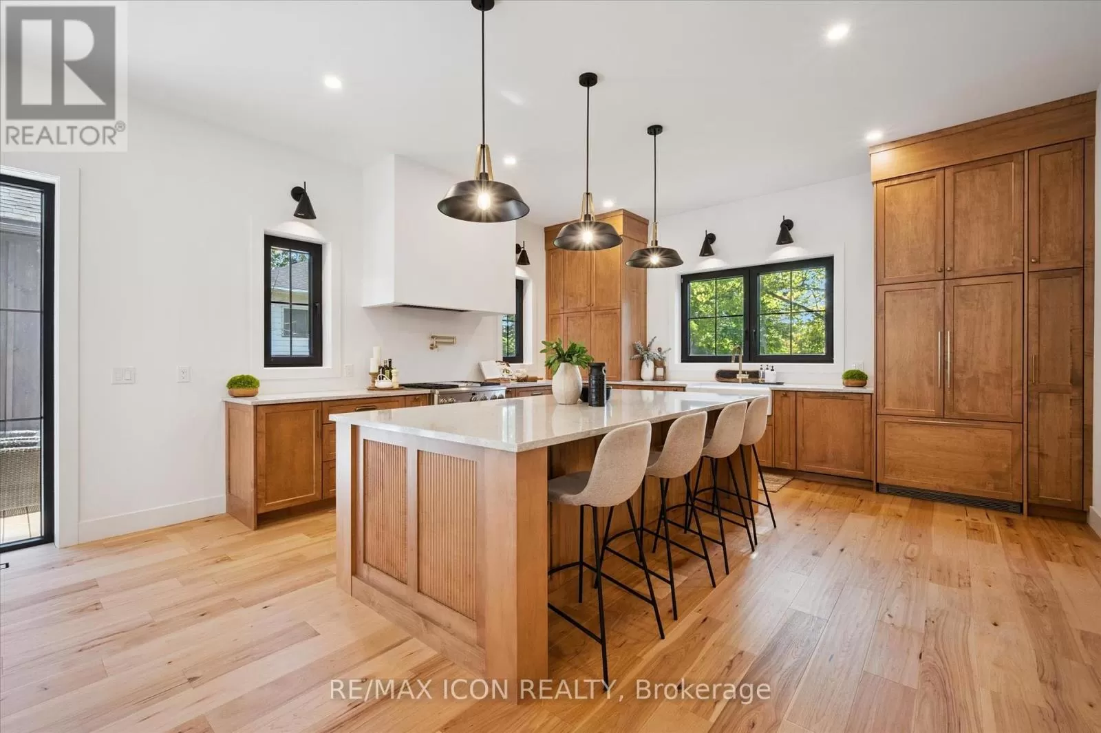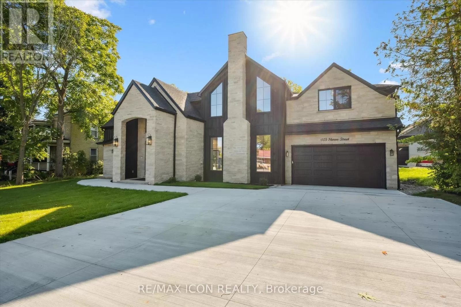 Cross Streets: Huron & Waterloo St. ** Directions: Peel St. left onto Huron. Welcome to 413 Huron Road in charming New Hamburg! A truly exceptional 5-bedroom, 4-bathroom home offering over 4,400 sq. ft. of finishedliving space, where thoughtful design meets high-end finishes and timeless craftsmanship. The exterior blends timeless materials like stone,brick, and barn board for a striking curb appeal, complemented by a concrete driveway with integrated drainage and underground downspoutmanagement. Inside, the home is flooded with natural light thanks to oversized Raven European tilt/turn windows, which beautifully highlight theneutral tones, organic finishes, and natural hickory engineered hardwood throughout. The heart of the home is the handcrafted maple kitchenand adjoining butlers pantry, featuring a Monogram gas oven/range, built-in 36 Fisher & Paykel fridge and dishwasher, an apron sink, andample storage, ideal for everyday living and entertaining alike. A separate entrance leads to a private granny flat, perfect for multi-generationalliving or guests. Comfort is maximized with multi-zone climate control, a hot water recirculation line for instant hot water to the second-floorbathrooms, and a large Lennox natural gas fireplace for cozy evenings. Additional features include a custom vanity in the foyer bath, VIGOfaucets, Red Oak stairs, and a master suite boasting oversized windows and Italian tile finishes. The home is equipped with a 200 AMP electricalpanel, water softener, and plenty of storage including a large shed. Outside, enjoy an incredible entertaining space with a wood deck and anexpansive grass area set on 3/4 acre in town perfect for relaxing or hosting gatherings. This is a rare blend of luxury, functionality, andthoughtful design in a peaceful, sought-after location. (id:27476)