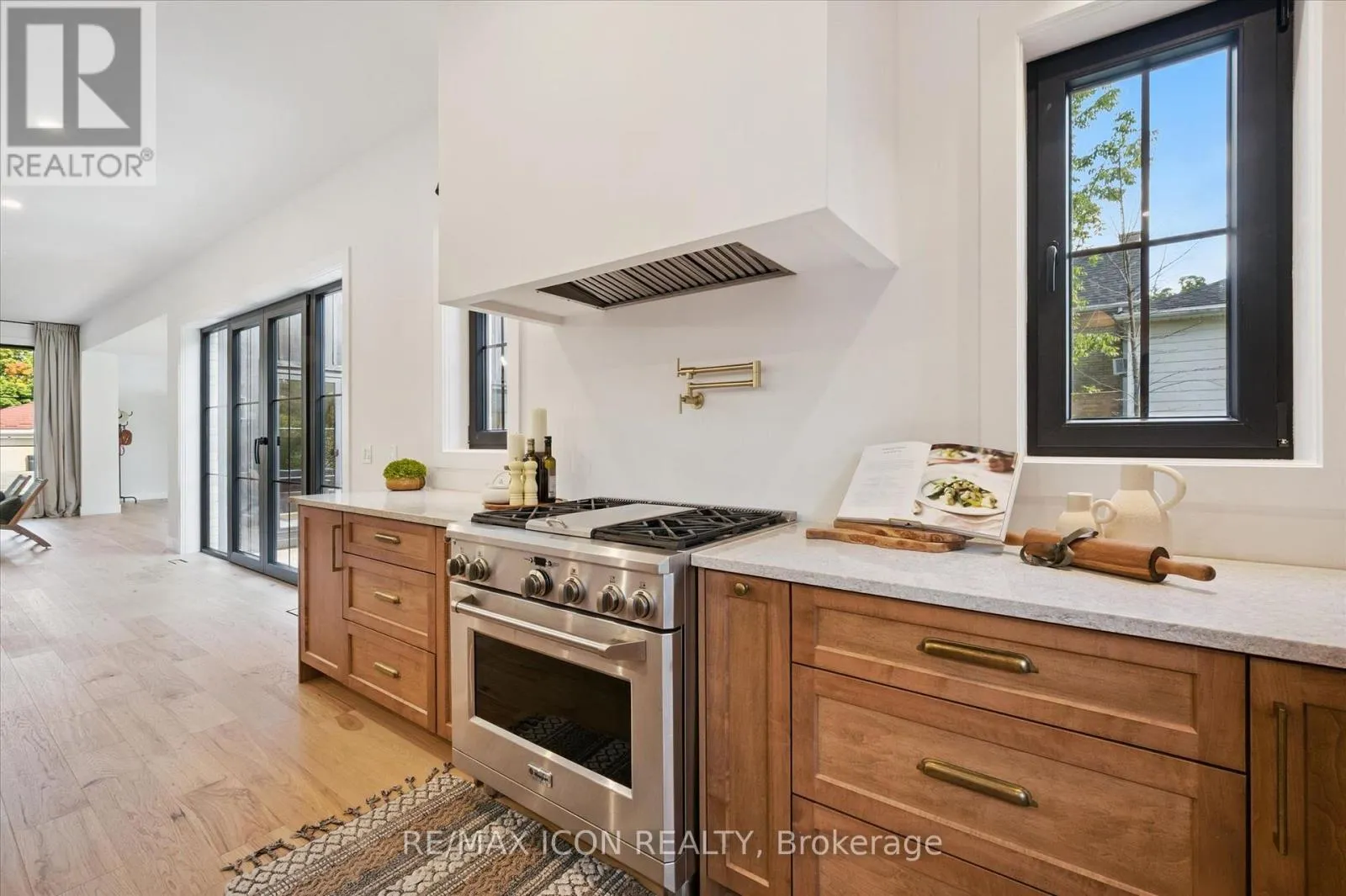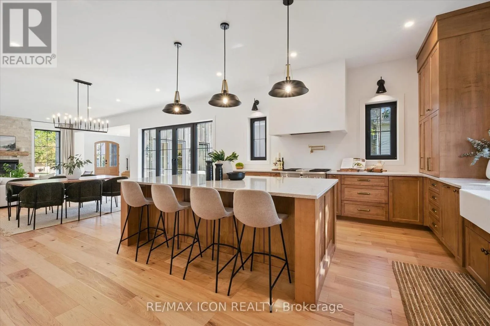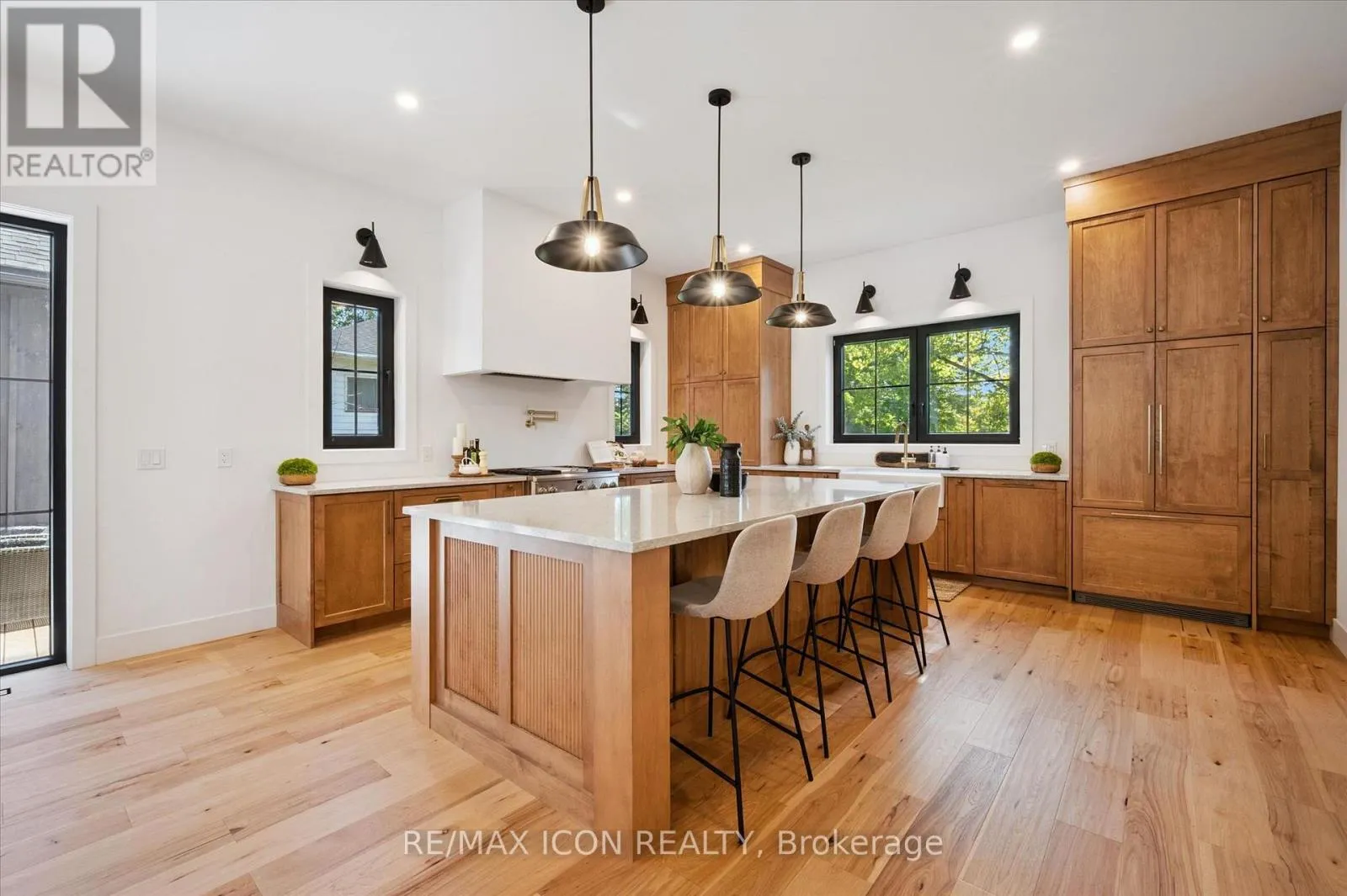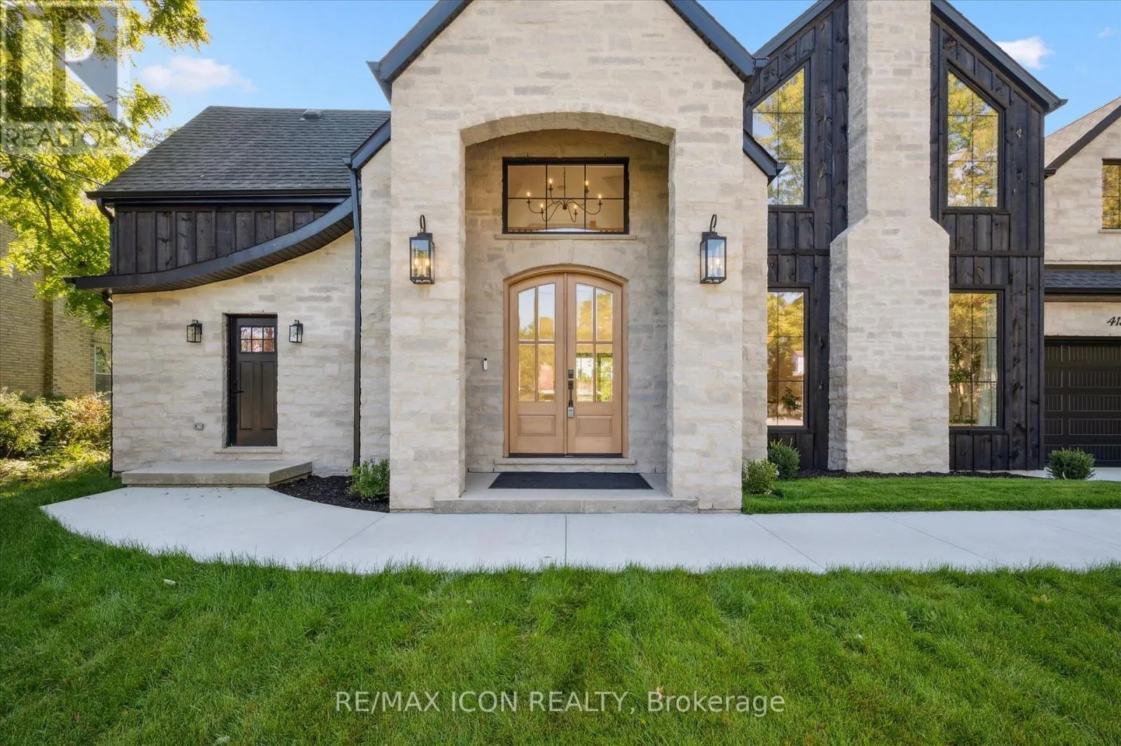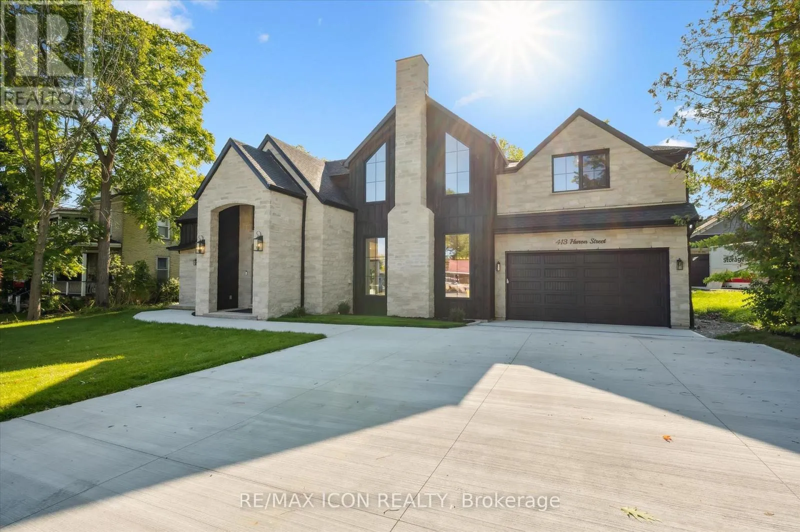 Cross Streets: Huron & Waterloo St. ** Directions: Peel Street to Huron Street. Welcome to 413 Huron Road in charming New Hamburg! A truly exceptional 5-bedroom, 4-bathroom home offering over 4,400 sq. ft. of finishedliving space, where thoughtful design meets high-end finishes and timeless craftsmanship. The exterior blends timeless materials like stone,brick, and barn board for a striking curb appeal, complemented by a concrete driveway with integrated drainage and underground downspoutmanagement. Inside, the home is flooded with natural light thanks to oversized Raven European tilt/turn windows, which beautifully highlight theneutral tones, organic finishes, and natural hickory engineered hardwood throughout. The heart of the home is the handcrafted maple kitchenand adjoining butler's pantry, featuring a Monogram gas oven/range, built-in 36" Fisher & Paykel fridge and dishwasher, an apron sink, andample storage, ideal for everyday living and entertaining alike. A separate entrance leads to a private granny flat, perfect for multi-generationalliving or guests. Comfort is maximized with multi-zone climate control, a hot water recirculation line for instant hot water to the second-floorbathrooms, and a large Lennox natural gas fireplace for cozy evenings. Additional features include a custom vanity in the foyer bath, VIGOfaucets, Red Oak stairs, and a master suite boasting oversized windows and Italian tile finishes. The home is equipped with a 200 AMP electricalpanel, water softener, and plenty of storage including a large shed. Outside, enjoy an incredible entertaining space with a wood deck and anexpansive grass area set on 3/4 acre in town perfect for relaxing or hosting gatherings. This is a rare blend of luxury, functionality, andthoughtful design in a peaceful, sought-after location. (id:27476)