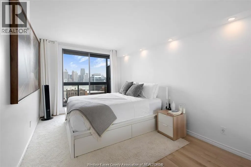 Soaring above the city on the 18th floor, this fully renovated 1-bedroom condo combines luxury, convenience, and unbeatable views of the Detroit skyline. The open-concept design features a bright and spacious living and dining area, a sleek modern kitchen, and two private balconies â including one off the primary bedroom â for the ultimate indoor-outdoor lifestyle. This executive unit also includes underground parking and a storage locker. Enjoy resort-style living with building amenities such as an indoor pool, gym, sauna, party room, and 24-hour security. Located in the heart of Windsor, youâll be steps from shops, restaurants, the waterfront, and transit. Perfect for professionals, students, and commuters seeking a move-in-ready home with style and comfort. Call today for a private showing. (id:27476)