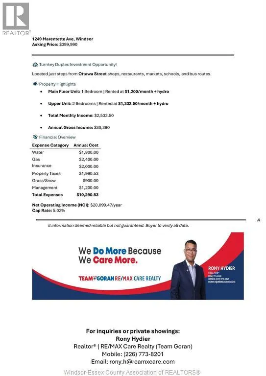 Welcome to 1249 Marentette Ave, Windsorâa charming duplex featuring two self-contained units, one 1-bedroom and one 2-bedroom, making it an ideal investment or live-in/rent-out opportunity. Each unit includes its own kitchen, dining, living area, 4-piece bathroom, and comes equipped with appliances (two refrigerators, two stoves, washer, and dryer) for a turnkey experience. Situated on a 30 ft x 106 ft lot in a desirable neighborhood near Ottawa Street Village, residents can enjoy boutique shops, dining, bakeries, grocery stores, seasonal markets, and cultural festivals just steps away, with downtown Windsor, riverfront parks, and Caesars Windsor Casino minutes from the door. Families and professionals will appreciate nearby schools, parks, and recreation, while commuters benefit from easy access to major transit routes and cross-border connections via the tunnel or bridge. With strong rental appeal, low property taxes, and excellent income potential, this duplex is a versatile option for investors or those looking to offset living costs. (id:27476)