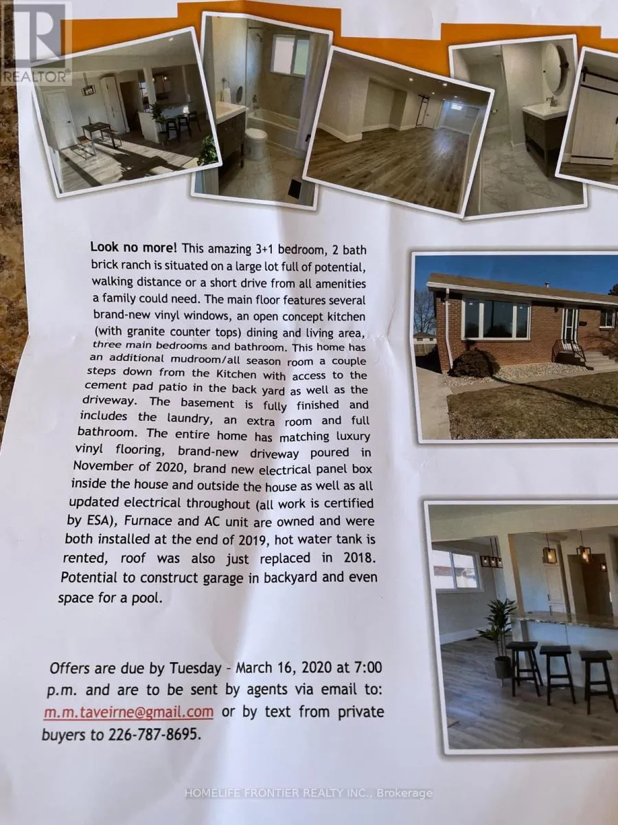 Cross Streets: Rivard Ave & Tecumseh Road East. ** Directions: Through Front door. Beautifully updated 3+1 bedroom, 2-bath brick bungalow on a large lot in a convenient, family-friendly area-walk or a short drive to shops, schools, parks, and amenities. Bright main floor with several newer vinyl windows and an open-concept kitchen/dining/living space with granitecounters. Three generous bedrooms and a 4-pc bath on the main level. Off the kitchen, a handy mudroom/all-season room steps out to a concrete patio and the driveway-great for everyday entry. Fully finished lower level offers a versatile rec room, laundry, an additional room (ideal as a4th bedroom/office), and a full bathroom. Consistent luxury vinyl flooring throughout. Major updates include: new concrete driveway (2020), updated electrical with new interior/exterior panels and ESA-certified wiring, furnace & A/C (both 2019), and roof (2018). Ample driveway, parking, and a spacious backyard. (id:27476)