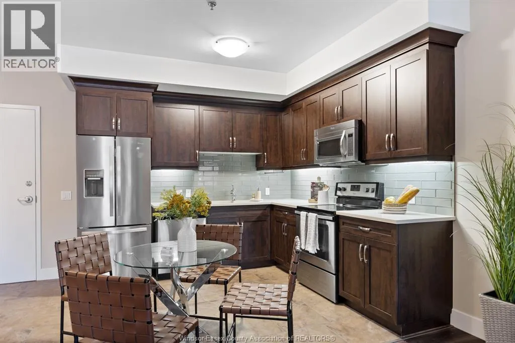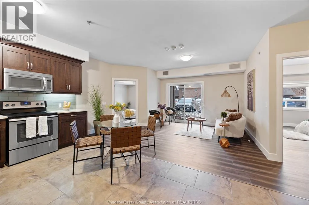Welcome to Rivertown Terrace, a signature Valente Development Corporation community in the heart of East Windsor/Riverside. This inviting 2-bed, 2-bath condo blends comfort, style, and convenience with a bright open-concept layout, 9ft ceilings, and a spacious private balcony. The gourmet kitchen features stainless steel appliances, recessed shaker-style cabinetry, and a generous eating area perfect for everyday dining. The primary suite offers a generous closet and direct access to a well-appointed bathroom. Additional highlights include in-suite laundry, a roomy utility area with extra storage, and thoughtful upgrades throughout. Just steps from parks, restaurants, shops, and the waterfront-enjoy modern, low-maintenance living at its finest. (id:27476)