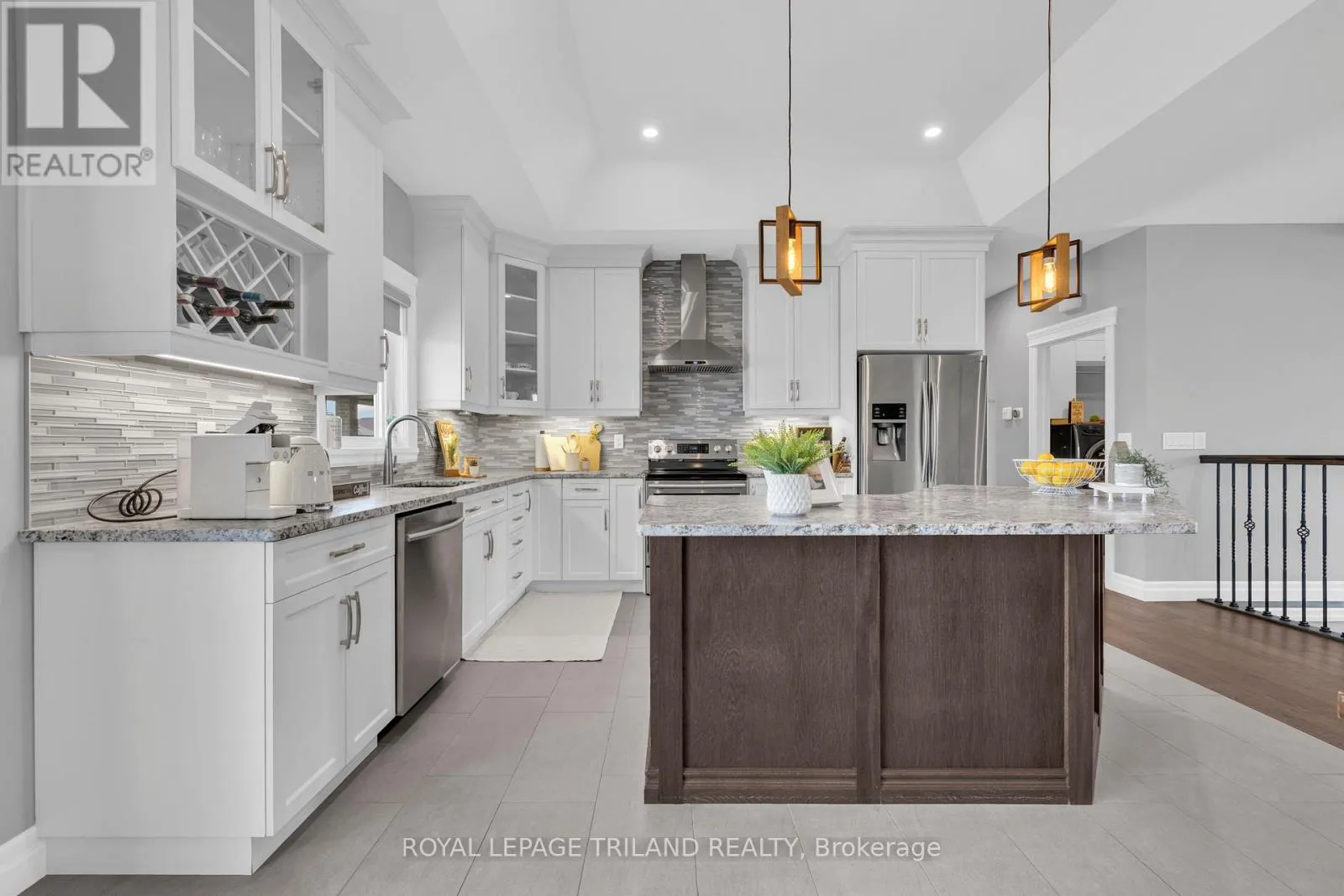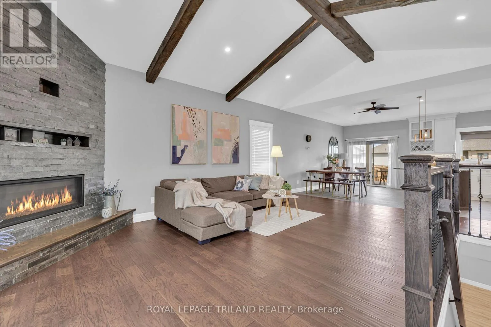 Cross Streets: Summer Street. ** Directions: Broadway Street west bound, turn right to Spring Street. Beautiful 3+2 bedroom, 3 bathroom raised bungalow in desirable Lakeshore! Step into this stunning home through the enclosed front porch and be welcomed by the open concept main floor that exudes both elegance and warmth. Soaring ceiling enhance the grand atmosphere, while the exposed wood beams add a rustic yet sophisticated charm. A stone-accented fireplace create a cozy focal point in the spacious living area. The stylish white kitchen is a chef's dream, featuring granite countertops, quality appliances, and a beautiful backsplash that elevates the space. On the main floor, you will find two generously sized bedrooms, a full bathroom, and a convenient laundry area for added convenience. Upstairs, a unique loft design hosts the private primary bedroom complete with a luxurious ensuite, offering a peaceful retreat from daily life. Step out through the kitchen patio doors to backyard, complete with a covered porch and deck perfect for hosting BBQs and enjoying outdoor gatherings with family and friends. The fully finished lower lever offers two additional bedrooms, a full bathroom, and an oversize family room. A custom wet bar adds the perfect touch for entertaining guests in style. This house simply has all. Ready to move in. (id:27476)