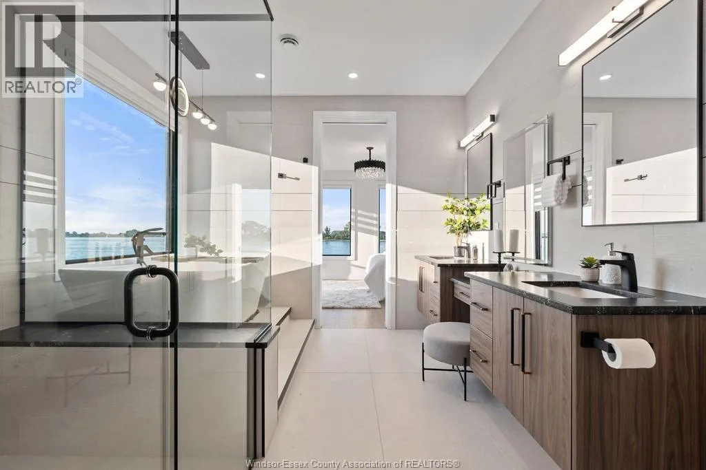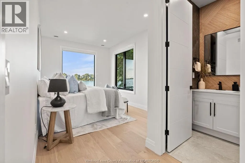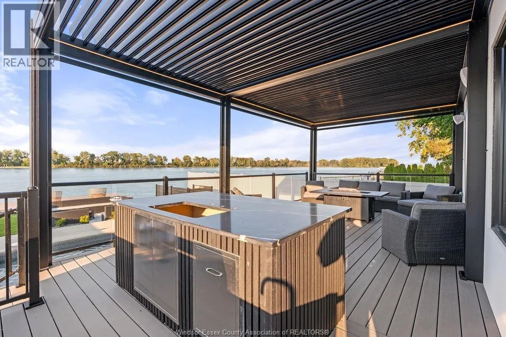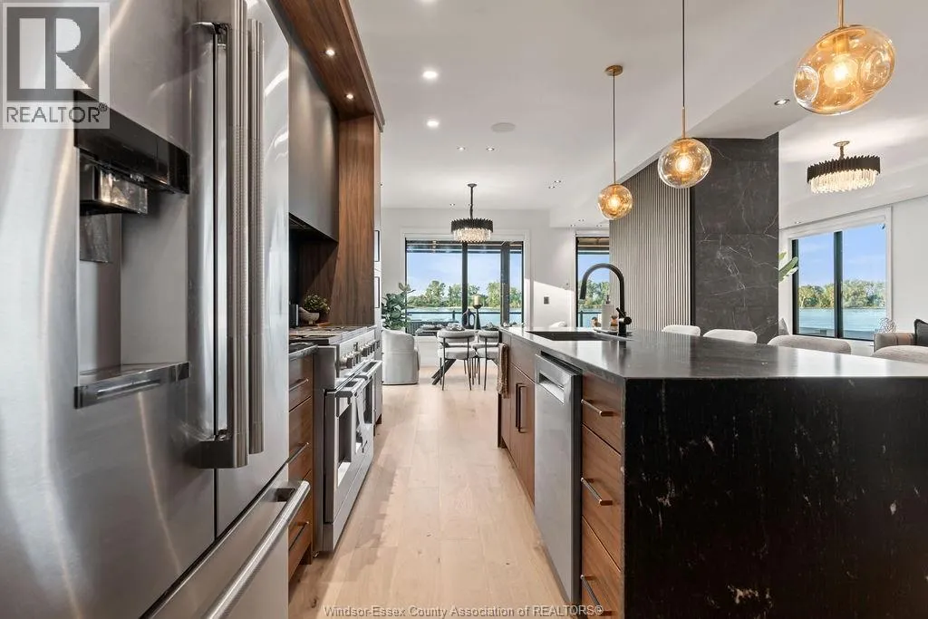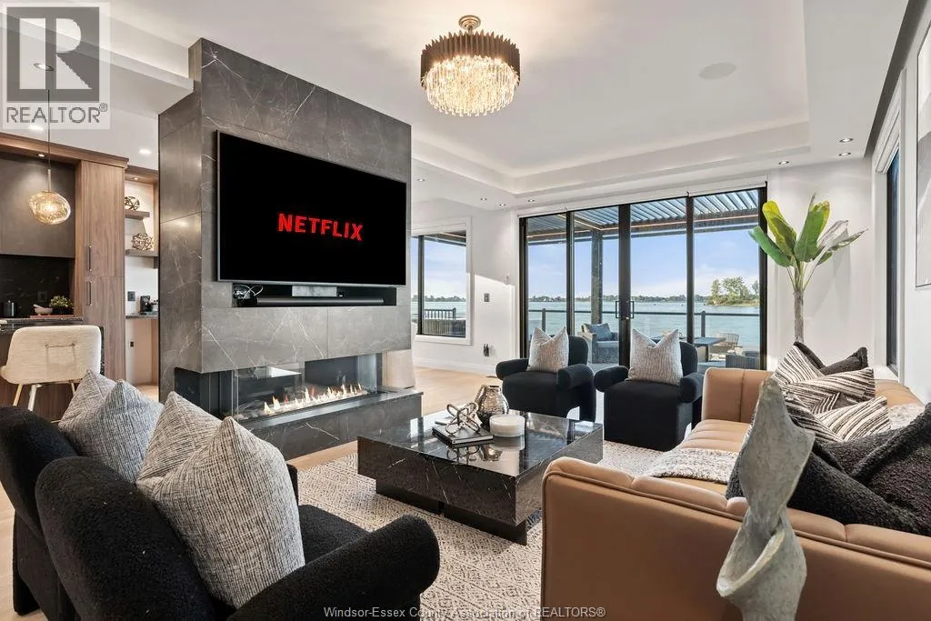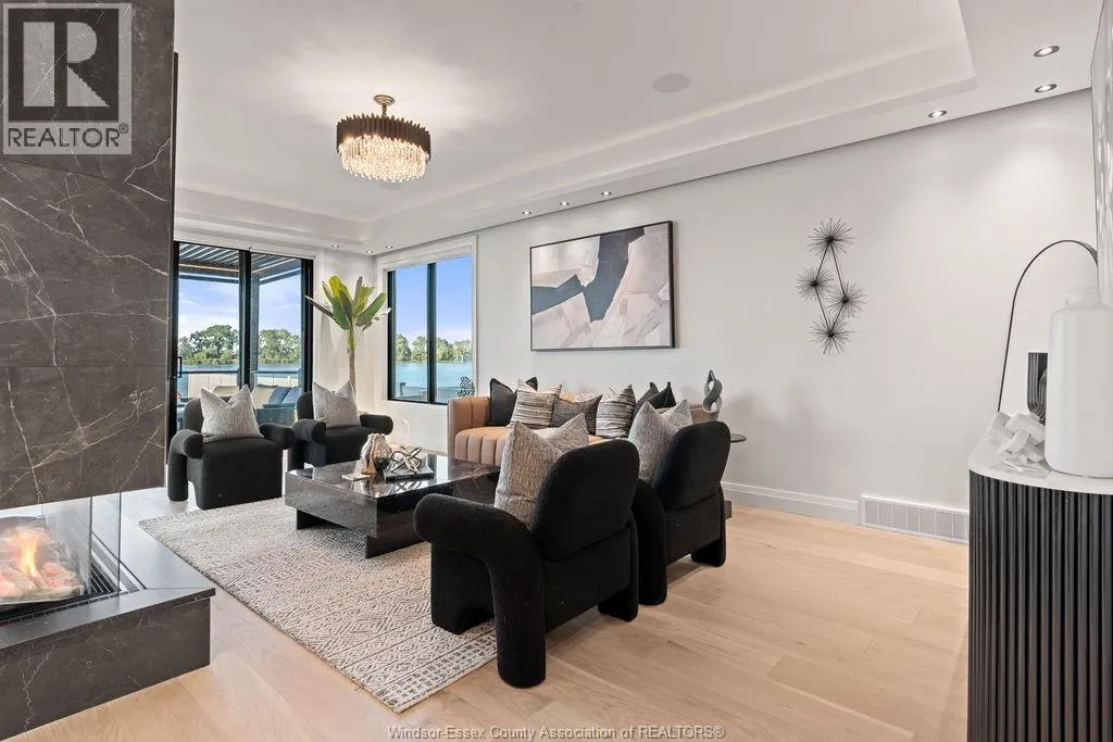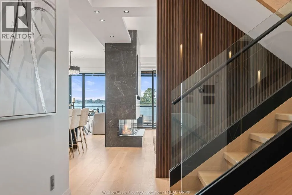 This custom-built luxury waterfront home offers 6 beds, 5 baths, and 3,760 sq.ft. of finished space (2600+1160) . Enter a grand foyer leading to a showpiece living room with 3D fireplace. The open-concept kitchen features leathered granite, high-end appliances, large island, and a butler's kitchen. Quartz counters throughout, Italian tile in all baths, and %"" engineered hardwood across all 3 levels. Built-in Sonos system, Auto blinds. Upstairs: 4 beds, 3 baths, including a primary suite with gas fireplace, balcony, walk-in, and spa-like en-suite. Lower level has private side entry from the waterfront park, 3rd kitchen, living area, 2 beds and full bath. Backyard oasis boasts 500+ sq.ft. composite decking, chef's BBQ kitchen, LED pergola with automated roof/screens, saltwater heated pool with 5 jets and waterfall, plus an inground firepit lounge. Private dock for boat or jet skis. In Riverside's most sought-after location. (id:27476)