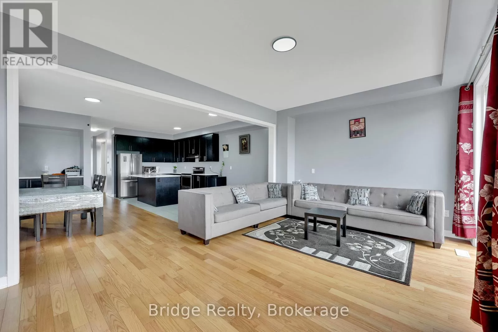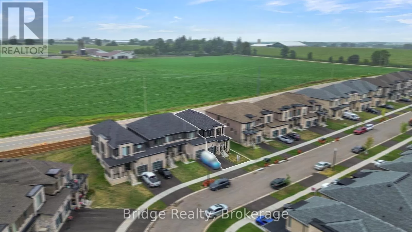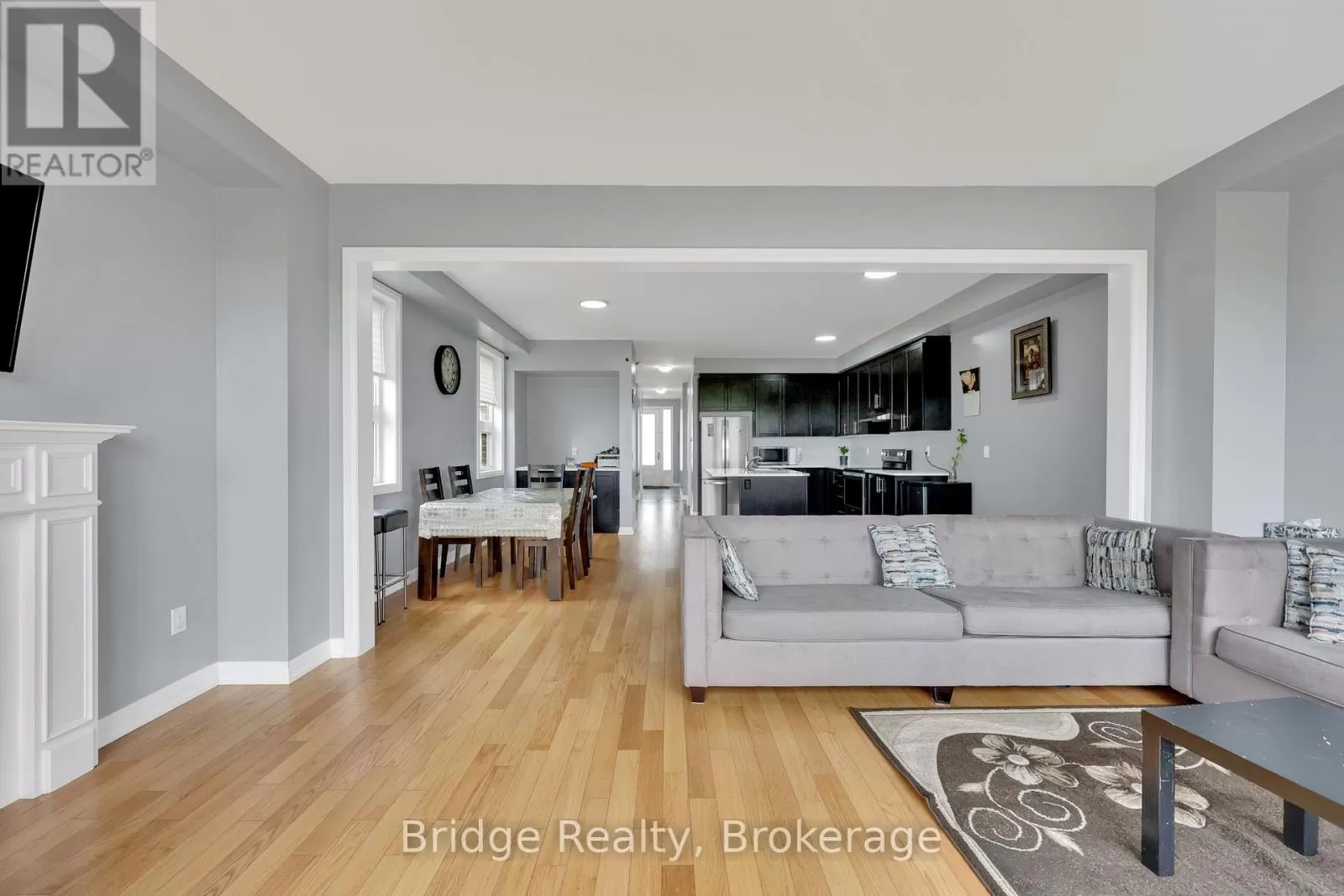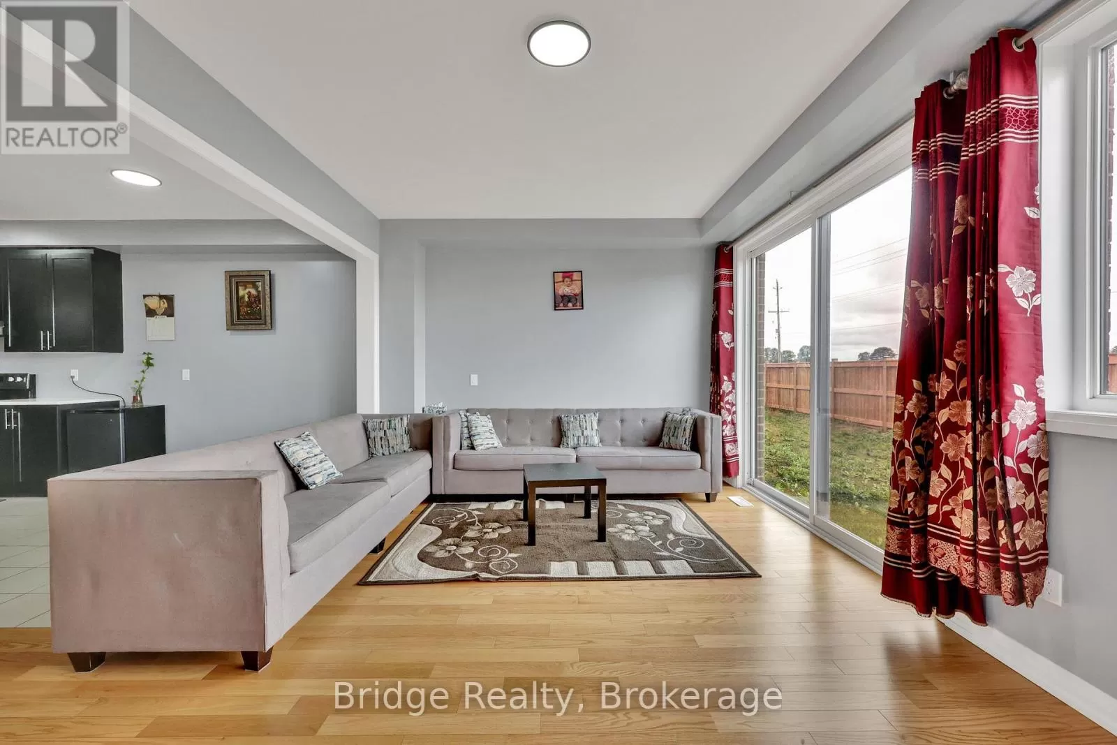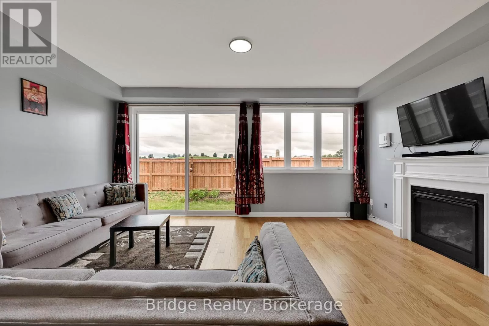 Sobeski Ave & Queenston Blvd This bright and spacious 4-bedroom, 3-bath end-unit townhome offers the feel of a semi-detachedand boasts 2,117 sq. ft. of living space (as per MPAC) with beautiful unobstructed views offarmland at the back. The open-concept main floor is filled with natural light and features alarge great room with a walk-out to the garden, a separate dining area, and oak strip hardwoodflooring throughout. A cozy gas fireplace adds warmth to the living space, while the moderneat-in kitchen showcases quartz countertops and stainless steel appliances. Upstairs, youllfind four generously sized bedrooms, including a primary suite with a luxurious 5-piece ensuitefeaturing a soaker tub and glass-enclosed shower. A second full bath and a convenient laundryroom complete the upper level. The full-height unfinished basement offers ample storage or thepotential for future living space. Parking includes an attached single-car garage and a privatedriveway. Located in a desirable neighborhood, this home is within walking distance to GurdwaraSahib, grocery stores, pizza and Indian restaurants, and the Thames River Conservation Area,and is just minutes from Hwy 401 and other amenities. Dont miss this rare opportunity! (id:27476)