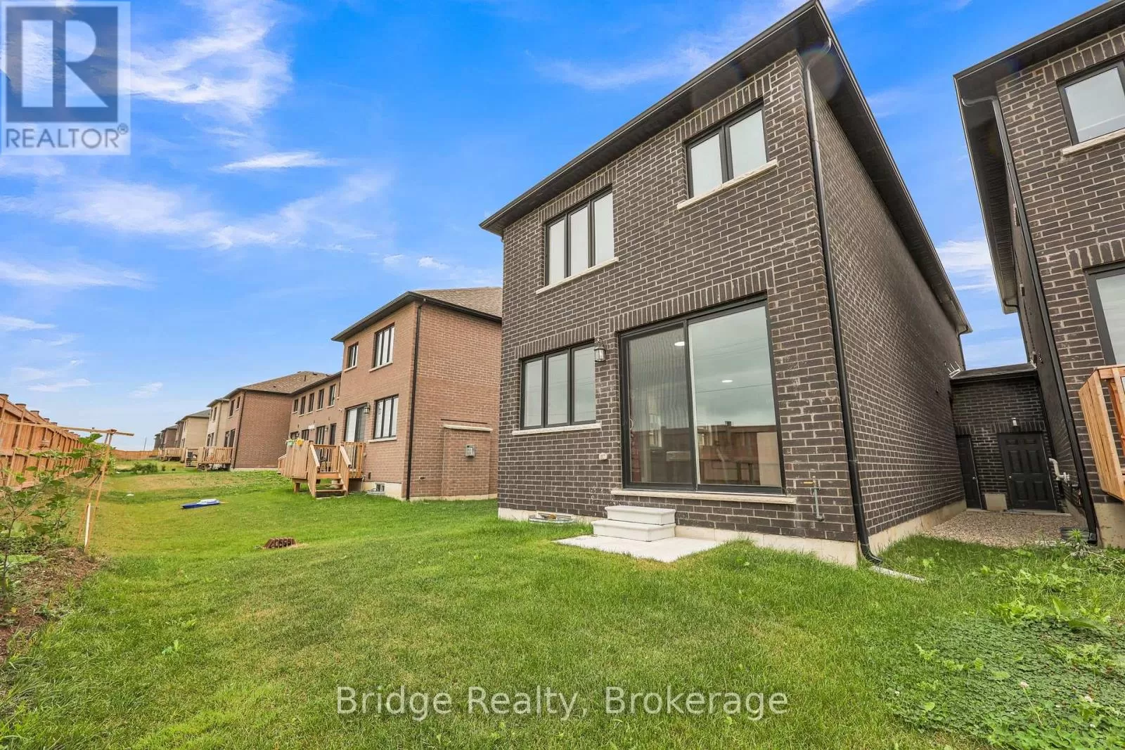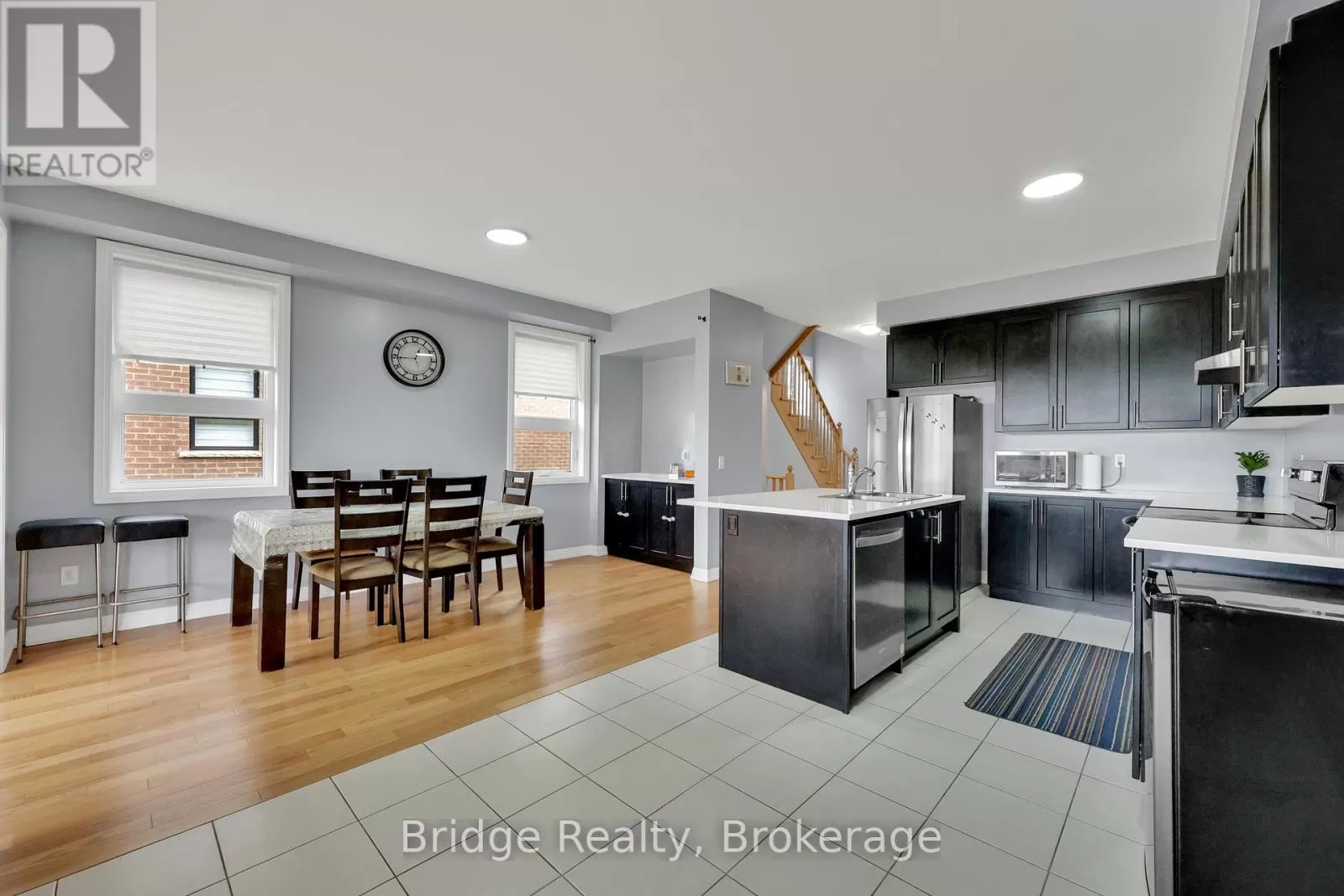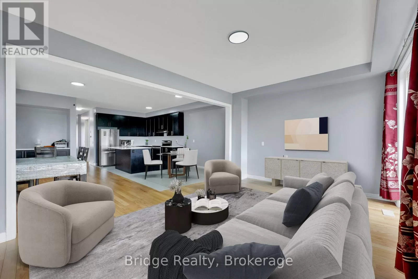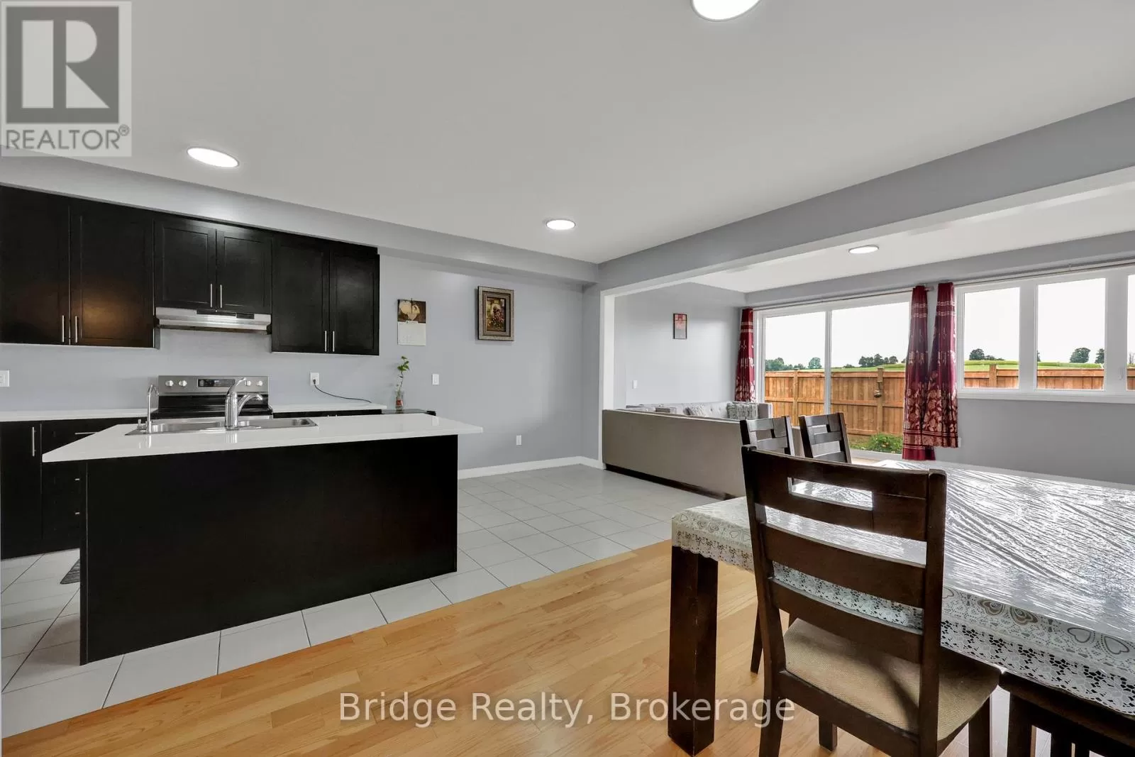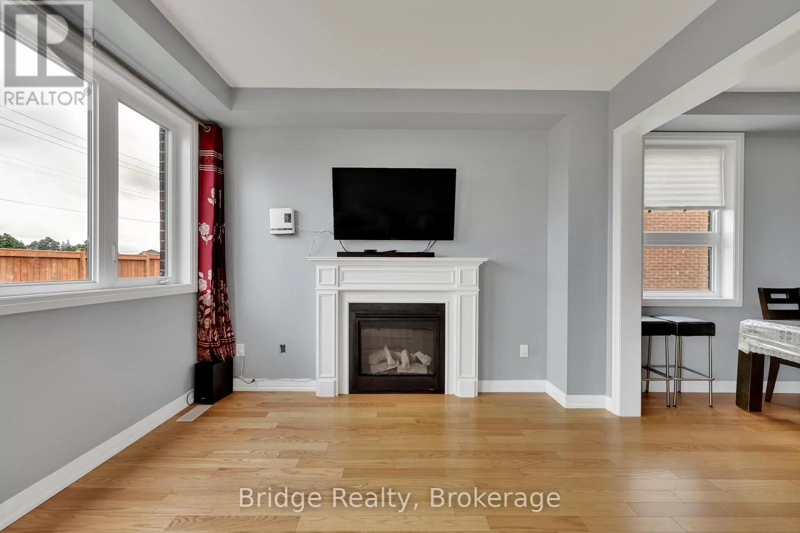 Sobeski Ave & Queenston Blvd This bright and spacious 4-bedroom, 3-bath end-unit townhome offers the feel of a semi-detachedand boasts 2,117 sq. ft. of living space (as per MPAC) with beautiful unobstructed views offarmland at the back. The open-concept main floor is filled with natural light and features alarge great room with a walk-out to the garden, a separate dining area, and oak strip hardwoodflooring throughout. A cozy gas fireplace adds warmth to the living space, while the moderneat-in kitchen showcases quartz countertops and stainless steel appliances. Upstairs, youllfind four generously sized bedrooms, including a primary suite with a luxurious 5-piece ensuitefeaturing a soaker tub and glass-enclosed shower. A second full bath and a convenient laundryroom complete the upper level. The full-height unfinished basement offers ample storage or thepotential for future living space. Parking includes an attached single-car garage and a privatedriveway. Located in a desirable neighborhood, this home is within walking distance to GurdwaraSahib, grocery stores, pizza and Indian restaurants, and the Thames River Conservation Area,and is just minutes from Hwy 401 and other amenities. Dont miss this rare opportunity! (id:27476)