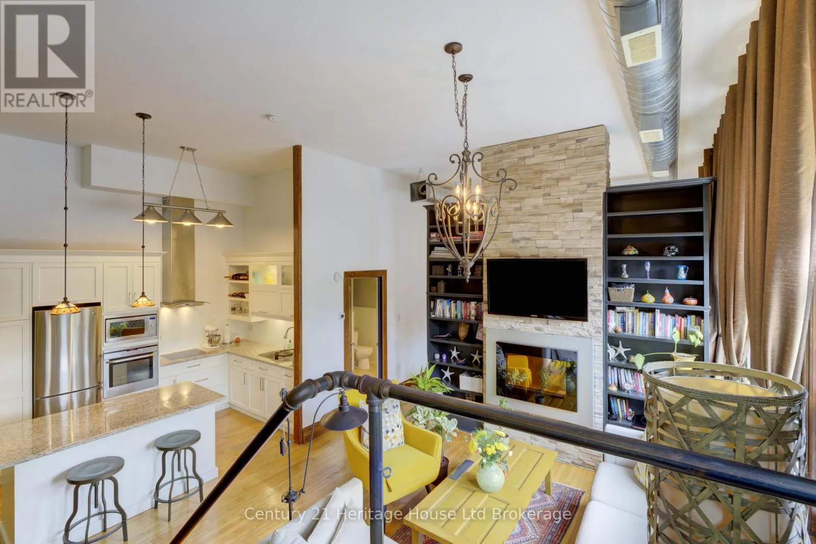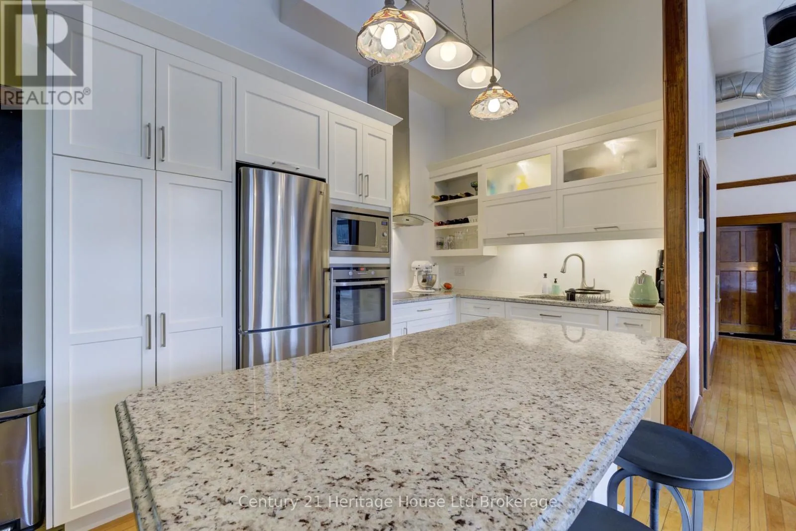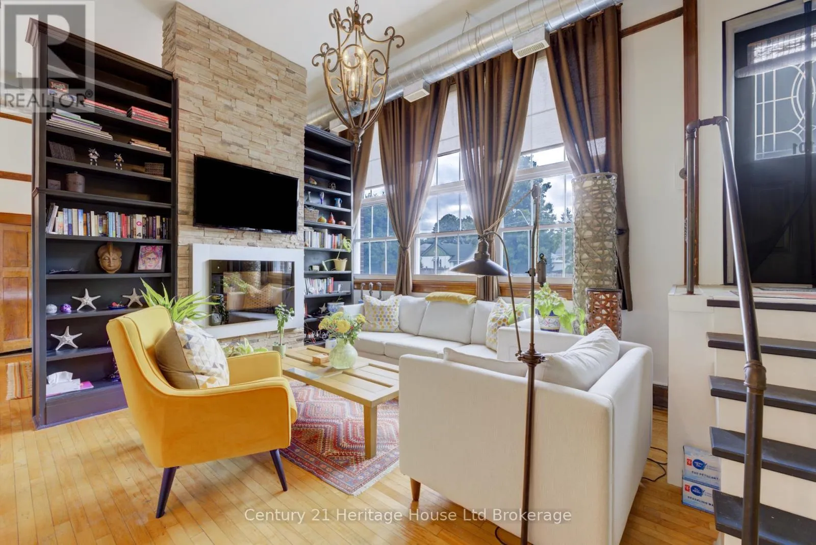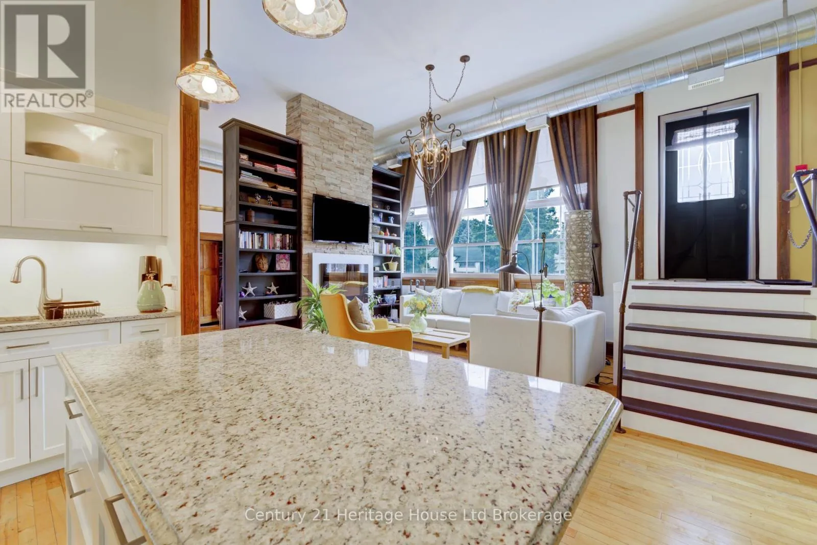Cross Streets: Travel east on dundas from Wilson, right onto Chapel St. & property is on the east side. ** Directions: peel - Lawrason. Discover the perfect blend of character and comfort in this truly unique Chapel School condominium. From the moment you enter, the original charm is undeniable; hardwood floors, high ceilings, 8" baseboards, and even preserved blackboards add warmth and history to the space. A custom ironwork railing frames the entry landing and opens to an inviting, open-concept layout designed for both everyday living and entertaining. At the heart of the home is a show-stopping modern kitchen, complete with a 6' granite island featuring seating, pot drawers, and an electrical outlet. A full bank of cabinets and granite counters provides ample workspace, alongside a built-in oven, cooktop, stylish range hood, pantry with pull-outs, lazy Susan, and double stainless sink. The spacious living room is anchored by a dramatic floor-to-ceiling stacked stone fireplace flanked by custom twin bookcases. The generous 4-piece bath has been refreshed with a new vanity and toilet, while the primary bedroom boasts a clever Harry Potter-style door system that opens several panels at once with a single turn. Additional features include in-suite laundry, newer windows, quality appliances, a private deck, outdoor storage, and two parking spaces. This rare condo offers the charm of yesteryear with all the conveniences of modern living truly one-of-a-kind (id:27476)