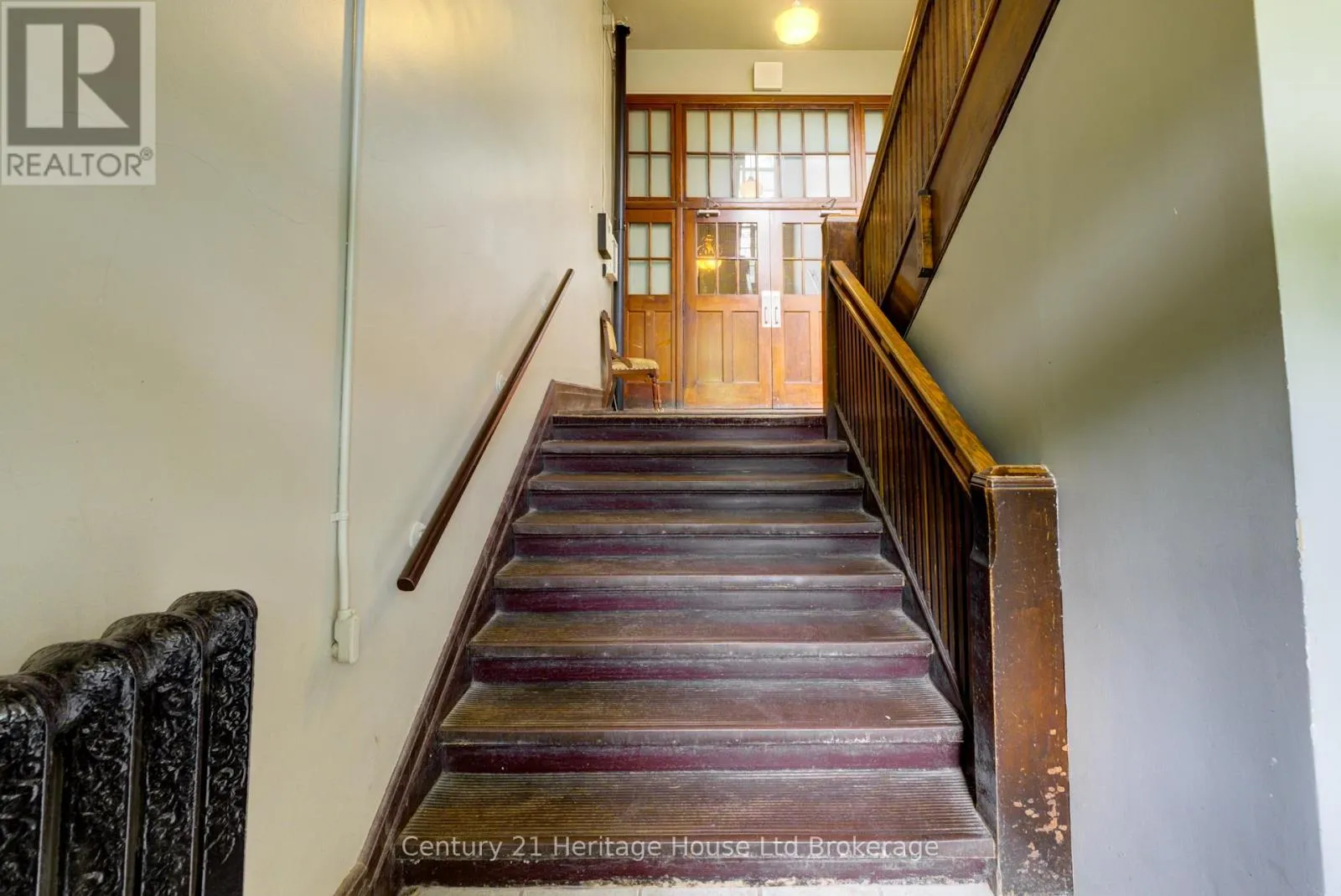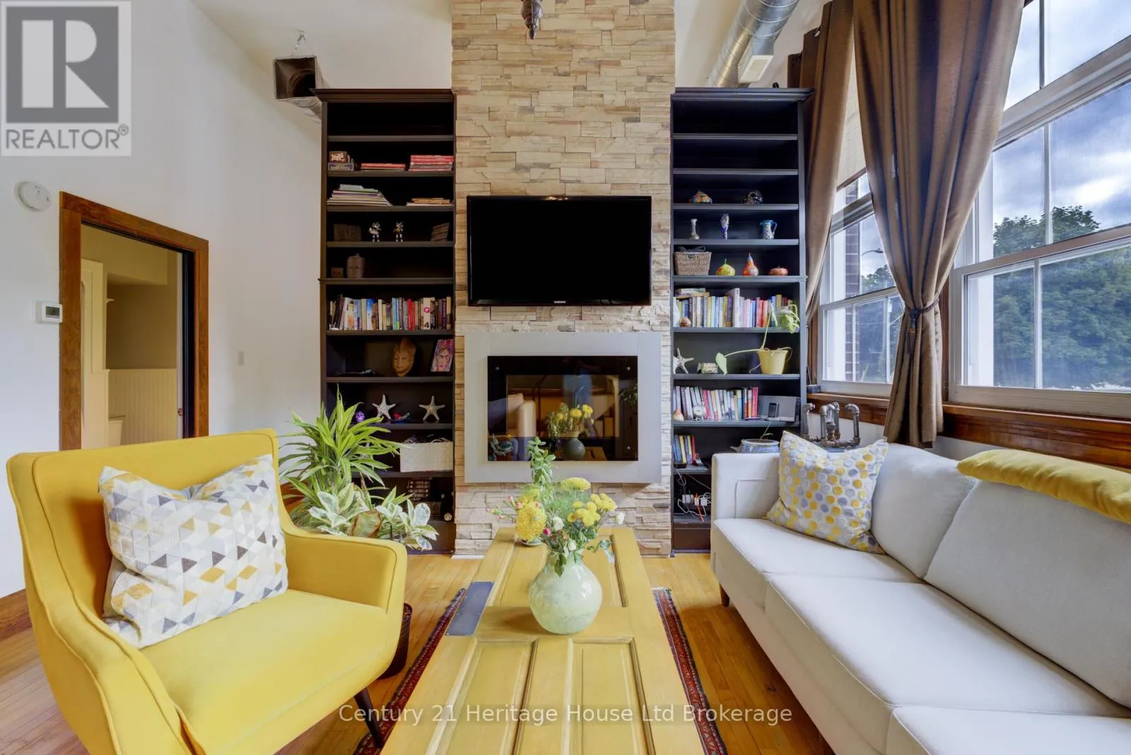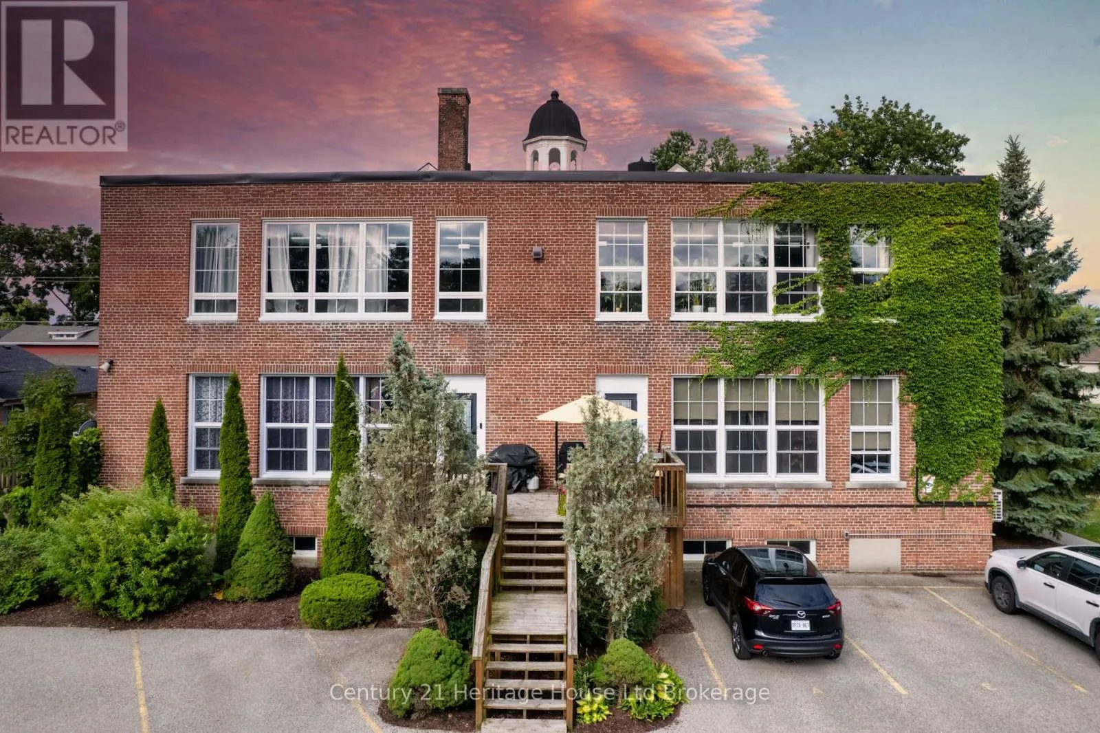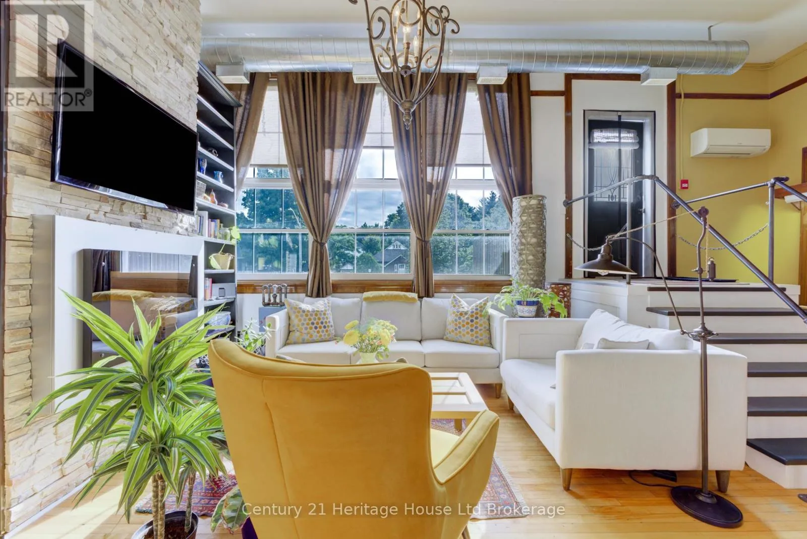 Cross Streets: Travel east on dundas from Wilson, right onto Chapel St. & property is on the east side. ** Directions: peel - Lawrason. Discover the perfect blend of character and comfort in this truly unique Chapel School condominium. From the moment you enter, the original charm is undeniable; hardwood floors, high ceilings, 8" baseboards, and even preserved blackboards add warmth and history to the space. A custom ironwork railing frames the entry landing and opens to an inviting, open-concept layout designed for both everyday living and entertaining. At the heart of the home is a show-stopping modern kitchen, complete with a 6' granite island featuring seating, pot drawers, and an electrical outlet. A full bank of cabinets and granite counters provides ample workspace, alongside a built-in oven, cooktop, stylish range hood, pantry with pull-outs, lazy Susan, and double stainless sink. The spacious living room is anchored by a dramatic floor-to-ceiling stacked stone fireplace flanked by custom twin bookcases. The generous 4-piece bath has been refreshed with a new vanity and toilet, while the primary bedroom boasts a clever Harry Potter-style door system that opens several panels at once with a single turn. Additional features include in-suite laundry, newer windows, quality appliances, a private deck, outdoor storage, and two parking spaces. This rare condo offers the charm of yesteryear with all the conveniences of modern living truly one-of-a-kind (id:27476)
