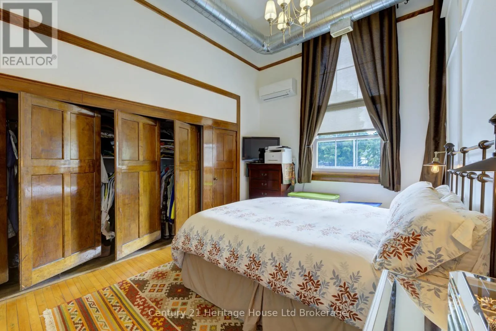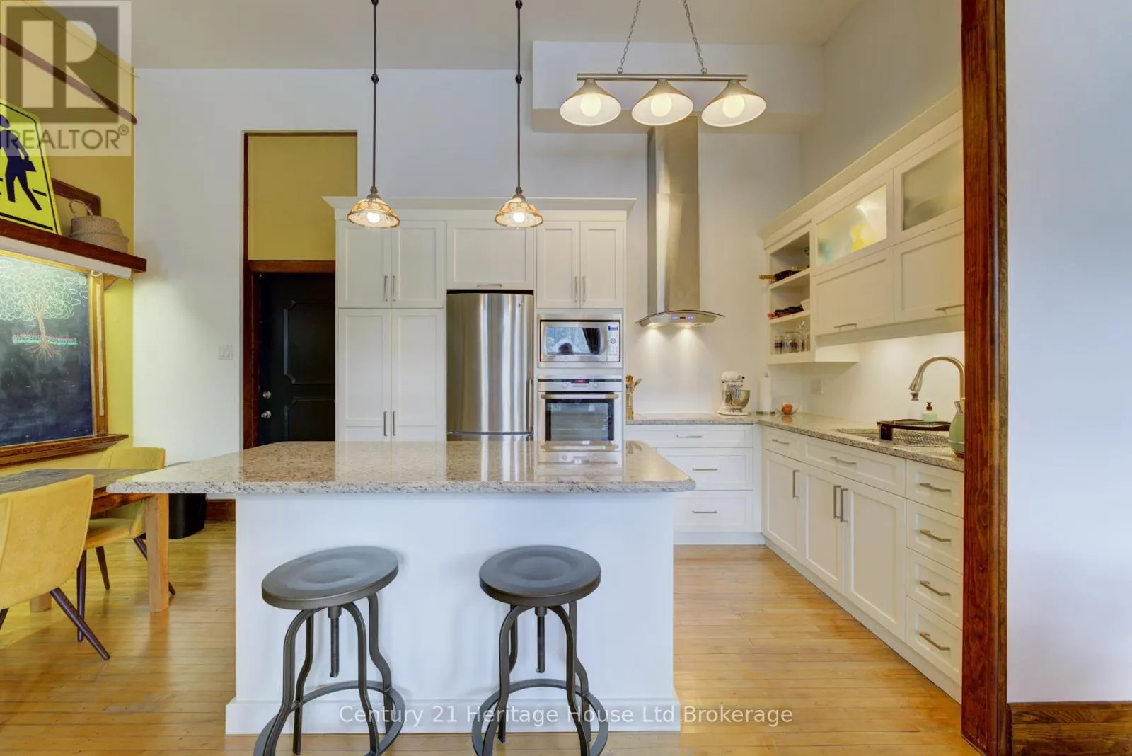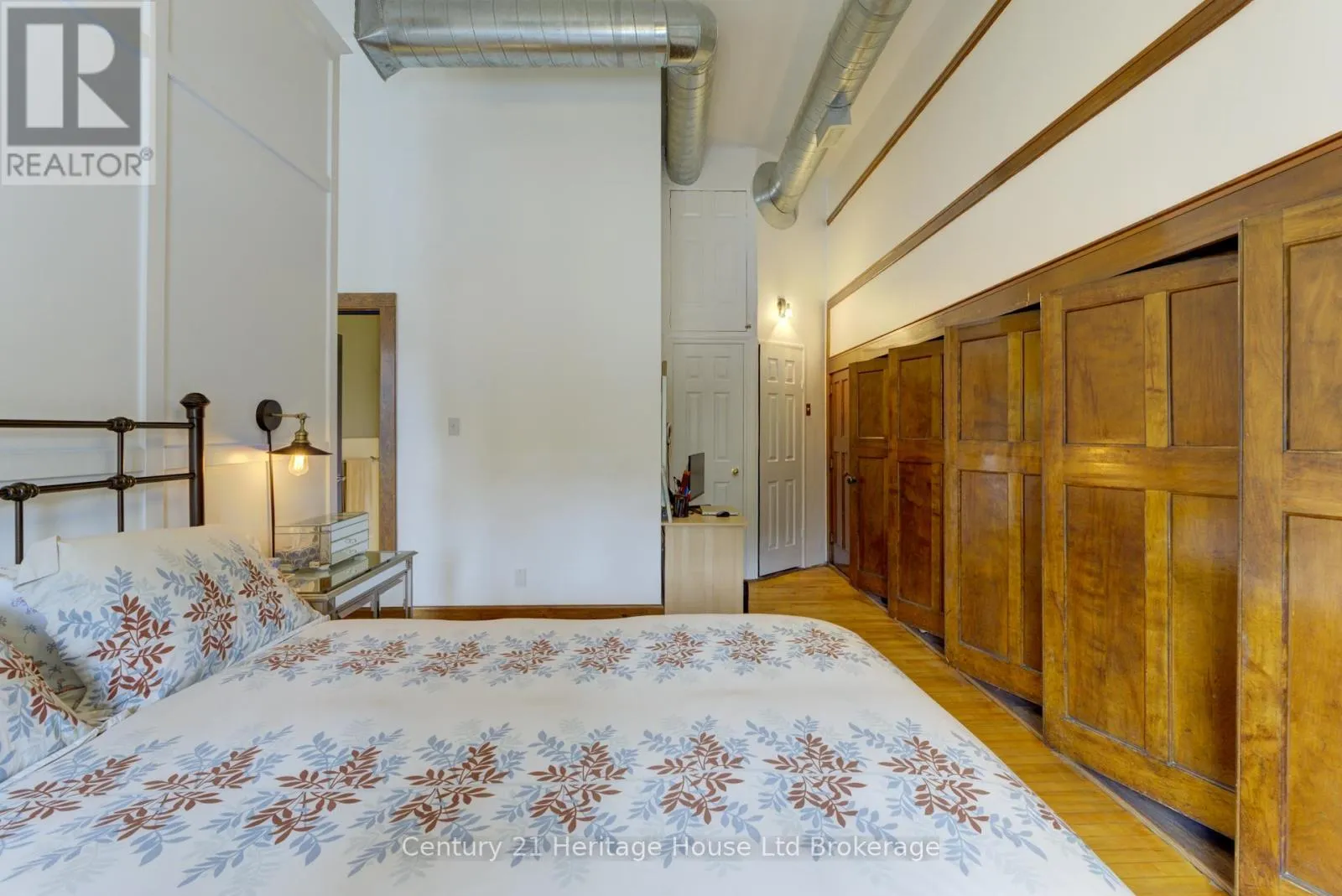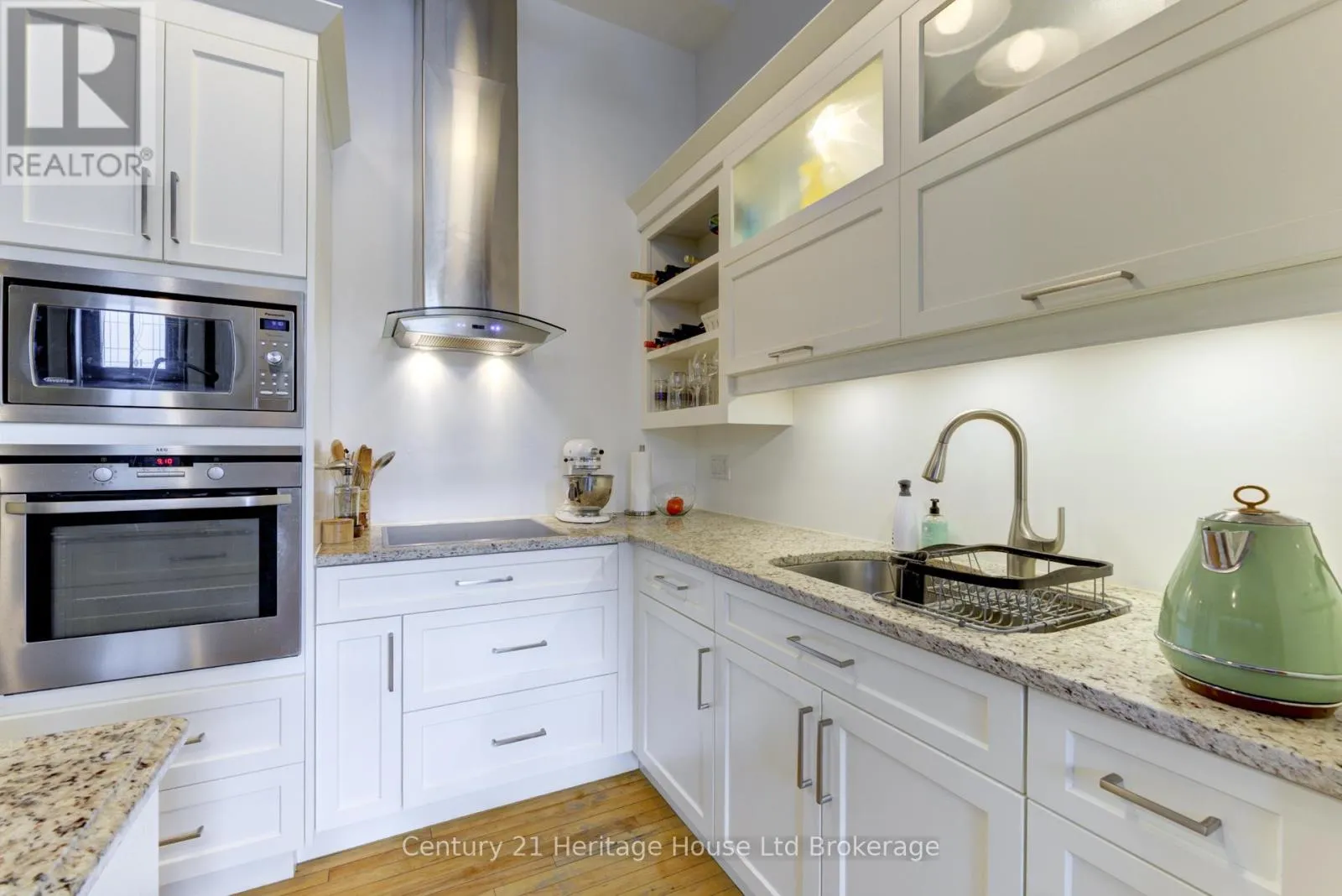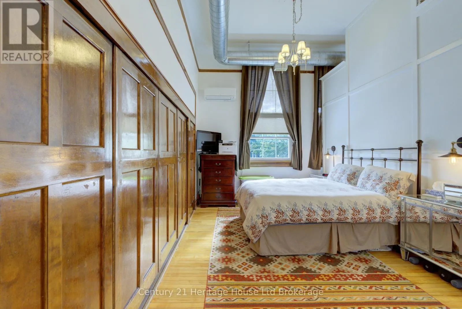 Cross Streets: Travel east on dundas from Wilson, right onto Chapel St. & property is on the east side. ** Directions: peel - Lawrason. Discover the perfect blend of character and comfort in this truly unique Chapel School condominium. From the moment you enter, the original charm is undeniable; hardwood floors, high ceilings, 8" baseboards, and even preserved blackboards add warmth and history to the space. A custom ironwork railing frames the entry landing and opens to an inviting, open-concept layout designed for both everyday living and entertaining. At the heart of the home is a show-stopping modern kitchen, complete with a 6' granite island featuring seating, pot drawers, and an electrical outlet. A full bank of cabinets and granite counters provides ample workspace, alongside a built-in oven, cooktop, stylish range hood, pantry with pull-outs, lazy Susan, and double stainless sink. The spacious living room is anchored by a dramatic floor-to-ceiling stacked stone fireplace flanked by custom twin bookcases. The generous 4-piece bath has been refreshed with a new vanity and toilet, while the primary bedroom boasts a clever Harry Potter-style door system that opens several panels at once with a single turn. Additional features include in-suite laundry, newer windows, quality appliances, a private deck, outdoor storage, and two parking spaces. This rare condo offers the charm of yesteryear with all the conveniences of modern living truly one-of-a-kind (id:27476)