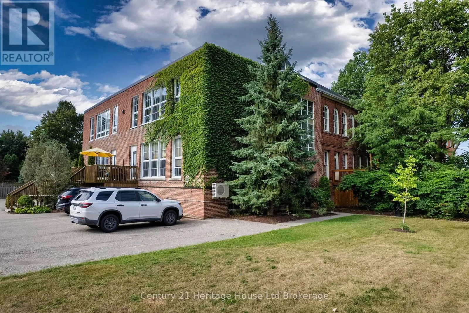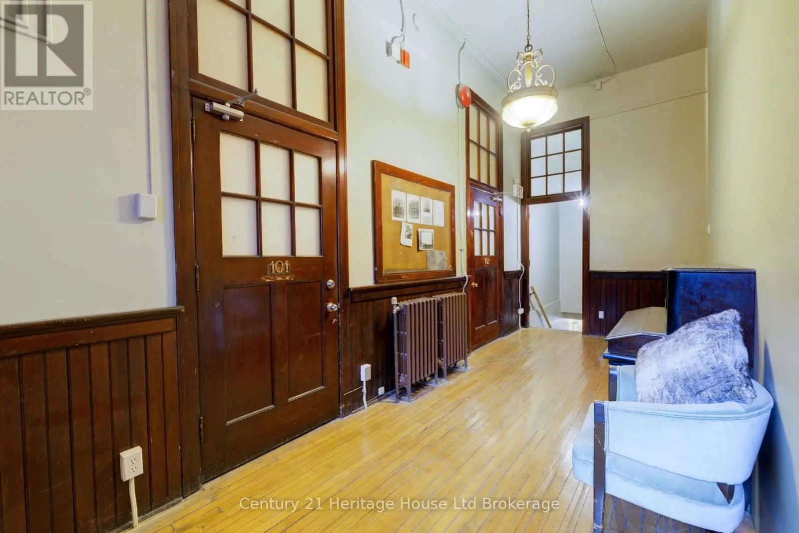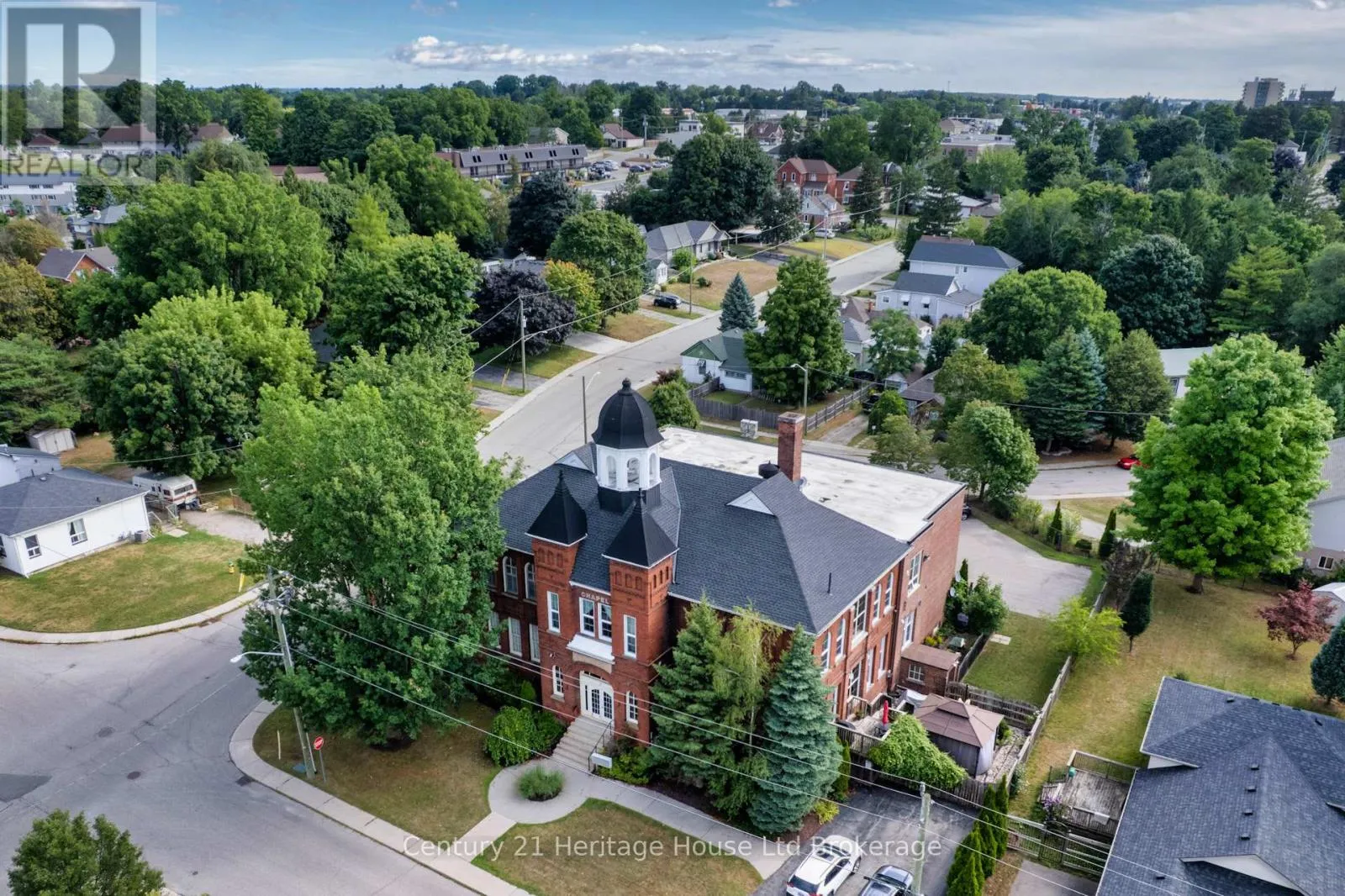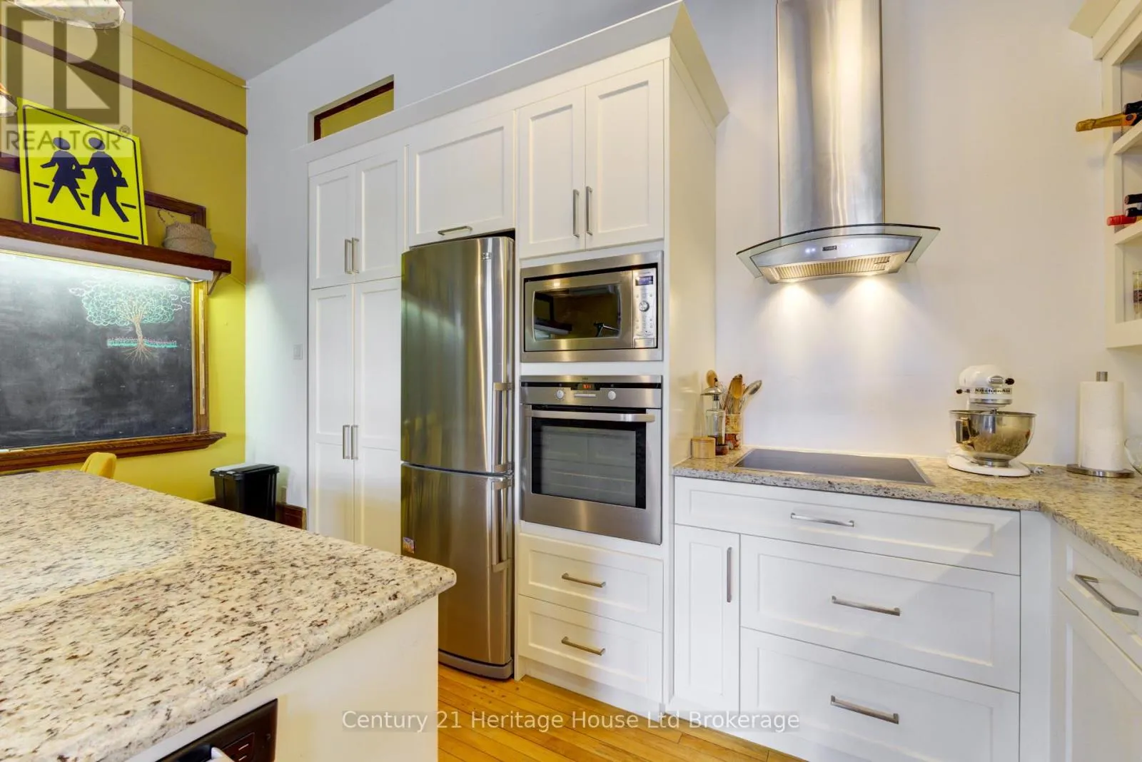 Cross Streets: Travel east on dundas from Wilson, right onto Chapel St. & property is on the east side. ** Directions: peel - Lawrason. Discover the perfect blend of character and comfort in this truly unique Chapel School condominium. From the moment you enter, the original charm is undeniable; hardwood floors, high ceilings, 8" baseboards, and even preserved blackboards add warmth and history to the space. A custom ironwork railing frames the entry landing and opens to an inviting, open-concept layout designed for both everyday living and entertaining. At the heart of the home is a show-stopping modern kitchen, complete with a 6' granite island featuring seating, pot drawers, and an electrical outlet. A full bank of cabinets and granite counters provides ample workspace, alongside a built-in oven, cooktop, stylish range hood, pantry with pull-outs, lazy Susan, and double stainless sink. The spacious living room is anchored by a dramatic floor-to-ceiling stacked stone fireplace flanked by custom twin bookcases. The generous 4-piece bath has been refreshed with a new vanity and toilet, while the primary bedroom boasts a clever Harry Potter-style door system that opens several panels at once with a single turn. Additional features include in-suite laundry, newer windows, quality appliances, a private deck, outdoor storage, and two parking spaces. This rare condo offers the charm of yesteryear with all the conveniences of modern living truly one-of-a-kind (id:27476)