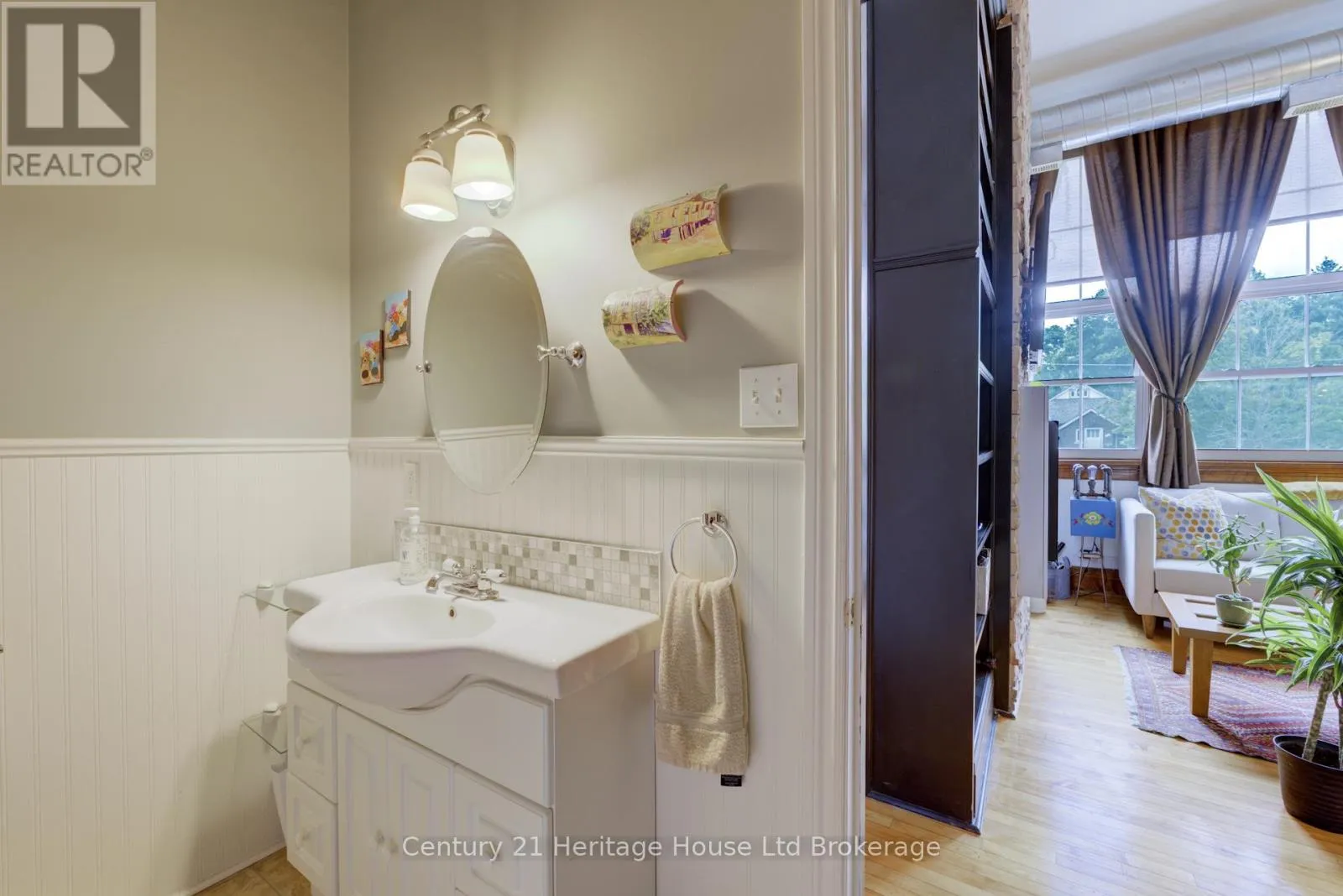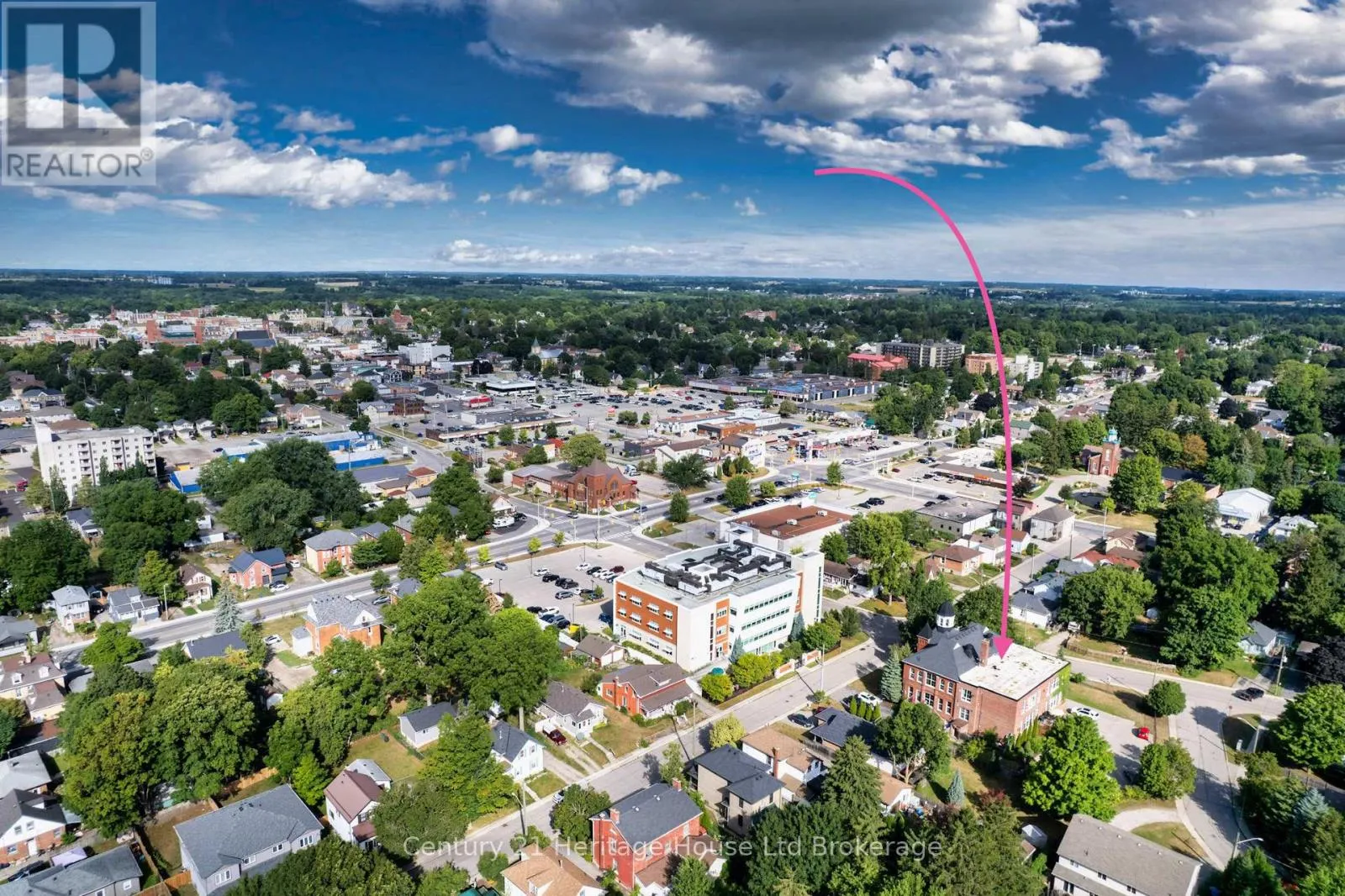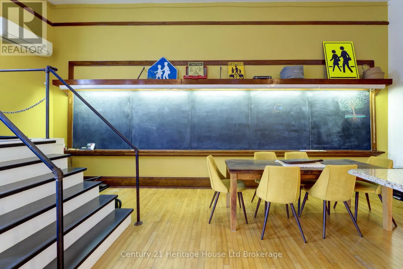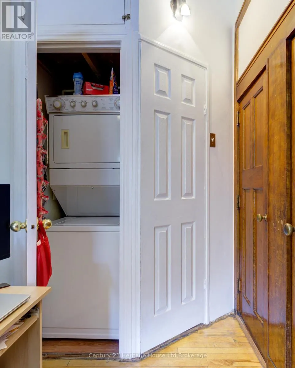 Cross Streets: Travel east on dundas from Wilson, right onto Chapel St. & property is on the east side. ** Directions: peel - Lawrason. Discover the perfect blend of character and comfort in this truly unique Chapel School condominium. From the moment you enter, the original charm is undeniable; hardwood floors, high ceilings, 8" baseboards, and even preserved blackboards add warmth and history to the space. A custom ironwork railing frames the entry landing and opens to an inviting, open-concept layout designed for both everyday living and entertaining. At the heart of the home is a show-stopping modern kitchen, complete with a 6' granite island featuring seating, pot drawers, and an electrical outlet. A full bank of cabinets and granite counters provides ample workspace, alongside a built-in oven, cooktop, stylish range hood, pantry with pull-outs, lazy Susan, and double stainless sink. The spacious living room is anchored by a dramatic floor-to-ceiling stacked stone fireplace flanked by custom twin bookcases. The generous 4-piece bath has been refreshed with a new vanity and toilet, while the primary bedroom boasts a clever Harry Potter-style door system that opens several panels at once with a single turn. Additional features include in-suite laundry, newer windows, quality appliances, a private deck, outdoor storage, and two parking spaces. This rare condo offers the charm of yesteryear with all the conveniences of modern living truly one-of-a-kind (id:27476)