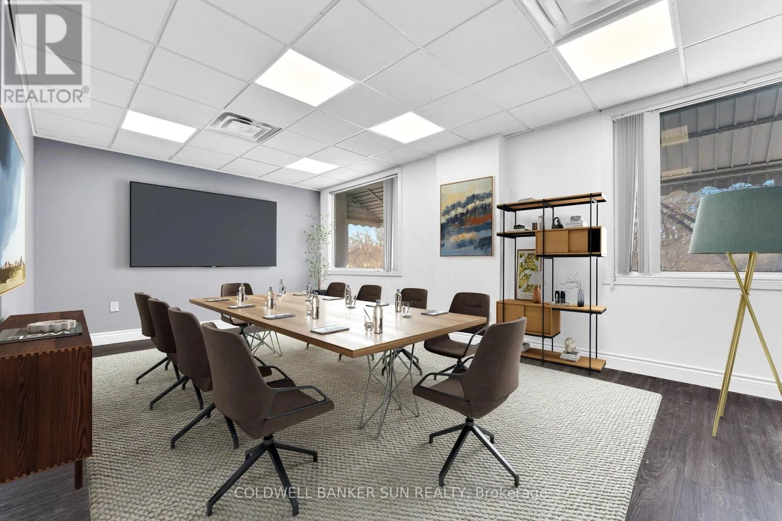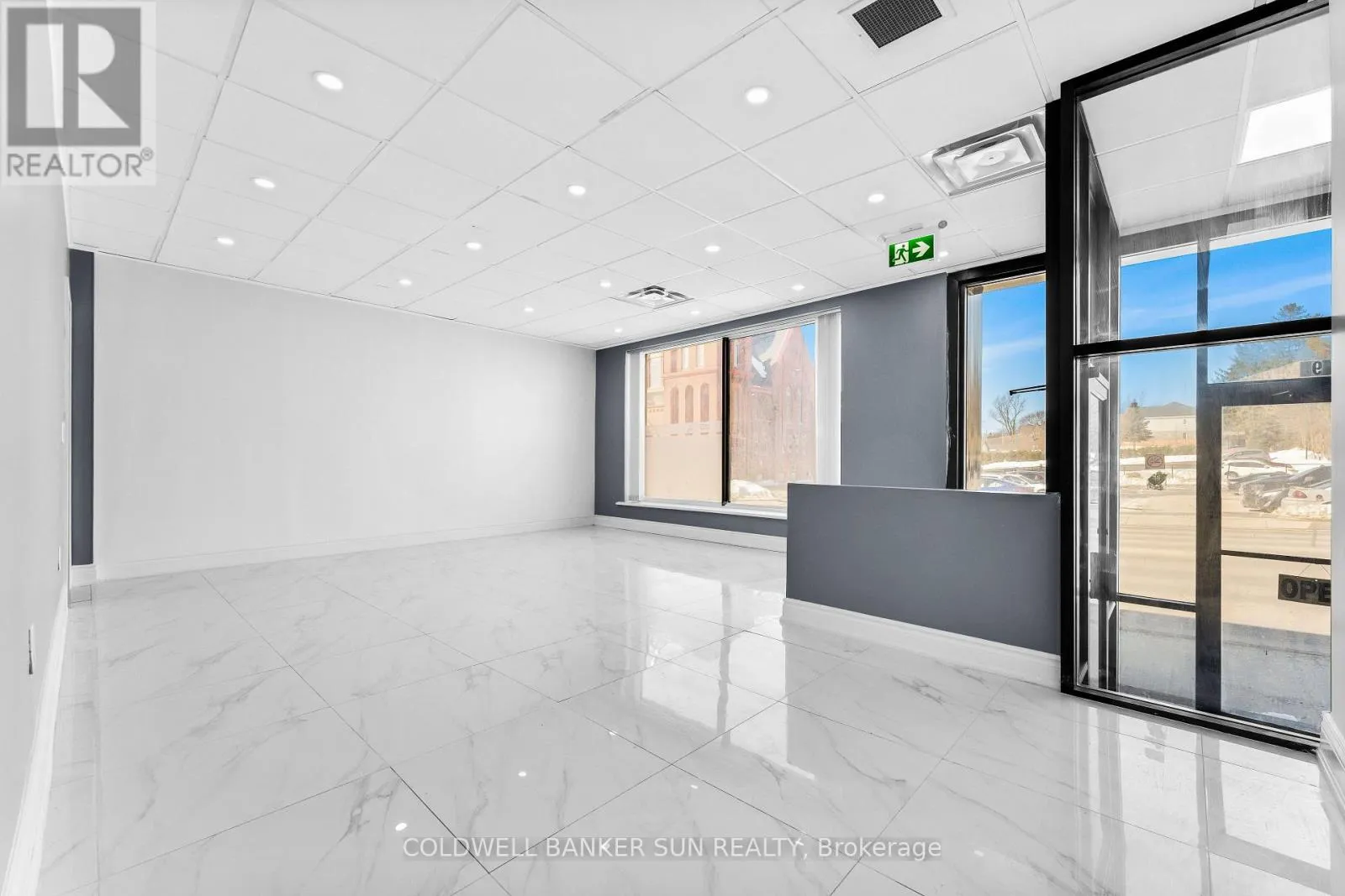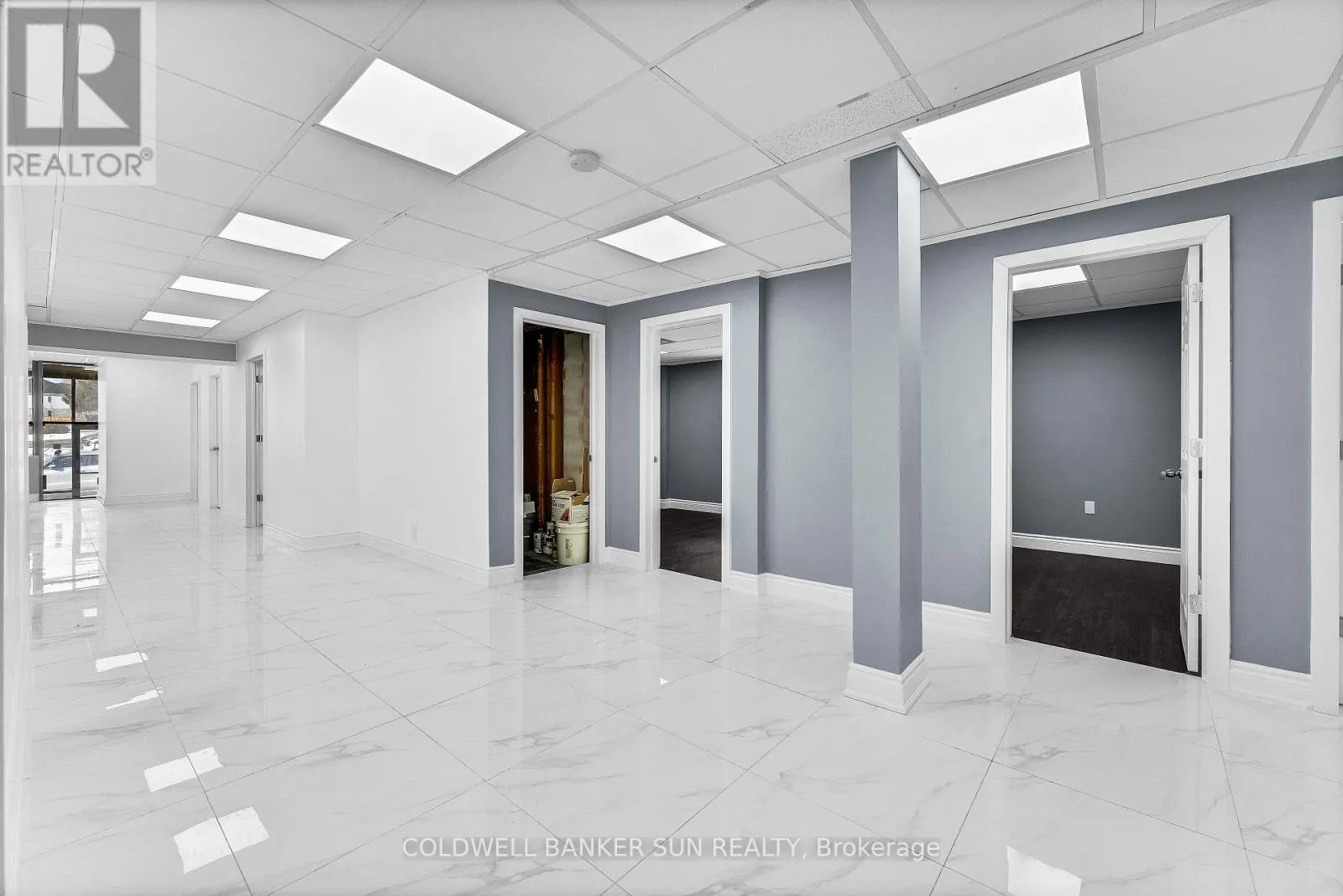 Cross Streets: Dundas St and Mill St. ** Directions: Access the property through back door via Hay lane off Mill St. Use the garage door code to enter. Beautifully Renovated Central Commercial Zone C5 Unit with Mixed-Use Zoning! This spacious 3487.50 sq. ft. main-floor unit offers multiple offices, a reception area, a common work area, a meeting room, a filing room, A rough in kitchenette two bathrooms, and two staircases leading to city-approved indoor 5 +legal parking. Over $300,000 has been invested in renovations, including five legal indoor parking spots equipped with two HRVs, a CO sensor, an automatic door opener, and a separate heated furnace. Additional upgrades include a new flat roof with warranty, a new furnace, a new garage door, updated flooring, fresh paint, and more. A fantastic opportunity for a versatile commercial space! The current zoning allows the following uses Doctors Office with Pharmacy, an appliance sales and service shop, an artist studio, an assembly hall, an automobile service station a bake shop, a Bank or financial institution, a bar or nightclub, a brewers retail outlet, a business or professional office, a catalogue store, a commercial club, a commercial school, a convenience store, a customer contact centre office, a department store, a drug store, a dry cleaner's distribution station, a dry cleaning establishment, an eating establishment, a finance office, a florist shop, a fraternal lodge or association, a furniture store, a health club, a laundry shop, a medical clinic. (id:27476)