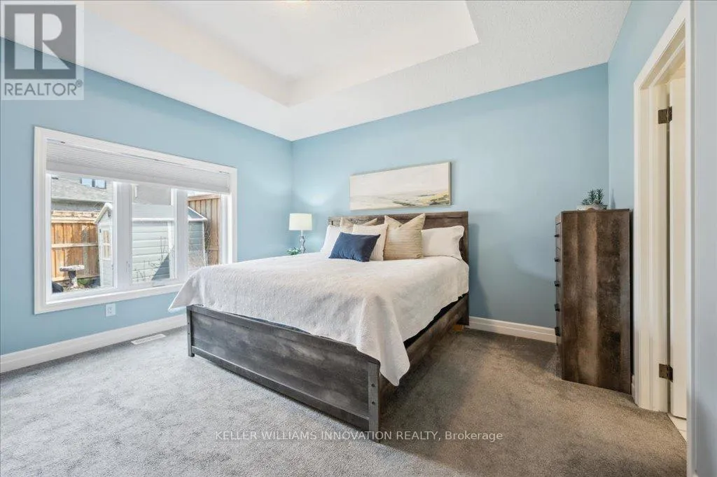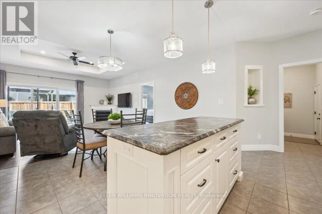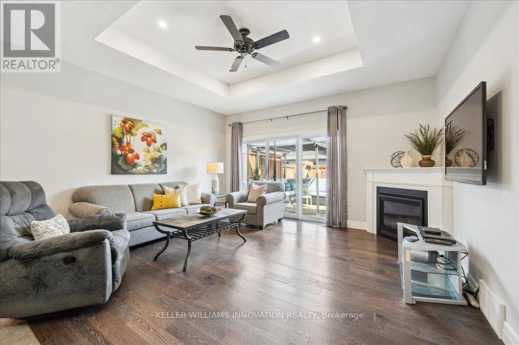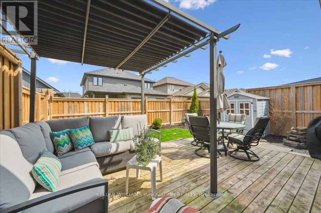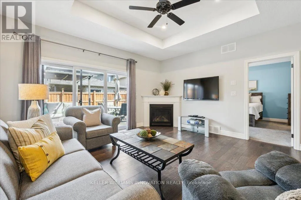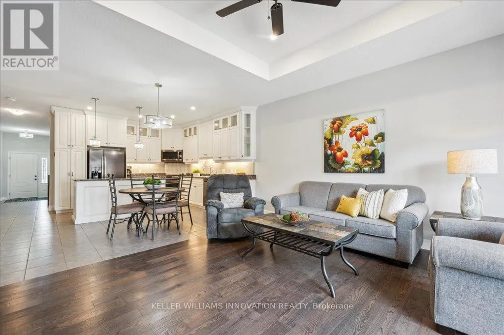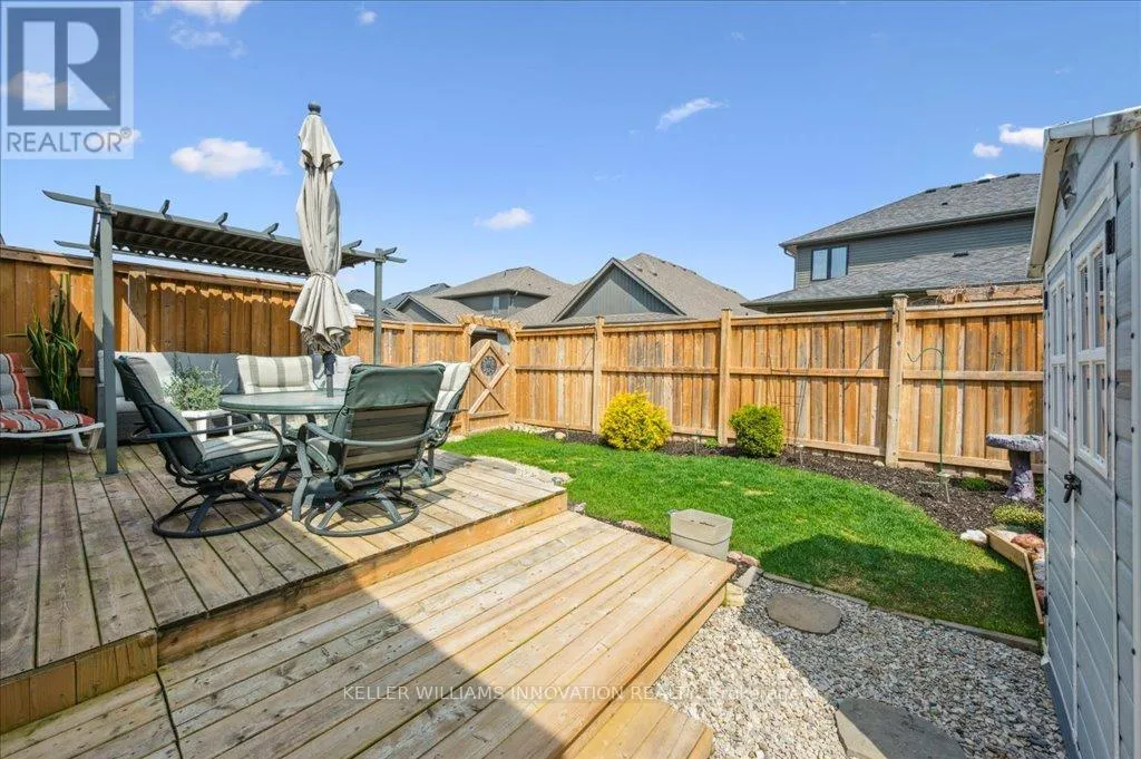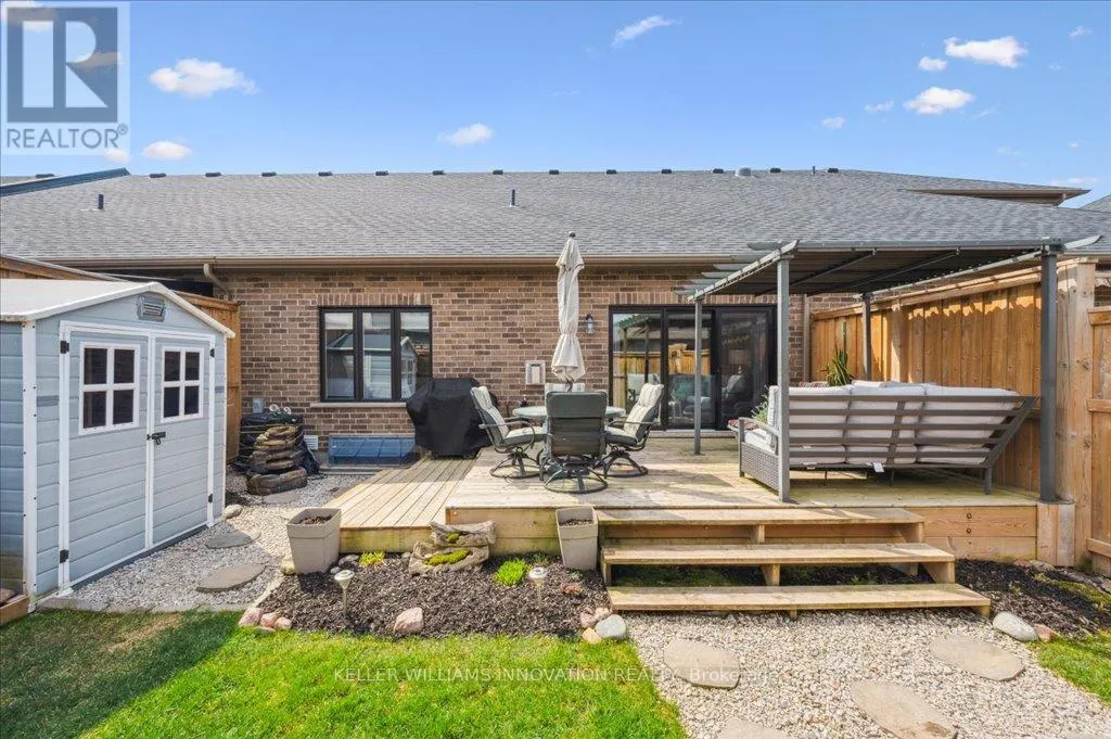 Woodberry Cres Welcome to 28 Bur Oak Drive - Bungalow townhouse with no condo fees! This lovely move-in ready townhouse offers a main floor primary bedroom, 2 car parking and is located close to shopping and amenities in Elmira. With 2,440 sq ft of total finished living space, this townhouse has 2+1 bedrooms and 3 bathrooms. Enter through the front foyer, past the front bedroom/den and the adjacent 4 piece bathroom and into the open concept kitchen and living room . The white kitchen has ample cupboard space, a large island and dinette, a great spot for your morning cup of coffee! The living room features a tray ceiling, hardwood floors and a gas fireplace. The primary bedroom has a tray ceiling, a walk-in closet and a 4 piece ensuite with shower and double sinks, no need to share your space! Also found on the main floor is the laundry room and access to the garage. Downstairs you will find an extra large rec room, an additional bedroom and a 3 piece bathroom. Have pets? This home has a pet washing station under the stairs! The backyard is a summer oasis! The fully fenced landscaped yard has a deck with pergola with built-in bench. This home is in a great location with easy access to shopping, HWY 85, and walking trails along the Lions Ring Trail. (id:27476)