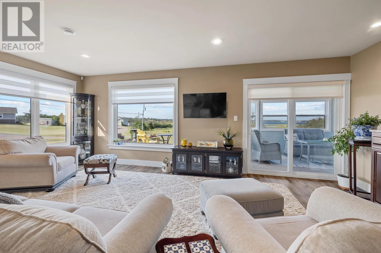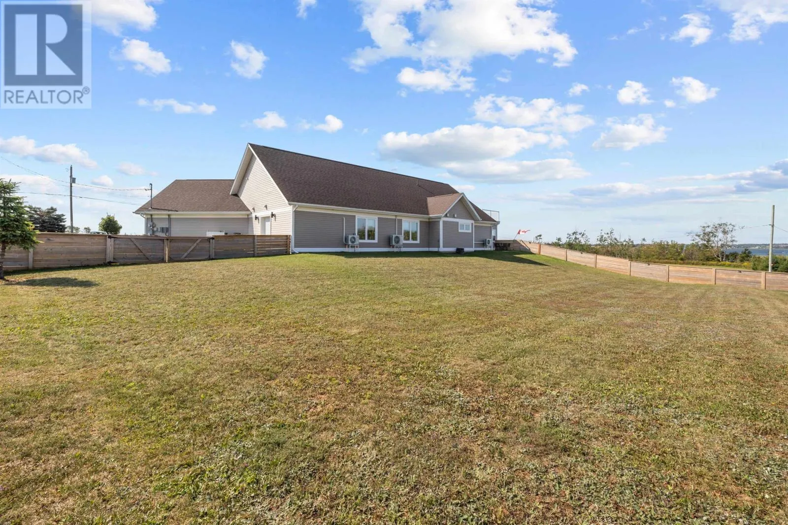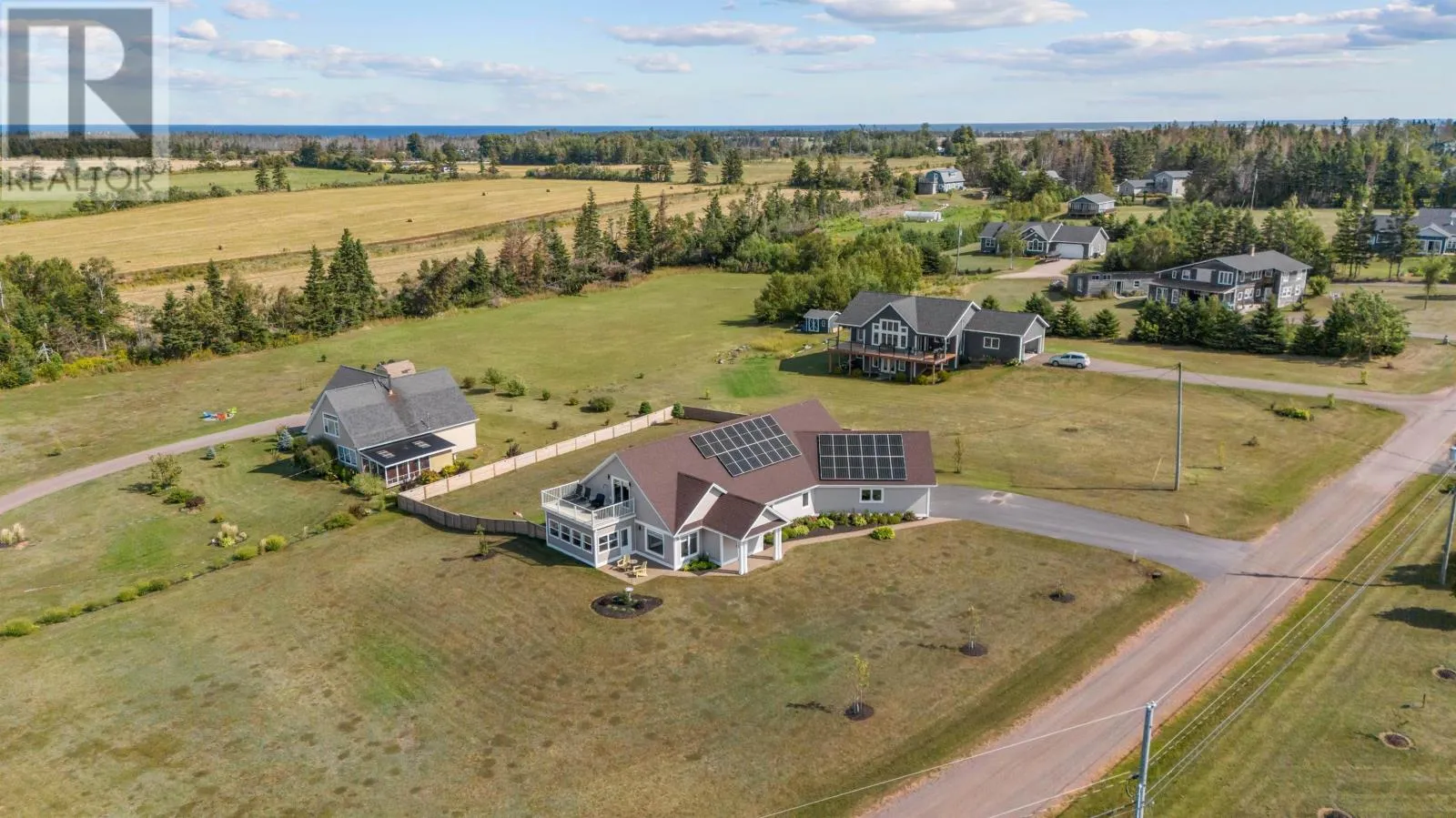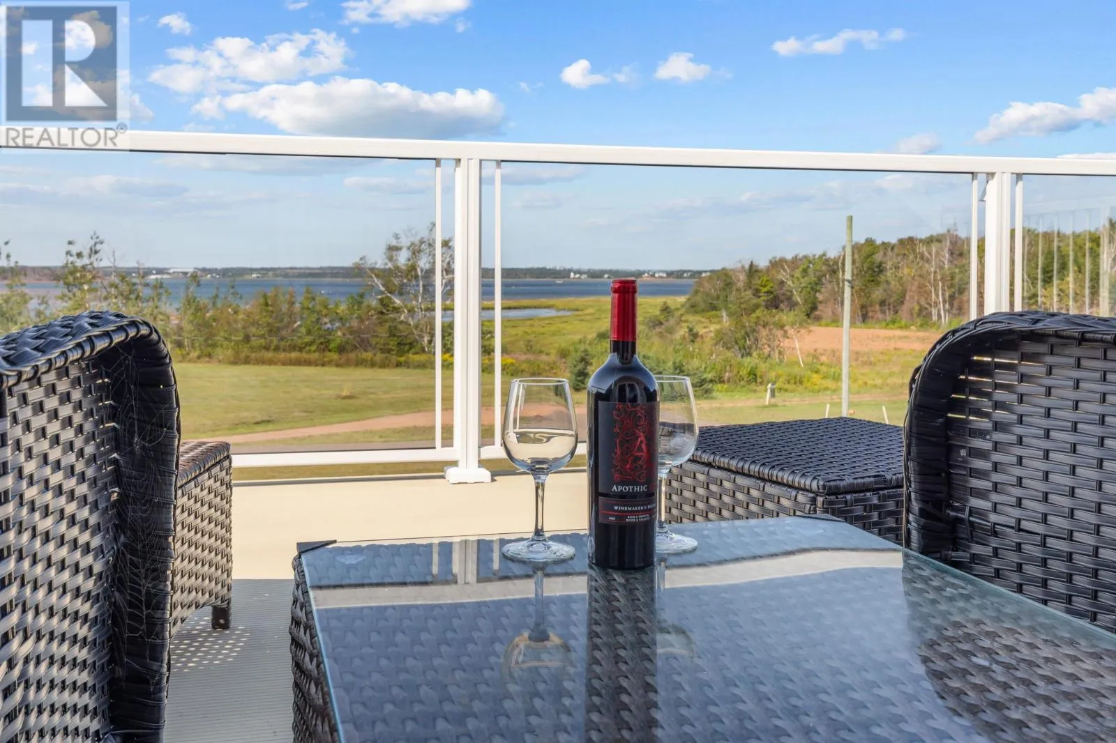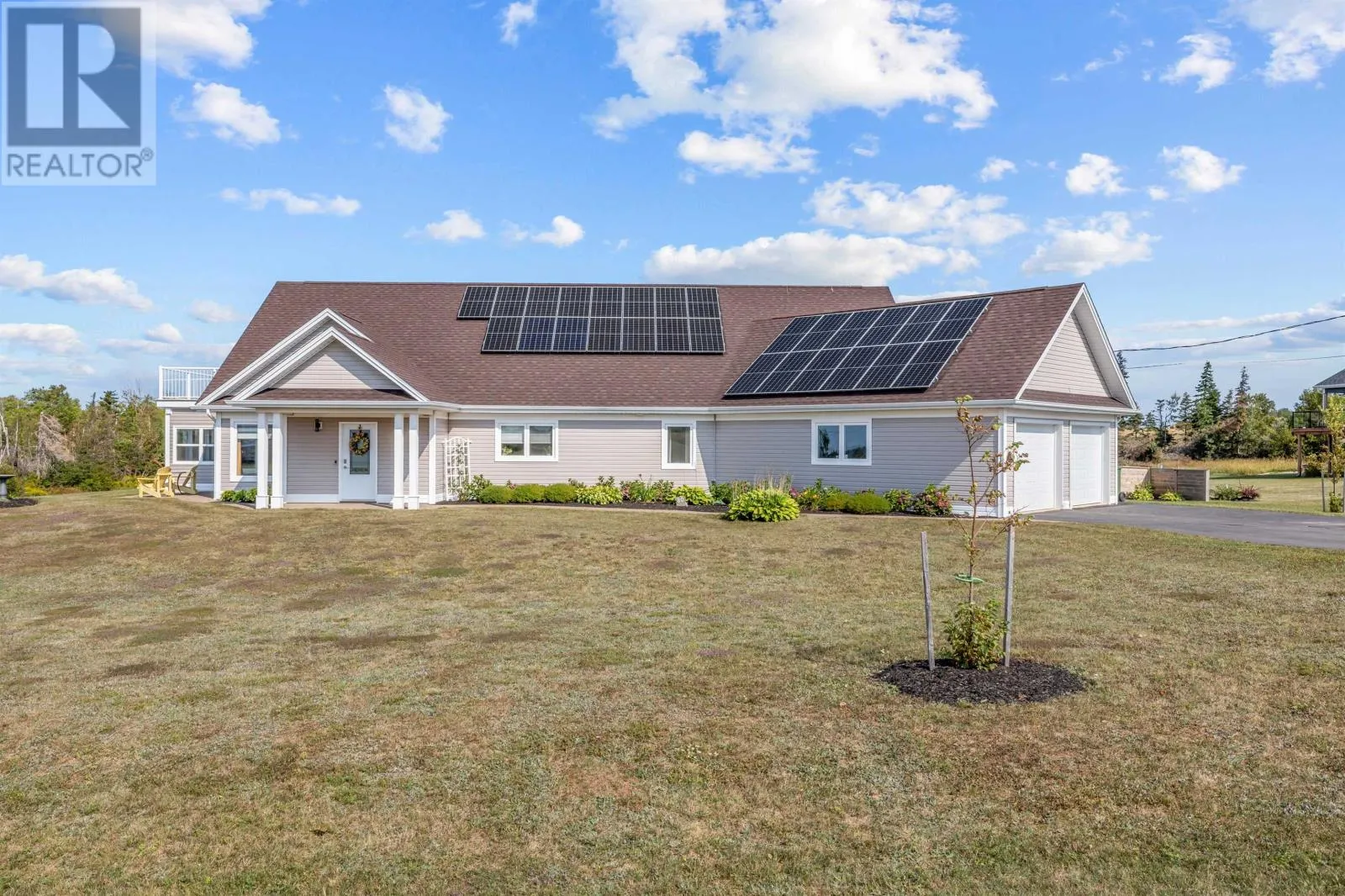Incredible home with panoramic views of Rustico Bay featuring deeded access to the water, mainfloor living with huge master with ensuite and walkin closet, 3 season sunroom, open concept stunning white kitchen with quartz countertop, spacious dining room and living room, home theatre room, 2nd bedroom, double car garage plus lawnmower garage door entry. High end features include solar, three new heat pumps, custom blinds. professional landscaping, updated sunroom (with new windows, doors, ceiling lights and new wood ceiling, exterior vinyl and trim), updated upstairs patio (new waterproof decking with new white side rails and all new glass panels facing the water, lights and new wiring installed on front and sides of railing) new shiplap wall with coat hooks and shelf in back entryway, new heat pump in upper level, new LG Fridge, new freestanding tub in ensuite, new piano window in masterbedroom and a new paved driveway with dog ear by Island Construction. This home also features a gas powered generator that has a dedicated transfer switch to its own breaker panel. Spectacular views and an easy 15 minute commute to Charlottetown this home has the best of both worlds! Solar Polaron lease $182.91 to be transferred to buyer upon possession. HOA fee $800 per year. Vendor is relative of the listing agent. All sizes are approximate. (id:27476)
