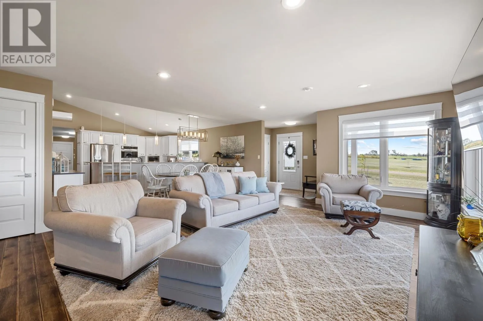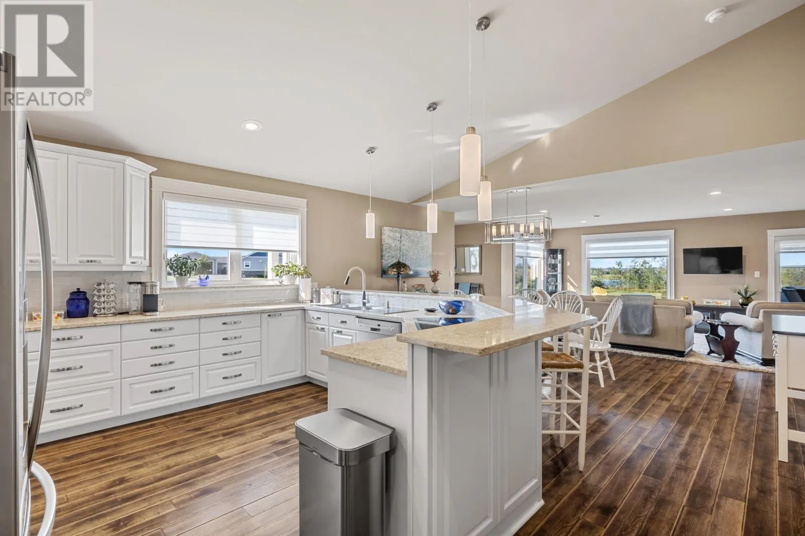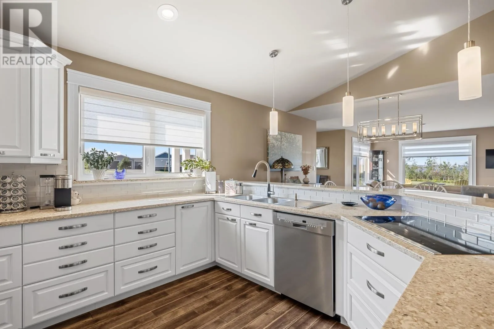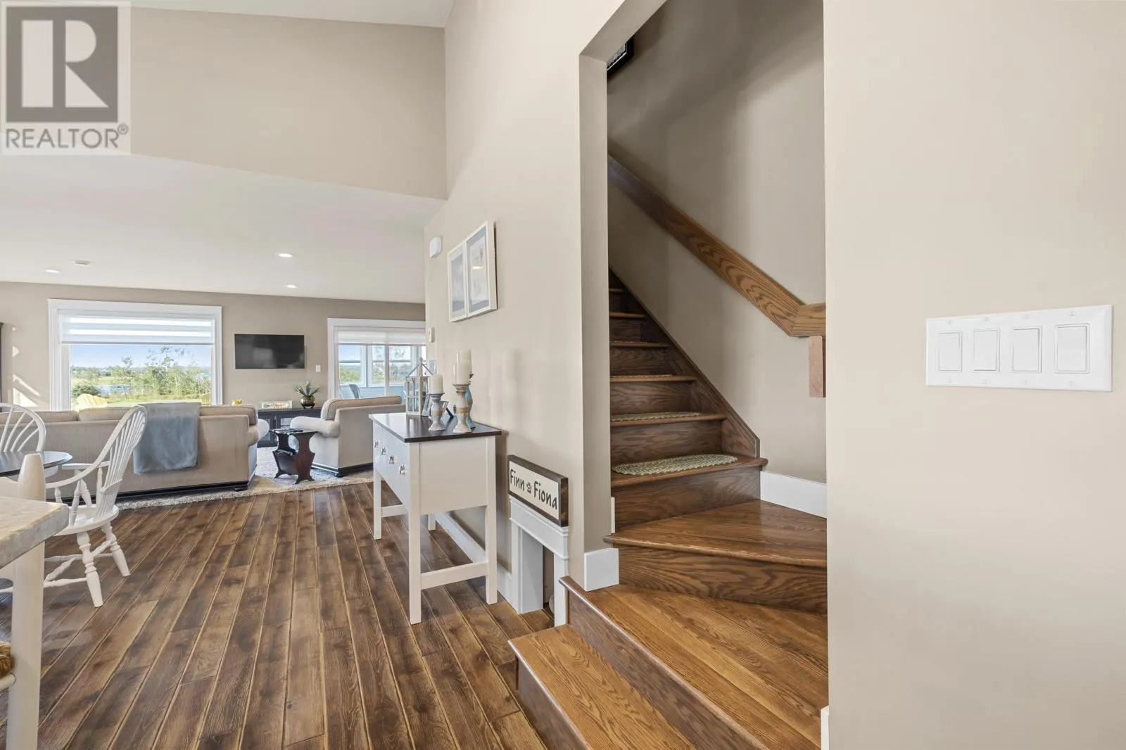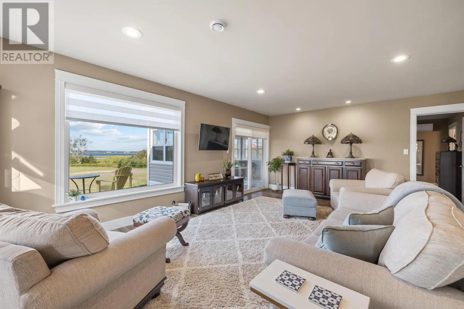 Incredible home with panoramic views of Rustico Bay featuring deeded access to the water, mainfloor living with huge master with ensuite and walkin closet, 3 season sunroom, open concept stunning white kitchen with quartz countertop, spacious dining room and living room, home theatre room, 2nd bedroom, double car garage plus lawnmower garage door entry. High end features include solar, three new heat pumps, custom blinds. professional landscaping, updated sunroom (with new windows, doors, ceiling lights and new wood ceiling, exterior vinyl and trim), updated upstairs patio (new waterproof decking with new white side rails and all new glass panels facing the water, lights and new wiring installed on front and sides of railing) new shiplap wall with coat hooks and shelf in back entryway, new heat pump in upper level, new LG Fridge, new freestanding tub in ensuite, new piano window in masterbedroom and a new paved driveway with dog ear by Island Construction. This home also features a gas powered generator that has a dedicated transfer switch to its own breaker panel. Spectacular views and an easy 15 minute commute to Charlottetown this home has the best of both worlds! Solar Polaron lease $182.91 to be transferred to buyer upon possession. HOA fee $800 per year. Vendor is relative of the listing agent. All sizes are approximate. (id:27476)