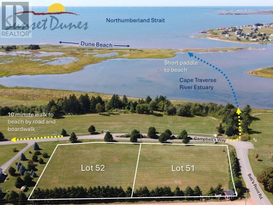 Could This Be PEI?s Best South Shore Beach? Welcome to Sunset Dunes?a private seaside community that may just offer the best beach experience Prince Edward Island has to offer. Nestled on a south-facing point into the Northumberland Strait, Sunset Dunes is known for its exclusive access, stunning homes, and above all, its beach. This 1.5 km stretch of sand is nearly rock-free, with warm, shallow waters perfect for swimming. Unlike public beaches, Sunset Dunes Beach is rarely crowded-even in peak summer-thanks to private community access. Picture sunbathing on quiet sandbars, kayaking along the nearby Cape Traverse River, and watching the sun dip below the horizon with the Confederation Bridge in view. It?s peaceful, beautiful, and remarkably private. The community lies less than 10 minutes from the Confederation Bridge and under 45 minutes to Charlottetown Airport. Whether you?re grabbing Cow?s Ice Cream in nearby Borden or enjoying seafood and theater in Victoria-by-the-Sea, everything you need is close by. Sunset Dunes is fully serviced with year-round paved access and shared green spaces-Lot 51 and Lot 52-each roughly one acre with direct sunset views over the Northumberland Strait and possibly two of the highest ground lots within the subdivision to build your dream home or vacation home on. Priced individually at $67,500 + HST, or this great deal offered in 2025 ONLY of $115,000 + HST if purchased together, this is a rare opportunity to own double the space at a significant discount. This is your chance to join a quiet, coastal community built around natural beauty, warm waters, and true island living. Secure your place at Sunset Dunes before these premium lots are gone. (id:27476)