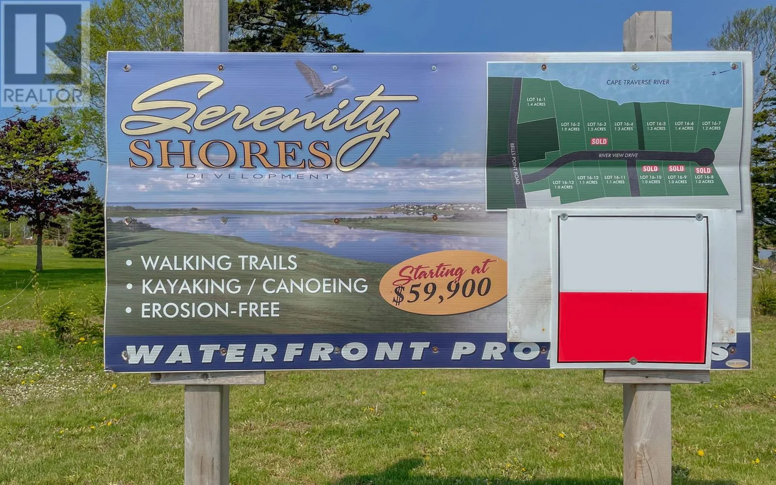 From Route 10 in Cape Traverse, turn right to Bells Point Road, then take a right into Serenity Shores. Are you looking to build your dream home or a luxury income property, look no further than Serenity Shores! Located 5 minutes from the Confederation Bridge, Serenity Shores is nestled away in a peaceful community with breathtaking waterfront and water view lots. Conveniently close amenity?s such as gas stations, coffee shops, groceries, brewery/liquor store and more, this subdivision has it all! Serenity Shores is accessible year round with a government maintained road with lots of amenities for you and your guests. Homeowners will find themselves kayaking, canoeing, or paddle boarding on the Cape Traverse river, trail hiking through 3 kilometers of beautifully manicured man made trails with custom outdoor campfire pits, outdoor kitchen, picnic tables with water views and more! With lot sizes ranging from 1 acre too 1.9, prices for water view lots are $75,000 + HST and waterfront lots vary from $122,000 - $203000+ HST, lots are surveyed, perc tested category 1 and category 2. Covenants and restrictions are in place to protect your investment with waterfront lots featuring underground power! Call today for more information! (id:27476)