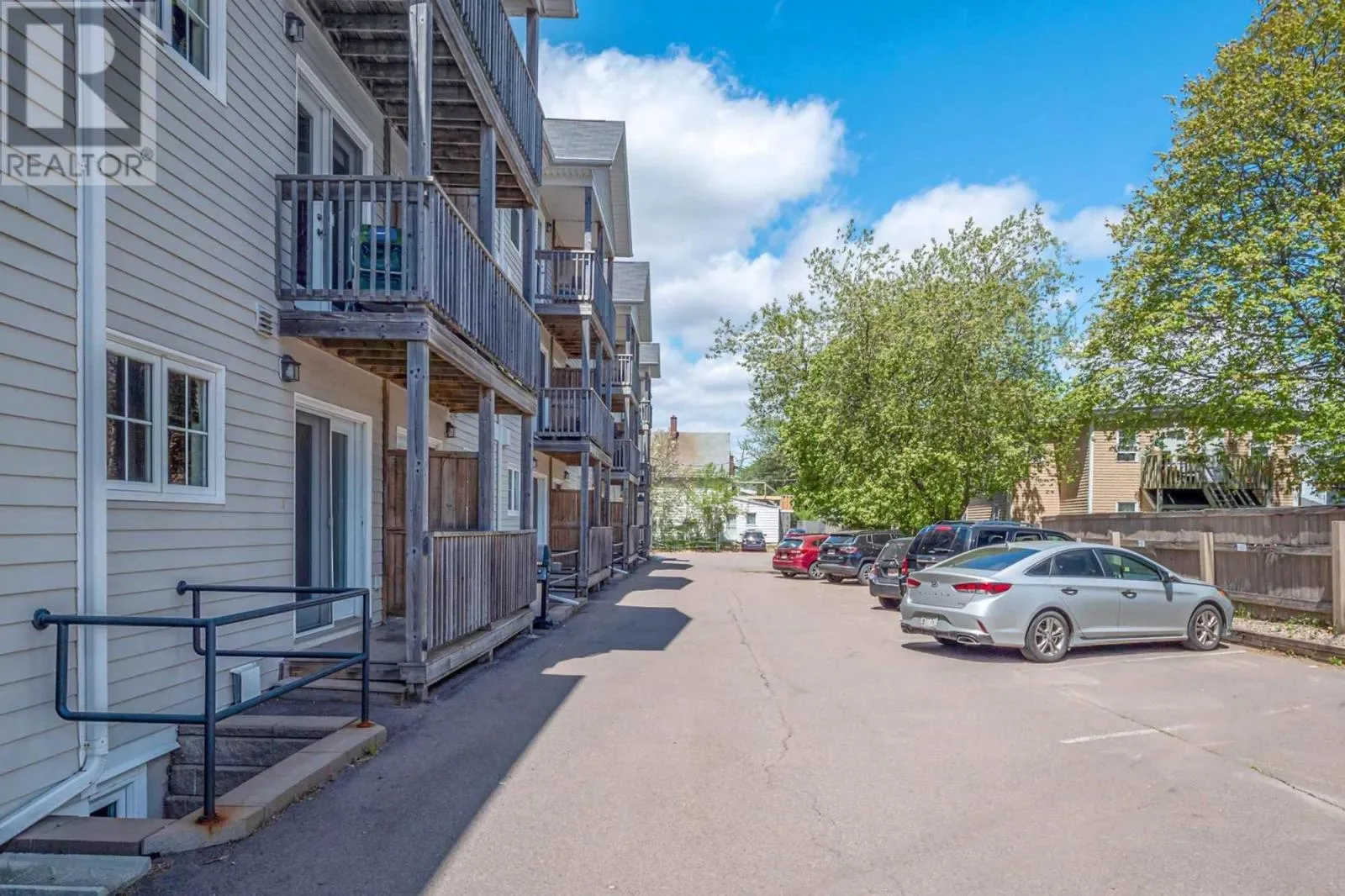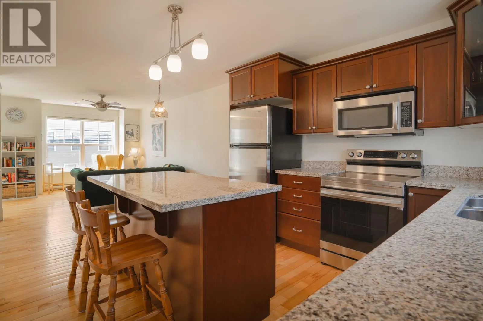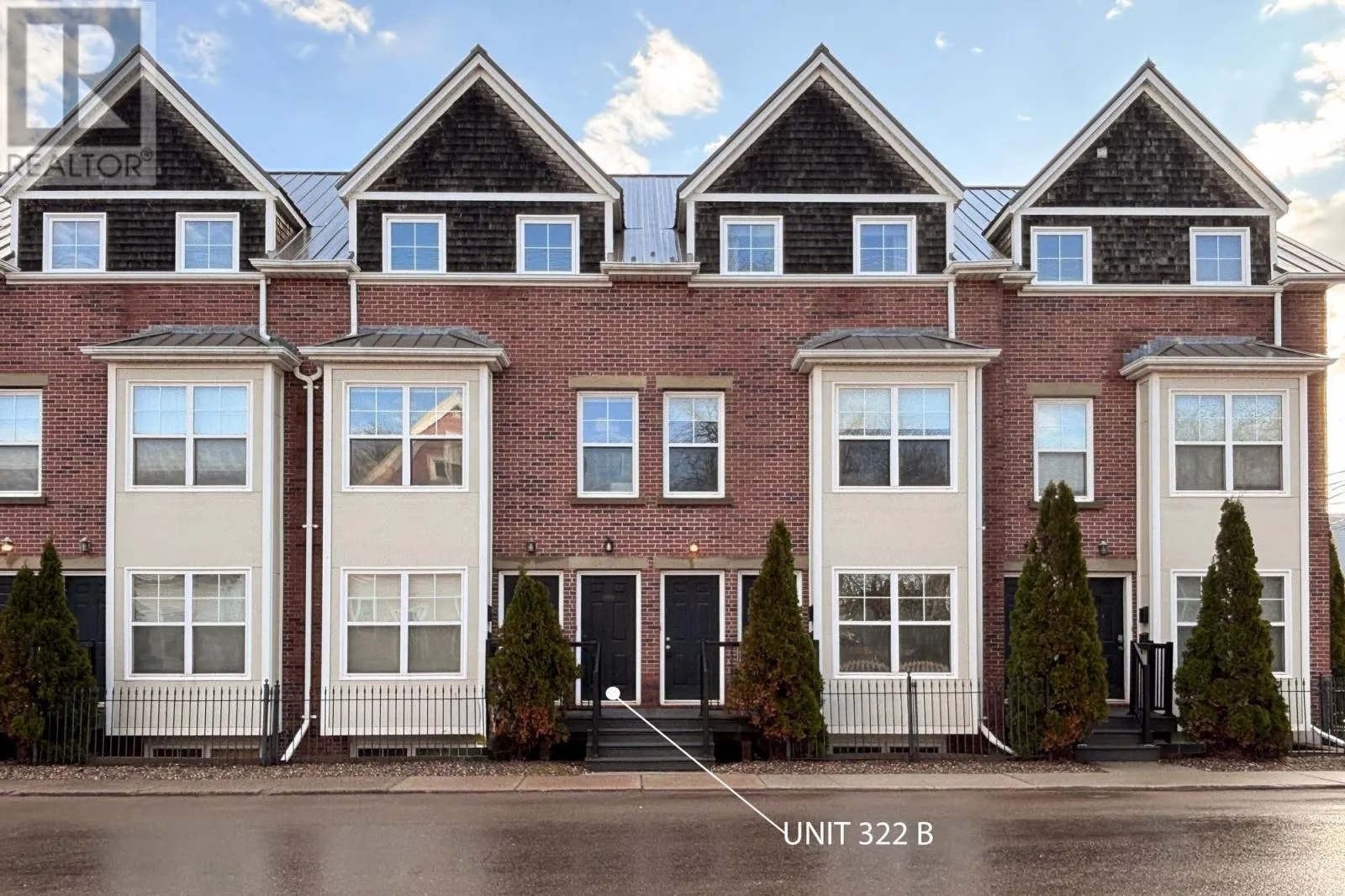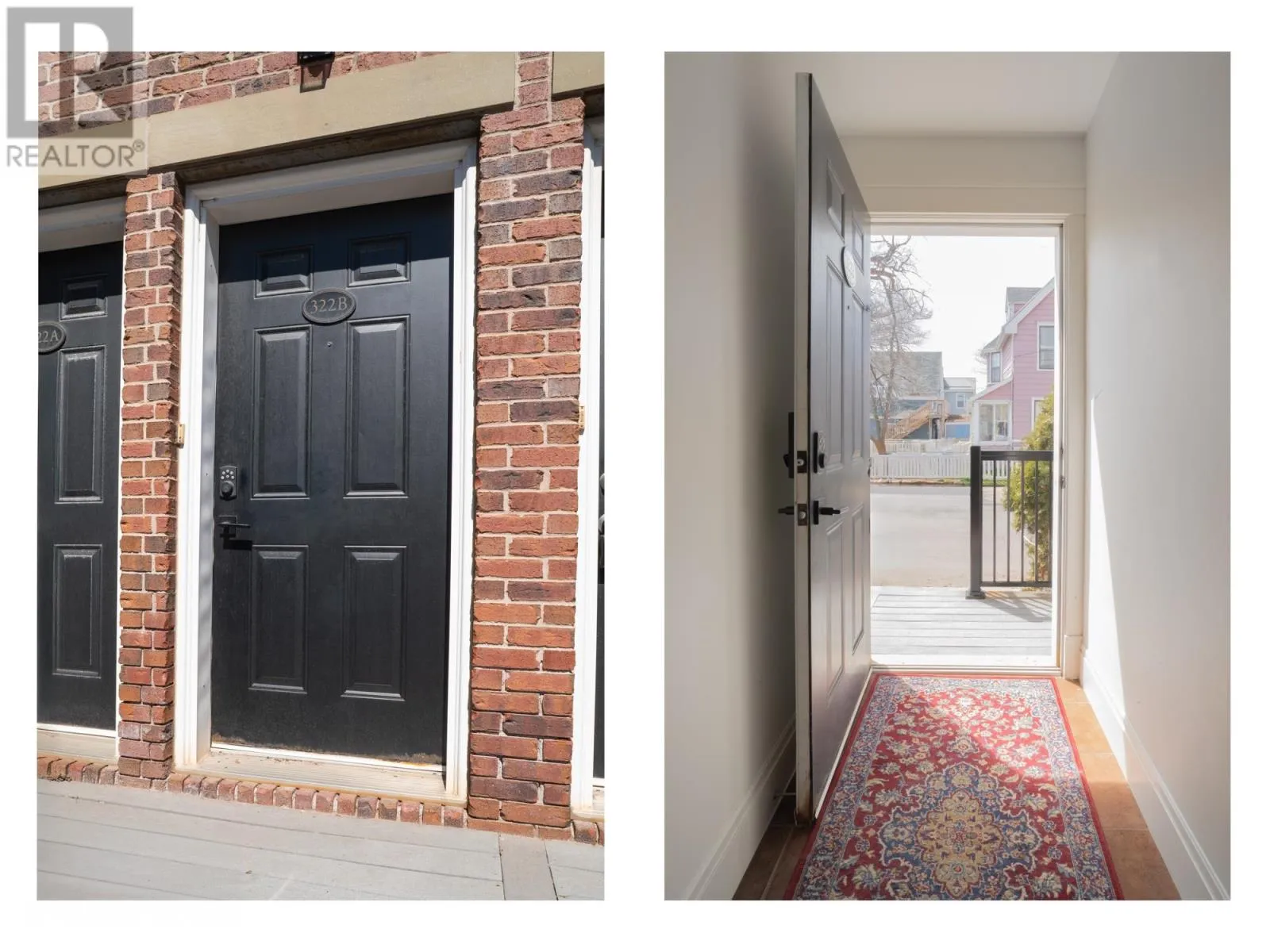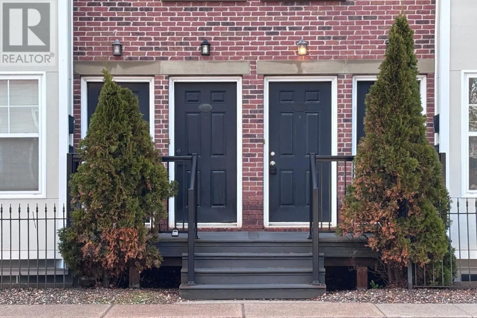322B Queen Street is a two-storey city residence with a private front entrance set just above street level, positioned within a row of classic downtown townhome style condos. The exterior is finished in red brick with cedar-shingled peaks, limestone detailing, and black iron fencing. A line of mature cedar trees adds rhythm and softness to the approach. Designated rear parking is included and discreetly placed away from view. Inside, the layout is efficient and grounded. Hardwood floors run throughout. The kitchen features solid hardwood cabinetry, granite countertops, a granite island with seating, and stainless steel appliances. The main floor opens into a bright living and dining area, with a front alcove well suited to a workspace or reading chair. A small private balcony extends off the kitchen. Upstairs are two bedrooms and a four-piece bath. The larger bedroom includes a double-door closet and built-in shelving. A second private balcony is accessed from the top landing. The bathroom continues the kitchen finishes with granite counters and matching cabinetry. Heating is fully electric. Monthly condominium fees of 265 cover snow removal, landscaping, and general exterior maintenance. The residence is pet friendly and located within walking distance to restaurants, cafes, business services, and the waterfront. This is a quietly composed downtown home with architectural presence, private entry, and direct access to the city's core. (id:27476)