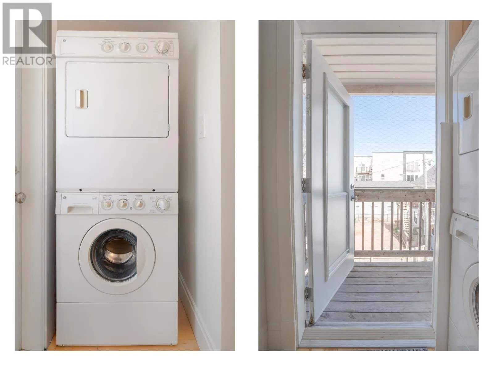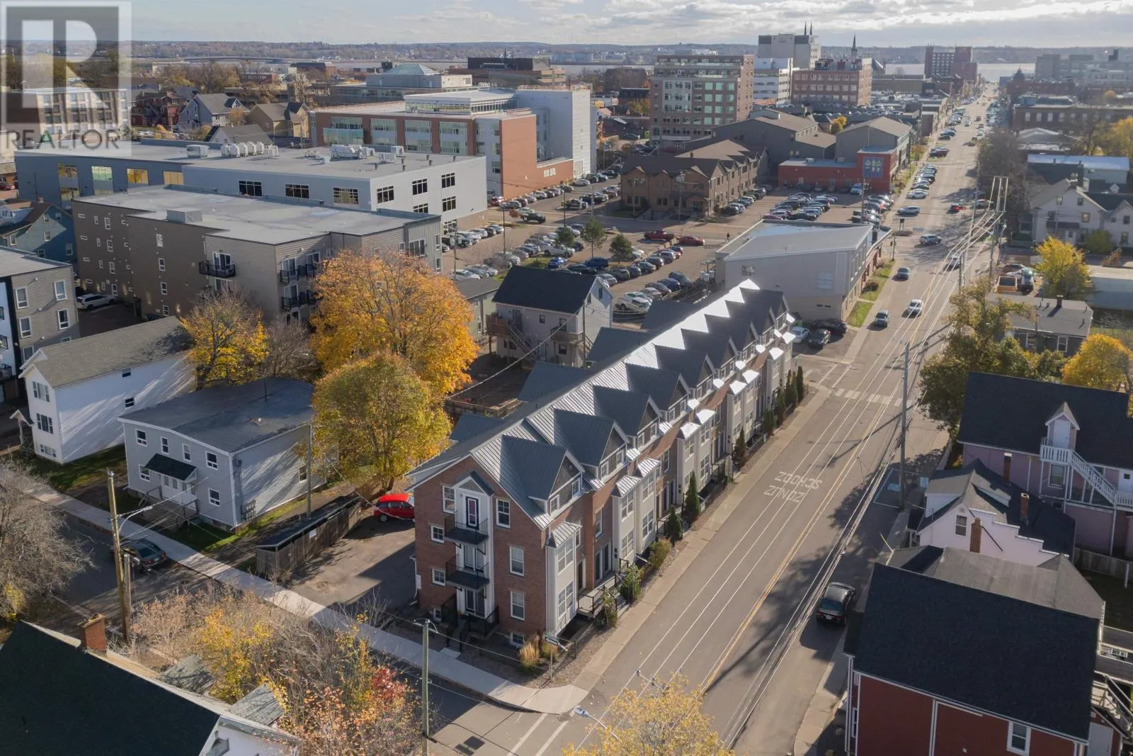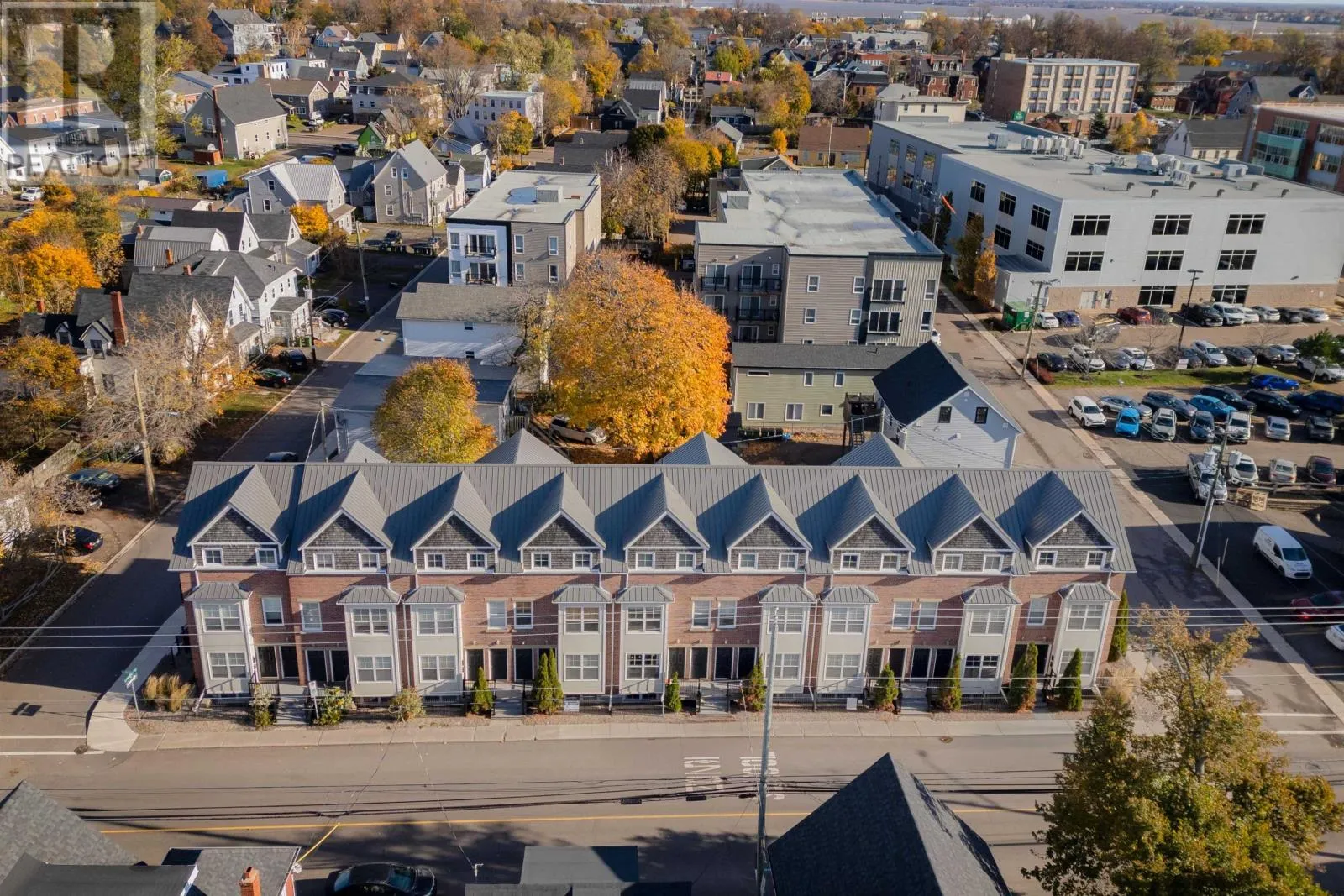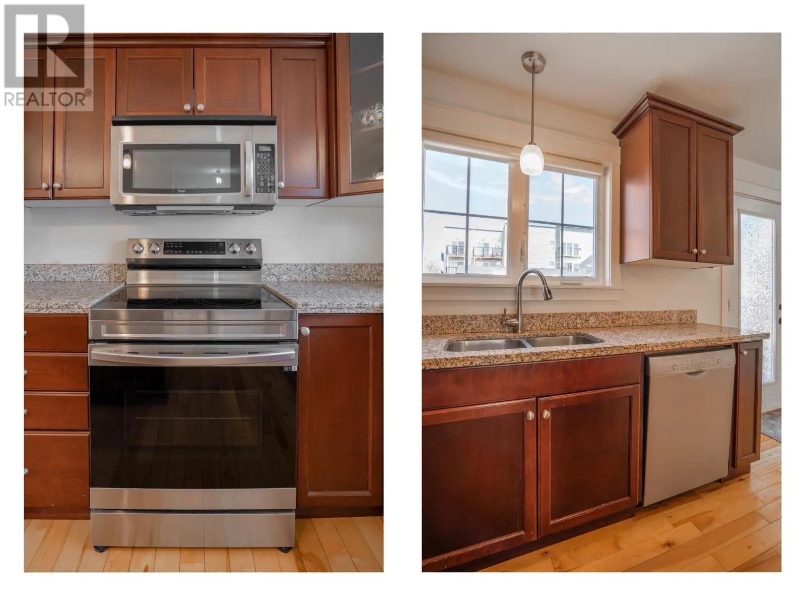 322B Queen Street is a two-storey city residence with a private front entrance set just above street level, positioned within a row of classic downtown townhome style condos. The exterior is finished in red brick with cedar-shingled peaks, limestone detailing, and black iron fencing. A line of mature cedar trees adds rhythm and softness to the approach. Designated rear parking is included and discreetly placed away from view. Inside, the layout is efficient and grounded. Hardwood floors run throughout. The kitchen features solid hardwood cabinetry, granite countertops, a granite island with seating, and stainless steel appliances. The main floor opens into a bright living and dining area, with a front alcove well suited to a workspace or reading chair. A small private balcony extends off the kitchen. Upstairs are two bedrooms and a four-piece bath. The larger bedroom includes a double-door closet and built-in shelving. A second private balcony is accessed from the top landing. The bathroom continues the kitchen finishes with granite counters and matching cabinetry. Heating is fully electric. Monthly condominium fees of 265 cover snow removal, landscaping, and general exterior maintenance. The residence is pet friendly and located within walking distance to restaurants, cafes, business services, and the waterfront. This is a quietly composed downtown home with architectural presence, private entry, and direct access to the city's core. (id:27476)