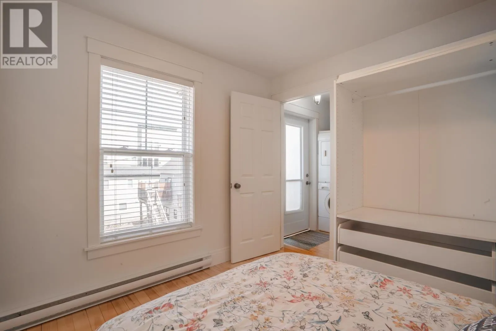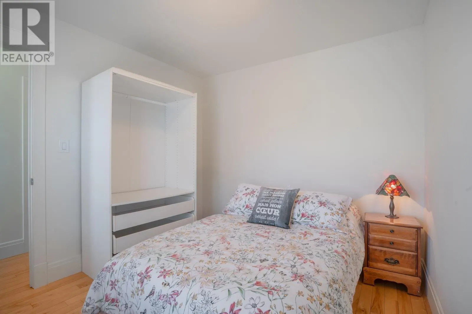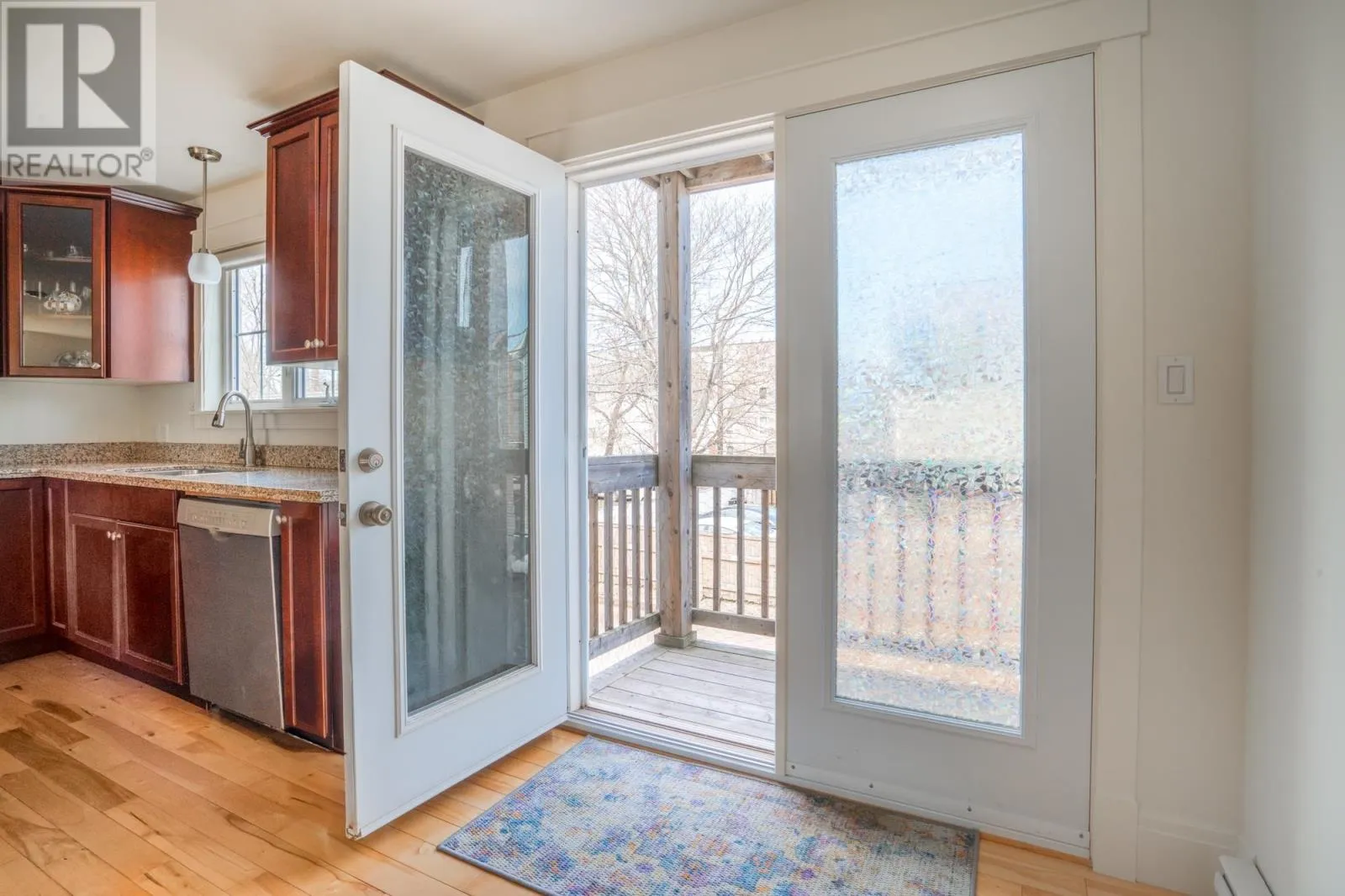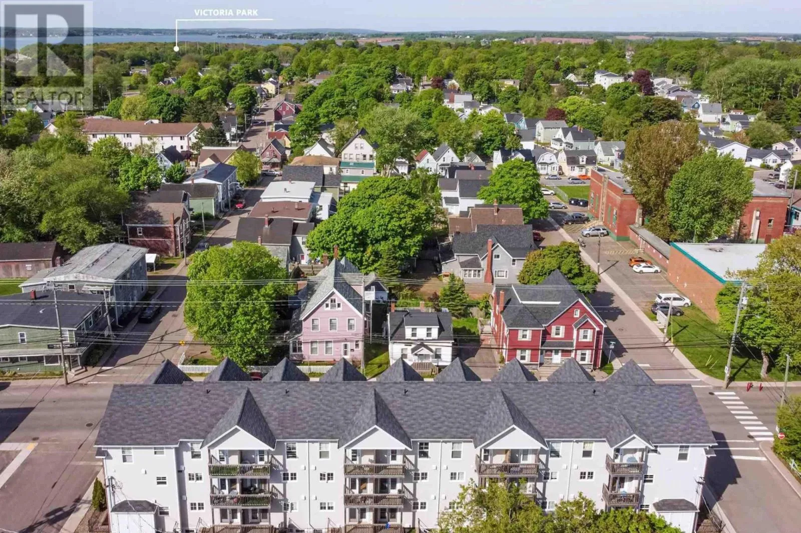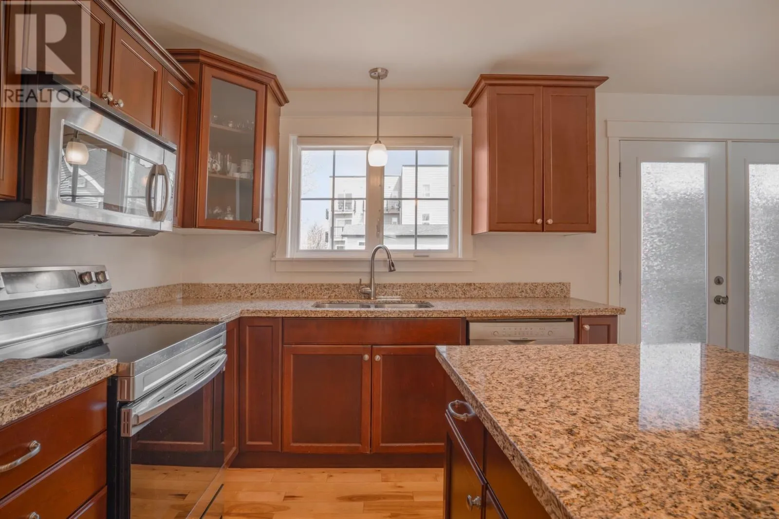 322B Queen Street is a two-storey city residence with a private front entrance set just above street level, positioned within a row of classic downtown townhome style condos. The exterior is finished in red brick with cedar-shingled peaks, limestone detailing, and black iron fencing. A line of mature cedar trees adds rhythm and softness to the approach. Designated rear parking is included and discreetly placed away from view. Inside, the layout is efficient and grounded. Hardwood floors run throughout. The kitchen features solid hardwood cabinetry, granite countertops, a granite island with seating, and stainless steel appliances. The main floor opens into a bright living and dining area, with a front alcove well suited to a workspace or reading chair. A small private balcony extends off the kitchen. Upstairs are two bedrooms and a four-piece bath. The larger bedroom includes a double-door closet and built-in shelving. A second private balcony is accessed from the top landing. The bathroom continues the kitchen finishes with granite counters and matching cabinetry. Heating is fully electric. Monthly condominium fees of 265 cover snow removal, landscaping, and general exterior maintenance. The residence is pet friendly and located within walking distance to restaurants, cafes, business services, and the waterfront. This is a quietly composed downtown home with architectural presence, private entry, and direct access to the city's core. (id:27476)