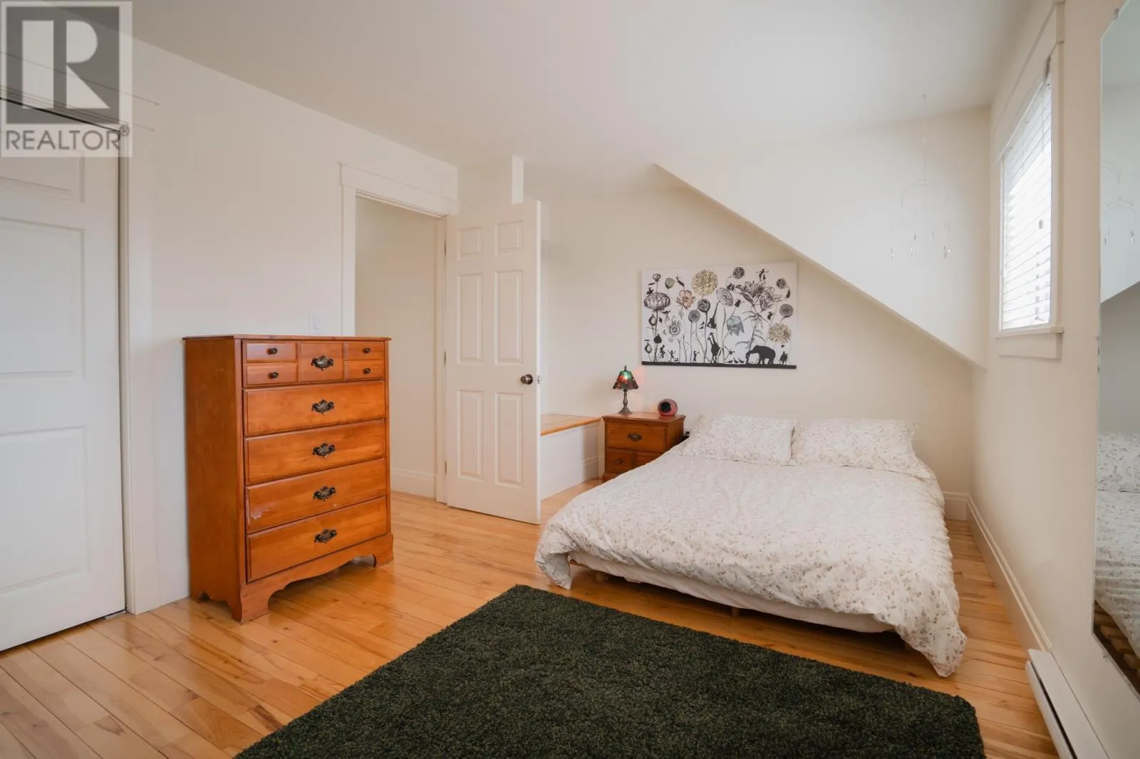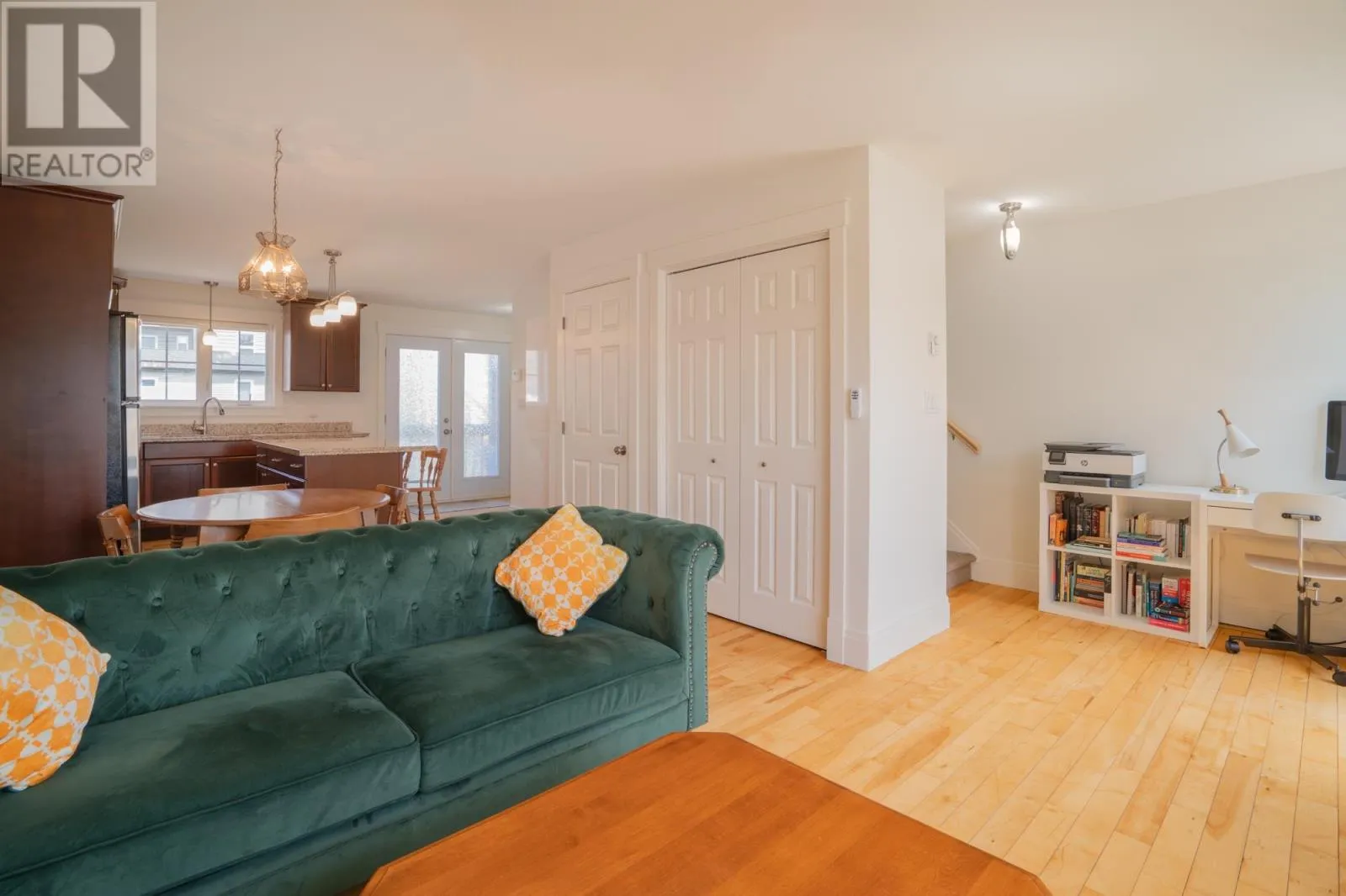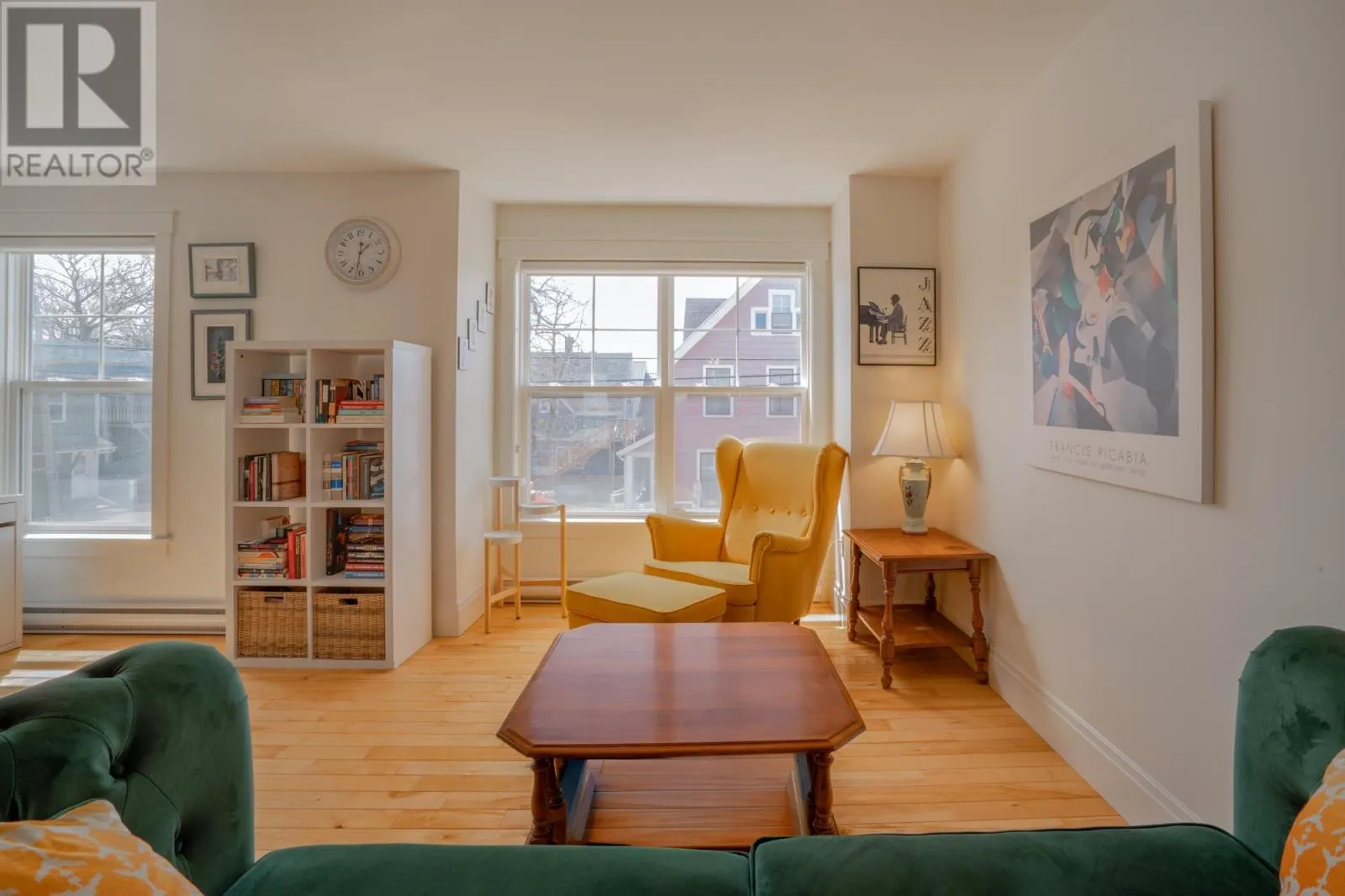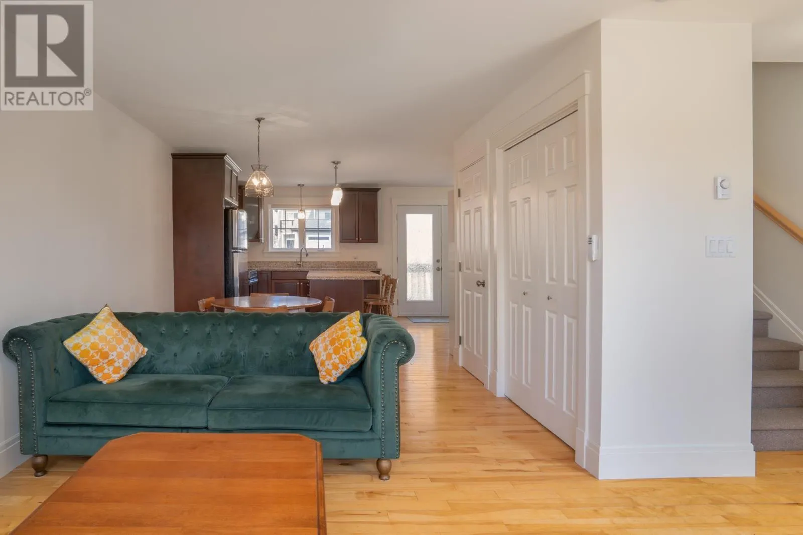 322B Queen Street is a two-storey city residence with a private front entrance set just above street level, positioned within a row of classic downtown townhome style condos. The exterior is finished in red brick with cedar-shingled peaks, limestone detailing, and black iron fencing. A line of mature cedar trees adds rhythm and softness to the approach. Designated rear parking is included and discreetly placed away from view. Inside, the layout is efficient and grounded. Hardwood floors run throughout. The kitchen features solid hardwood cabinetry, granite countertops, a granite island with seating, and stainless steel appliances. The main floor opens into a bright living and dining area, with a front alcove well suited to a workspace or reading chair. A small private balcony extends off the kitchen. Upstairs are two bedrooms and a four-piece bath. The larger bedroom includes a double-door closet and built-in shelving. A second private balcony is accessed from the top landing. The bathroom continues the kitchen finishes with granite counters and matching cabinetry. Heating is fully electric. Monthly condominium fees of 265 cover snow removal, landscaping, and general exterior maintenance. The residence is pet friendly and located within walking distance to restaurants, cafes, business services, and the waterfront. This is a quietly composed downtown home with architectural presence, private entry, and direct access to the city's core. (id:27476)