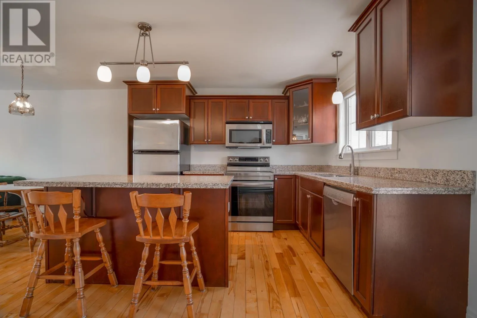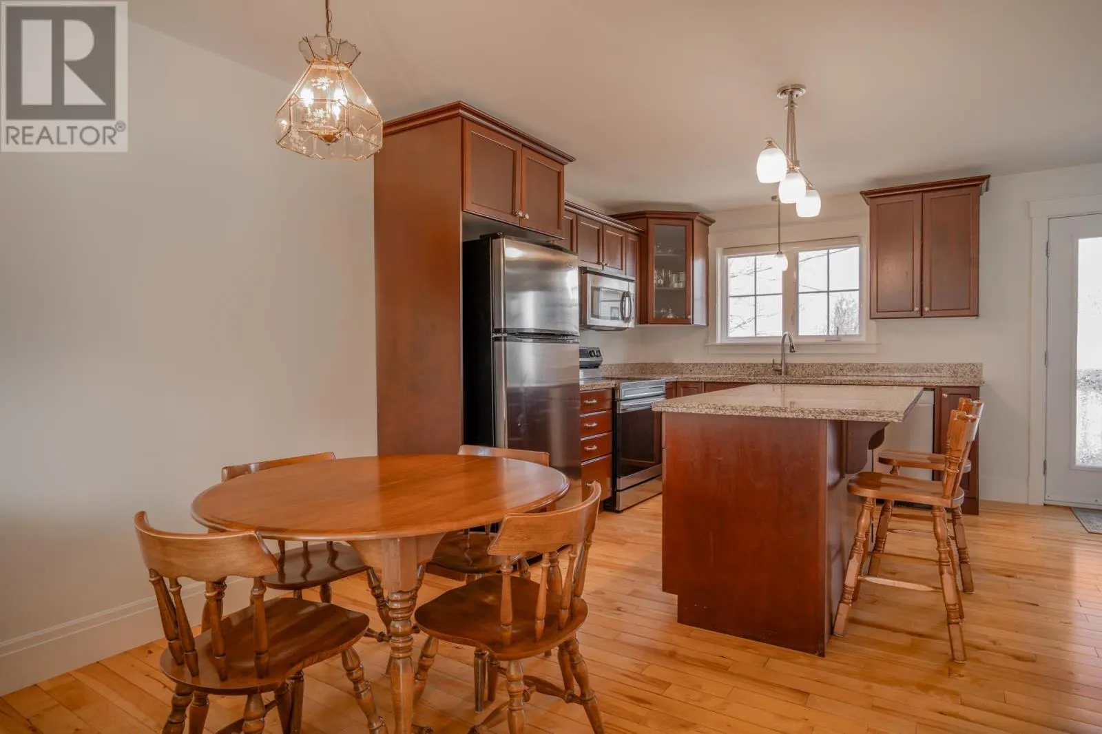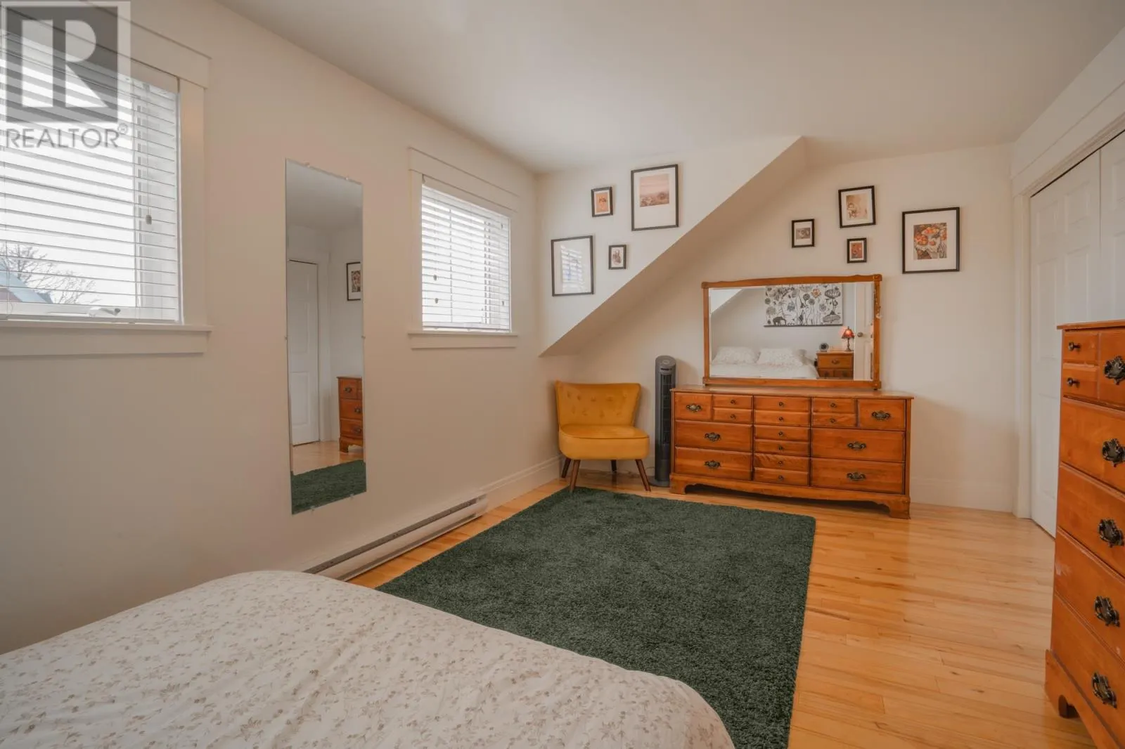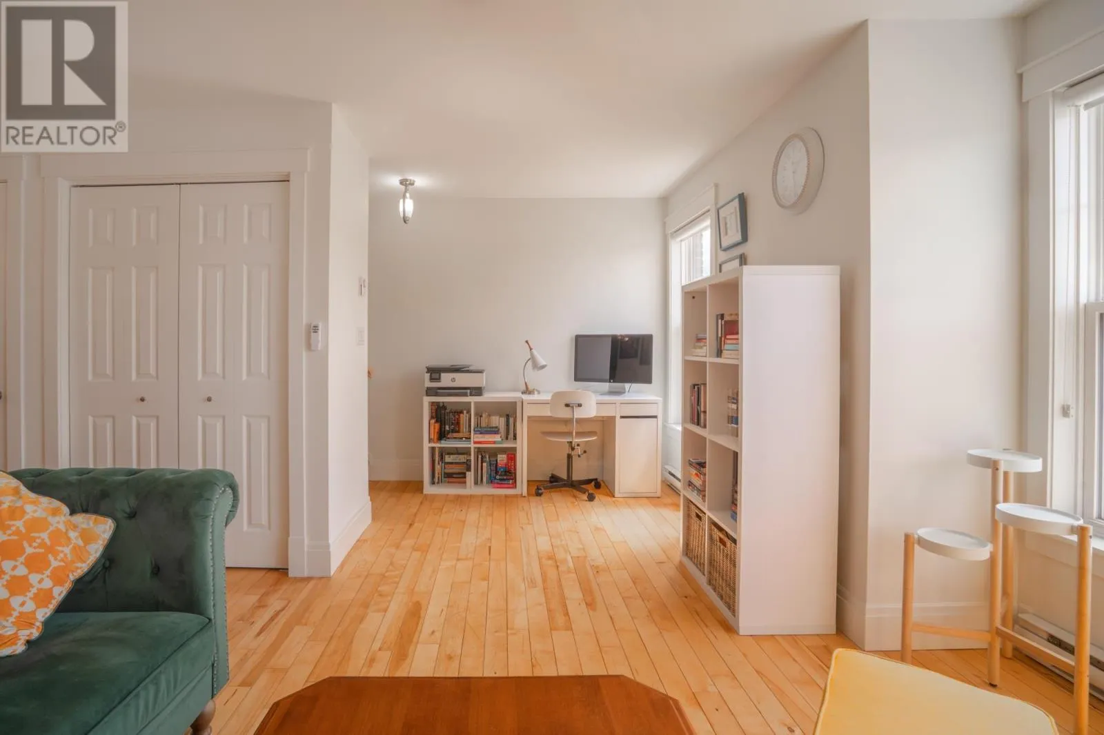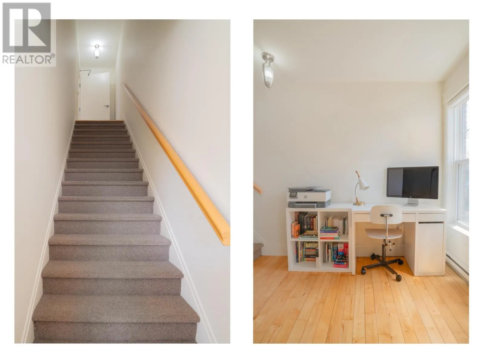 322B Queen Street is a two-storey city residence with a private front entrance set just above street level, positioned within a row of classic downtown townhome style condos. The exterior is finished in red brick with cedar-shingled peaks, limestone detailing, and black iron fencing. A line of mature cedar trees adds rhythm and softness to the approach. Designated rear parking is included and discreetly placed away from view. Inside, the layout is efficient and grounded. Hardwood floors run throughout. The kitchen features solid hardwood cabinetry, granite countertops, a granite island with seating, and stainless steel appliances. The main floor opens into a bright living and dining area, with a front alcove well suited to a workspace or reading chair. A small private balcony extends off the kitchen. Upstairs are two bedrooms and a four-piece bath. The larger bedroom includes a double-door closet and built-in shelving. A second private balcony is accessed from the top landing. The bathroom continues the kitchen finishes with granite counters and matching cabinetry. Heating is fully electric. Monthly condominium fees of 265 cover snow removal, landscaping, and general exterior maintenance. The residence is pet friendly and located within walking distance to restaurants, cafes, business services, and the waterfront. This is a quietly composed downtown home with architectural presence, private entry, and direct access to the city's core. (id:27476)