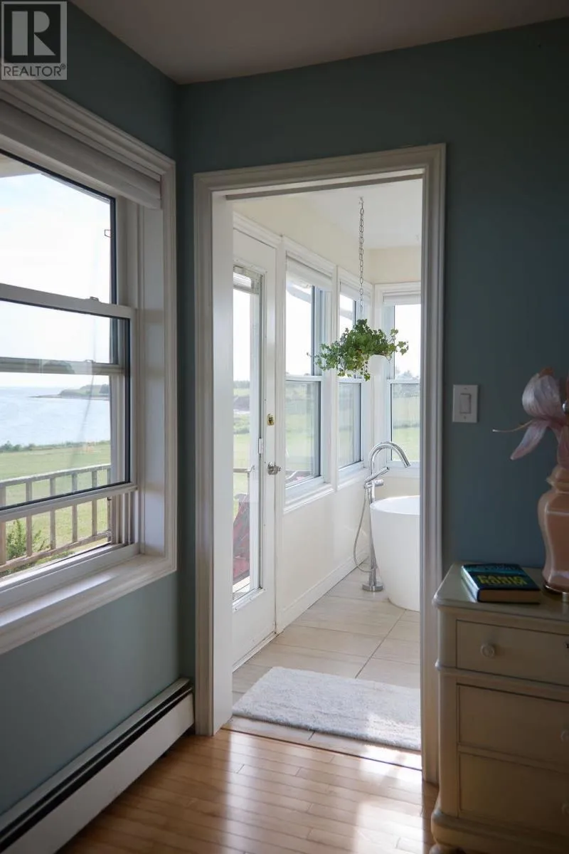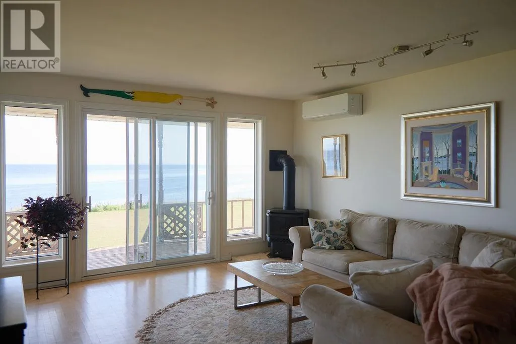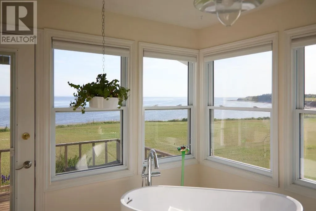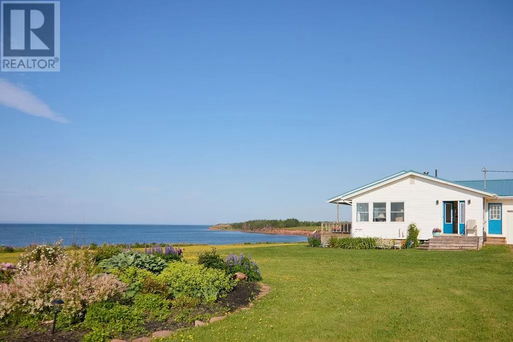 Nestled on 4.9 acres with nearly 500 feet of waterfront, this stunning Guernsey Cove property offers year-round coastal living with panoramic ocean views, lush gardens, a charming guest casita, and a peaceful East Coast lifestyle. A beautiful private lane leads to the main residence, setting the stage for the retreat-like setting that follows. Designed to celebrate its surroundings, the home features an expansive full-width deck perfect for coffee at sunrise or unwinding to the sound of the sea. Inside, oversized windows frame the ever-changing ocean views. The bayed dining area and bright kitchen with white cabinetry, stainless steel appliances, and built-in desk blend beauty and function. A cozy propane stove anchors the living room, and patio doors offer seamless indoor-outdoor flow. The primary bedroom features ocean views and a luxurious ensuite with rain shower and deep soaker tub. A second bedroom and three-piece bathroom complete the main floor. The lower level includes two additional bedrooms, a full bathroom, and large storage area?ideal for guests, office space, or future development. Steps away, the detached guest house offers an open-concept living and sleeping area, dining nook, kitchenette, four-piece bath, and large windows that mirror the main home's incredible views. Perfect for visitors, a creative studio, or peaceful retreat. The grounds are landscaped with mature greenery and vibrant blooms. Located minutes from the Wood Islands ferry, artisan shops, and beaches, this property offers the best of PEI waterfront living. (id:27476)