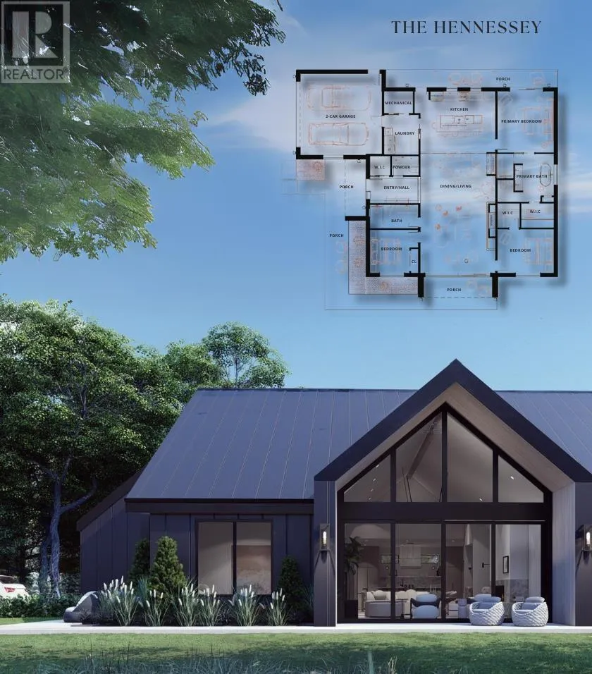 The Hennessey blends striking Scandinavian design with luxurious comfort in a one-level retreat overlooking Rustico Bay. Located in the exclusive Monarch Heights community in Rustico PEI, this 3-bedroom, 3-bath home sits on a .64-acre lot just 15 minutes from Charlottetown. A steep-pitched gable roof, black standing seam metal, and stone exterior give the home bold curb appeal. Inside, vaulted ceilings and floor-to-ceiling windows create a dramatic, light-filled living space. European sliding doors open to the outdoors, while a stunning propane fireplace anchors the living room with elegance and warmth. The designer kitchen features a waterfall quartz island, premium appliances, custom cabinetry, and a built-in coffee bar. The primary suite includes a walk-in closet, a private porch, and a spa like ensuite for everyday indulgence. ICF construction provides exceptional energy efficiency and structural integrity, with the opportunity for buyers to work with an award-winning designer to personalize select finishes. The Hennessey offers modern coastal sophistication - refined, resilient, and beautifully crafted. (id:27476)