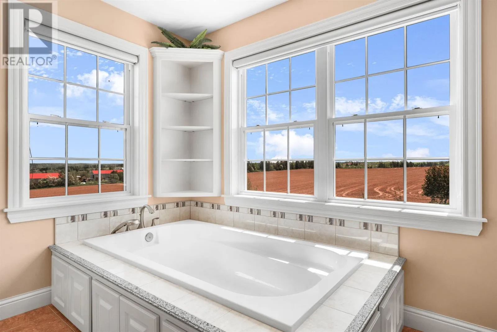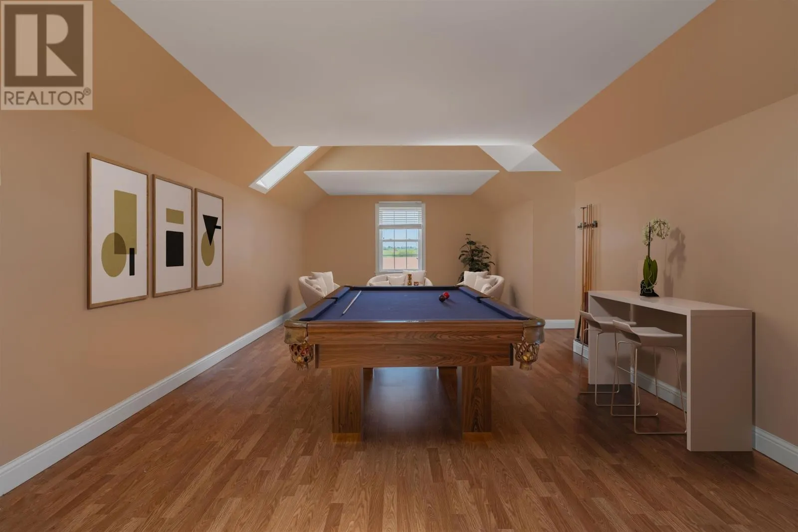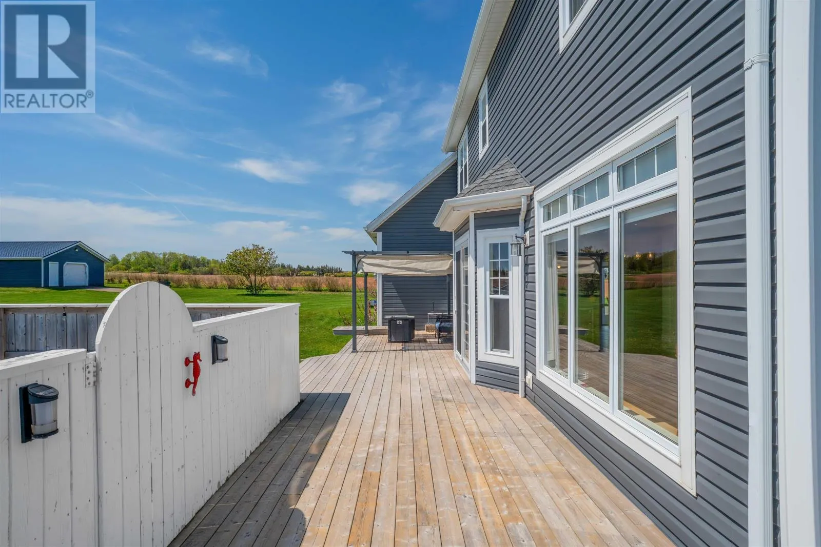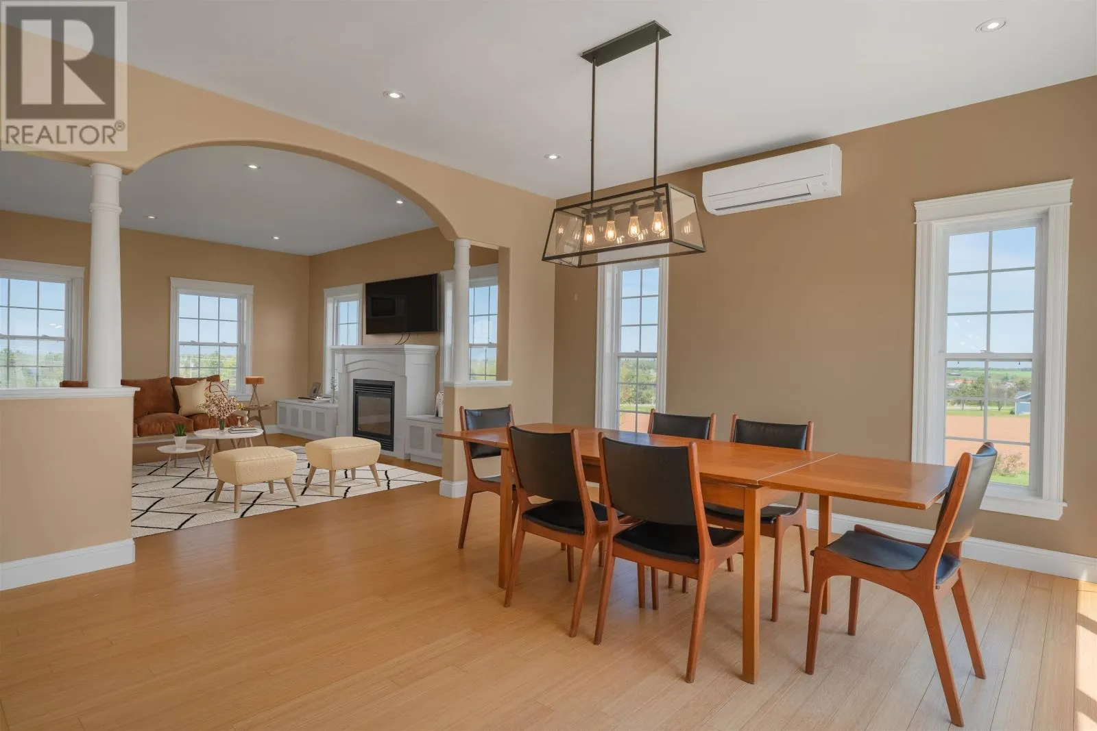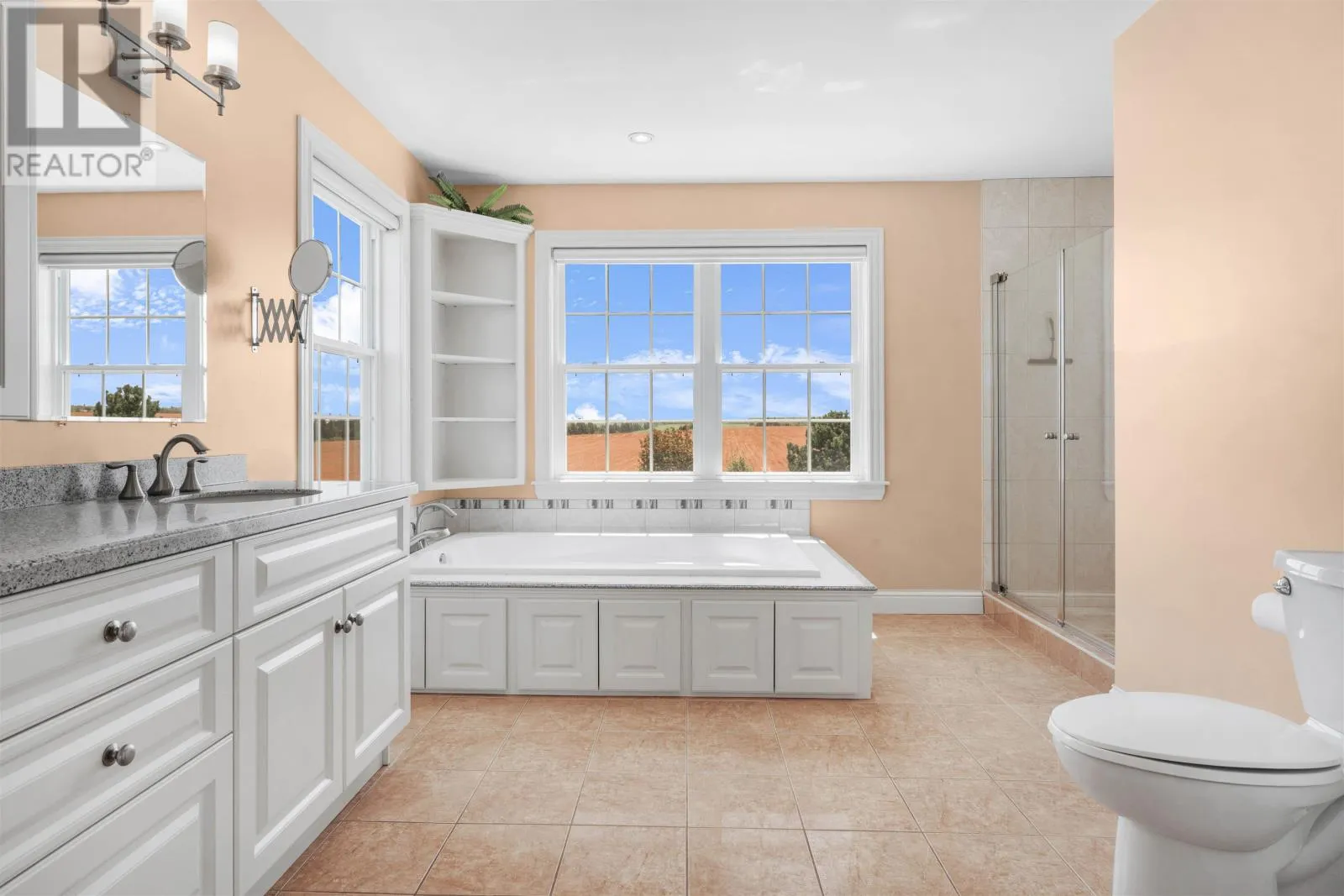 Set on a rise facing the still waters of St. Peters Bay, this estate was designed to feel both rooted and expansive. The approach is formal yet inviting, with clean architectural lines, mature landscaping, and an enduring sense of quiet elegance. Every element of the home has been shaped by function, proportion, and the light that moves across the property from morning to evening. Inside, the main level flows through a series of beautifully scaled rooms. The living room centres on a propane fireplace and opens into a dining area designed for gathering. A custom hardwood kitchen with detailed cabinetry and warm finishes anchors the space. The main floor also includes a dedicated laundry room and access to the heated three-car garage. Upstairs, the primary suite opens to a covered balcony overlooking the bay. The ensuite features a deep soaking tub beneath picture windows and a glass walk-in shower finished with tile. A full dressing room offers generous storage. Two additional bedrooms share the upper floor, along with a full bathroom. The vaulted bonus room above the garage is filled with natural light and offers flexibility for use as a fourth bedroom, studio, or retreat. The lower level includes a half bath and partially finished space with potential for cinema, gym, or additional living. The home is heated with a geothermal system and four ductless heat pumps across five zones. A detached garage offers additional storage or workshop potential. The grounds are bordered by mature trees and curated perennial beds. A heated pool and pergola create an outdoor atmosphere of leisure and refinement. Located minutes from the Nordic Spa and the protected shoreline of Greenwich, this is a property that brings together coastal clarity and lasting architecture. (id:27476)