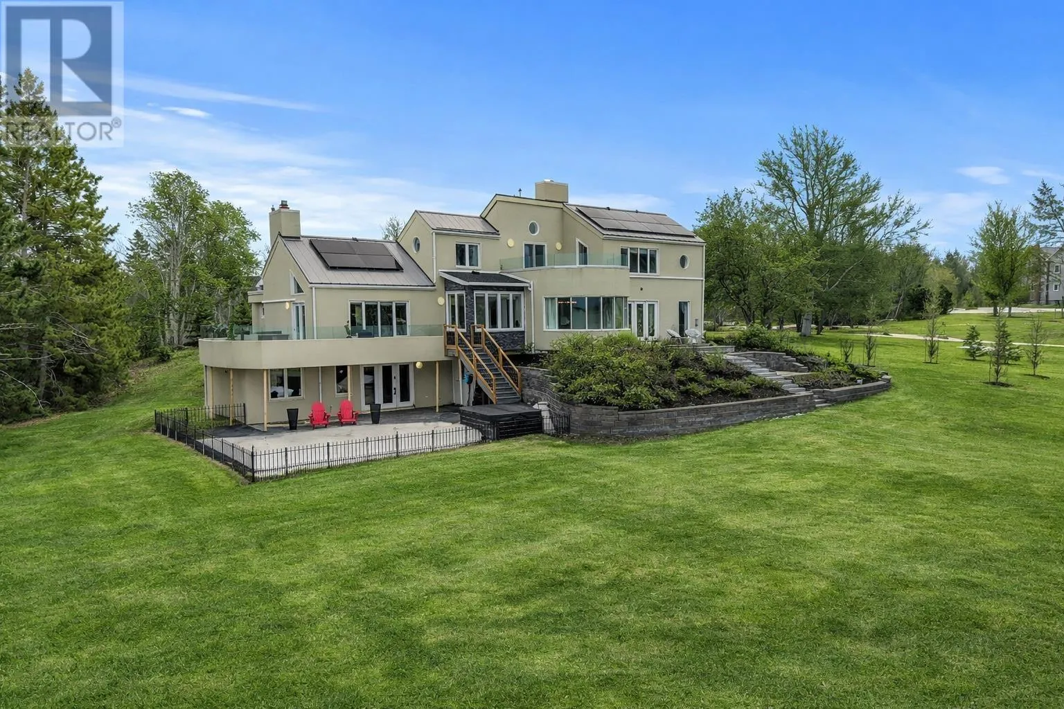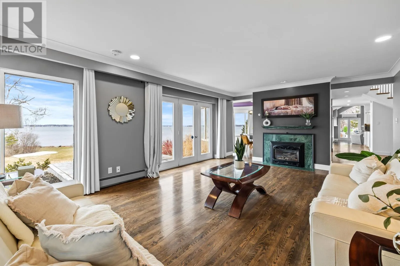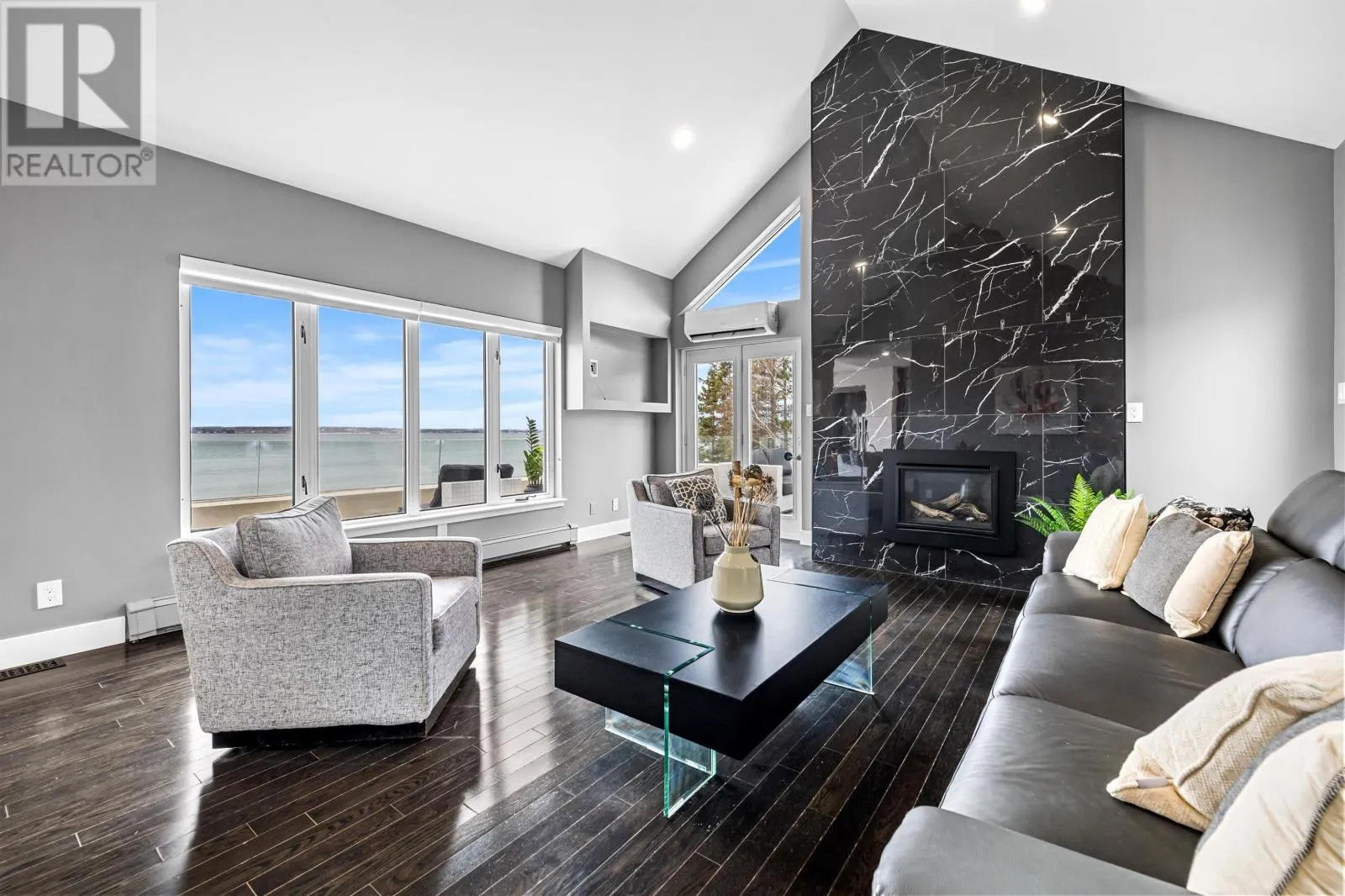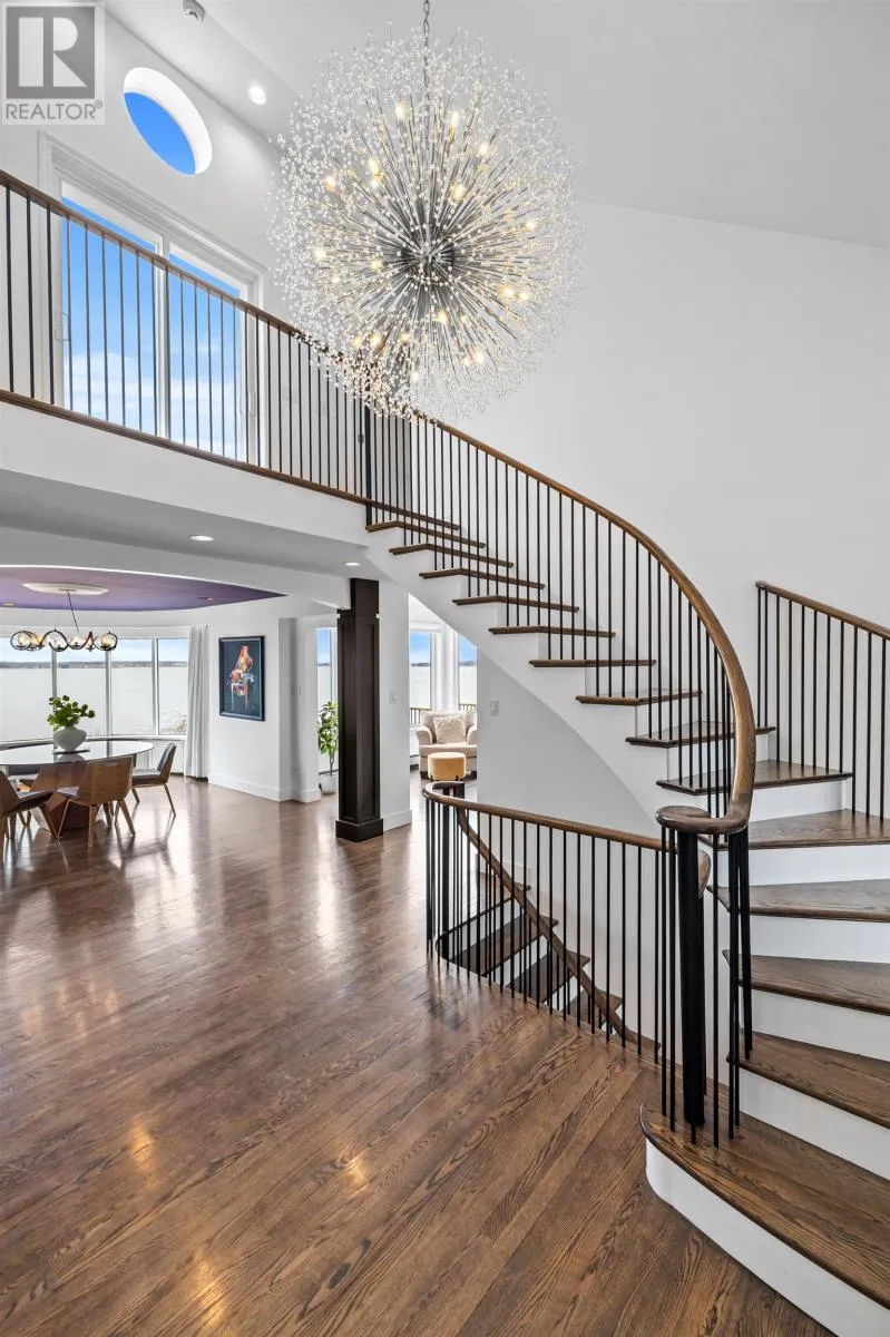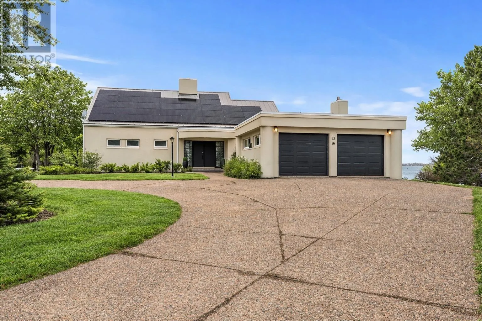 Welcome to 28 Battery Point Road, a private waterfront estate set on a full acre with 155 feet of exclusive shoreline in one of Stratford's most coveted enclaves. Custom-built and meticulously maintained, this landmark residence offers more than 4,000 square feet of refined living across three levels: five bedrooms, four bathrooms, a fully self-contained in-law suite, a double garage with a workshop, and sweeping water views from virtually every room. Step through the double-door entry into a grand foyer where a sweeping staircase and a stunning contemporary chandelier frame the Charlottetown city skyline, stretched across the harbour. Tall ships, cruise liners, and pleasure craft pass your front yard like a season-changing living painting. A sunken family room with a floor-to-ceiling marble gas fireplace and dark oak floors anchors the space. A formal living room with generous windows draws light through the day. A separate dining room with warm natural light on three sides. The updated kitchen features quartz counters, abundant cabinetry, and ample prep space. Every room opens directly onto the expansive wraparound deck system. On the second level, the grand primary suite includes a spa-inspired ensuite, a dedicated office or dressing room, and private patio access, all with views of the harbour and city lights. The fully finished lower level functions as a luxury in-law suite. It features two bedrooms, a dressing room, a full kitchen with quartz counters, granite island, gas fireplace, and double patio doors that open directly onto a private stone deck with a hot tub. A renovated laundry room, dedicated gym, and generous storage complete the level. Outside, a granite staircase, mature oaks, large blue spruce, extensive gardens, stone hardscaping, erosion control, solar panels installed in 2025, a propane generator, and new leaf guard gutters. A full renovation history is available upon request. 28 Battery Point Road is mov (id:27476)