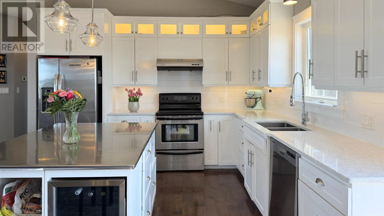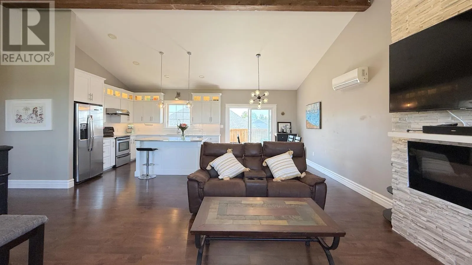 Every detail of this custom-built home has been thoughtfully curated to deliver both refined elegance and everyday functionality. From high-end fixtures to meticulously selected finishes, superior craftsmanship is evident throughout. Upstairs, an open-concept living space welcomes you with abundant natural light?perfect for both relaxed living and stylish entertaining. The gourmet kitchen is a standout, featuring custom cabinetry, sleek stone countertops, and a one-of-a-kind stainless steel island complete with a built-in microwave and wine cooler. A dramatic floor-to-ceiling stone mantel houses an inset electric fireplace, creating a cozy focal point in the living area. An exposed wood beam stretches across the cathedral ceiling, adding rustic charm and architectural interest. The remainder of the upper level boasts soaring nine-foot ceilings, enhancing the sense of space and airiness. The main bathroom offers a spa-like retreat, with a luxurious soaker tub, fully tiled walk-in shower, and double vanity?perfect for unwinding in style. The lower level is designed with versatility in mind, featuring a spacious rec room with a built-in HD projector and walkout garden doors that lead to the backyard. A fourth bedroom with French doors and an adjacent stylish three-quarter bathroom provides a comfortable and private space for guests or family. Sustainability and smart technology elevate this home even further. Energy-efficient solar panels reduce the carbon footprint, while upgraded smart light switches (Google Home compatible) allow you to create personalized scenes and automations. An EV charger receptacle (240V 20A) has also been installed?ready for your electric vehicle. This thoughtfully designed home offers the perfect blend of luxury, comfort, and future-ready features. Solar Panel Loan to be assumed by Buyer(s) at closing. A must-see for discerning buyers. (id:27476)