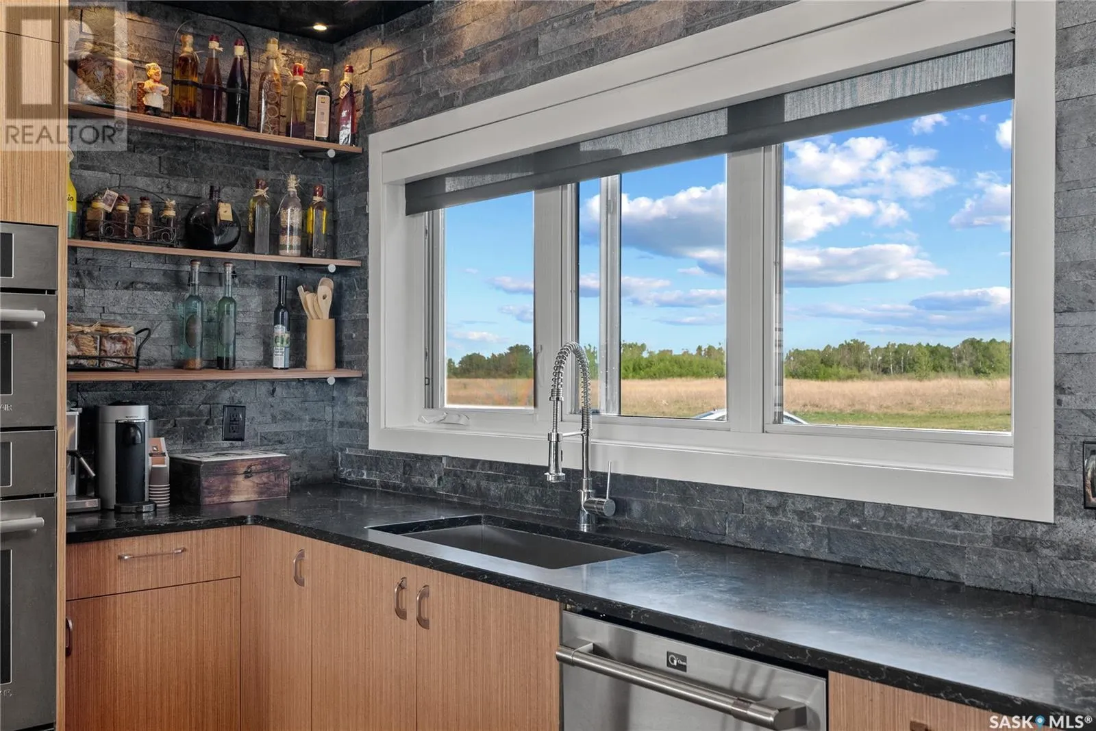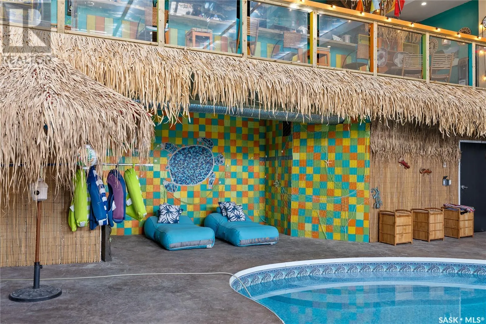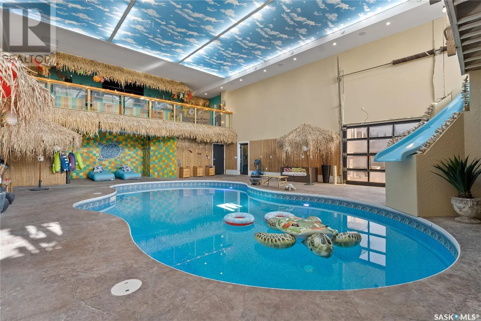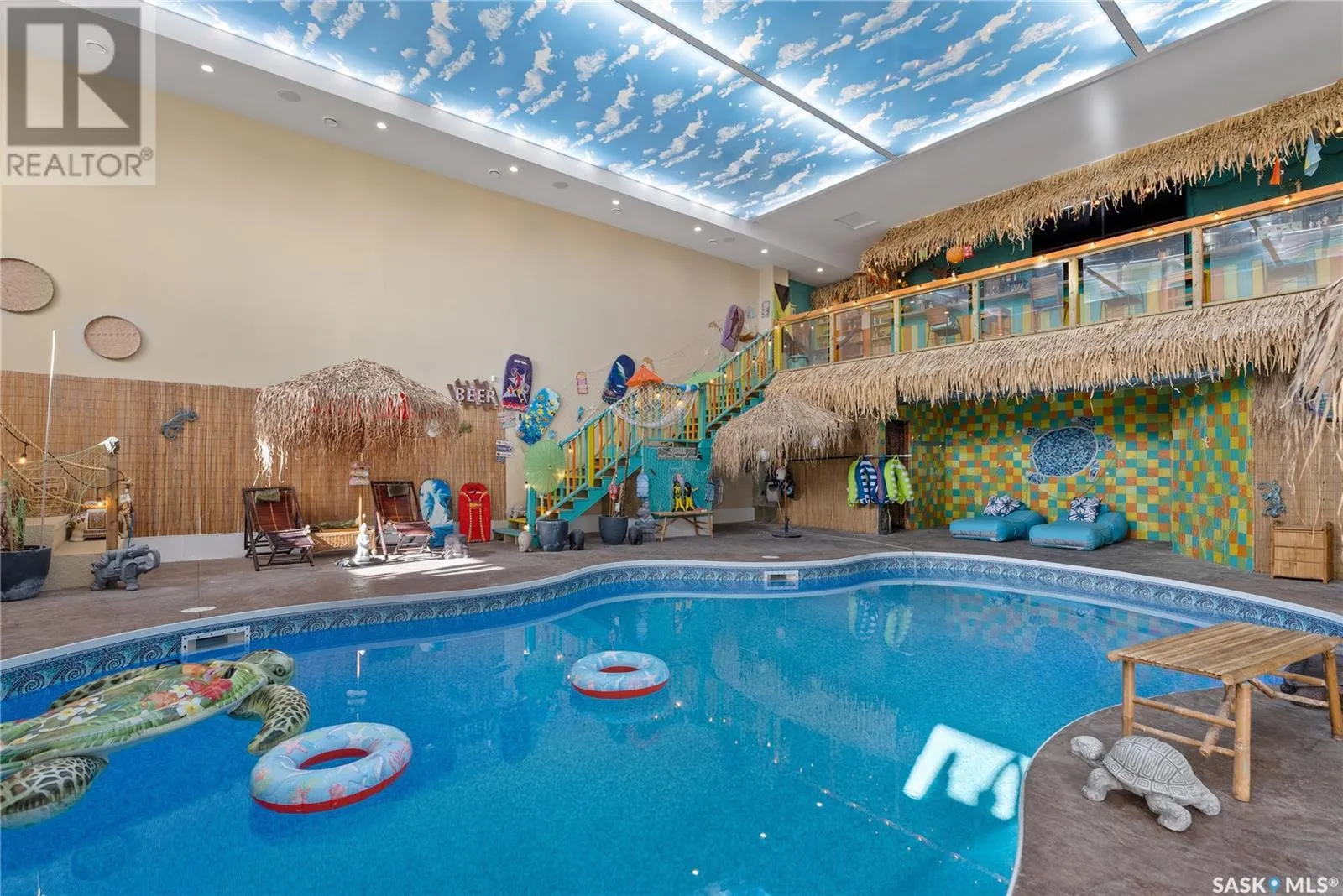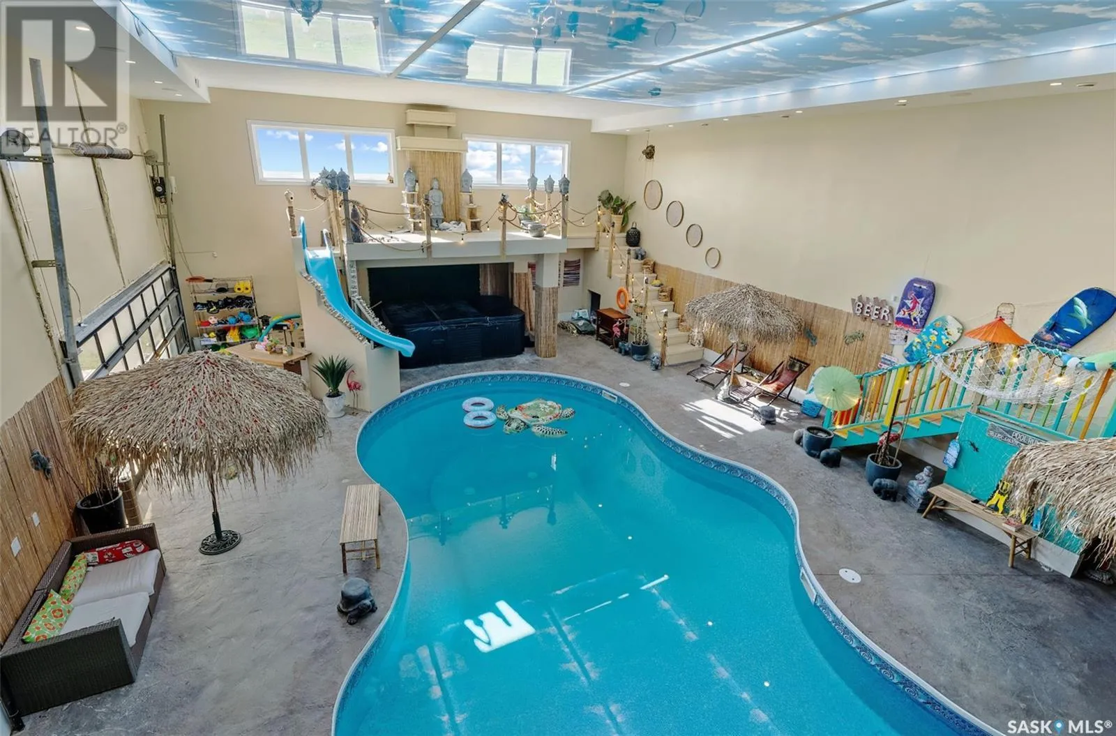 EXTRAORDINARY GATED ESTATE â WALKOUT BUNGALOW WITH ATTACHED INDOOR RESORT-STYLE POOL COMPLEX Prepare to be amazed by this 2,583 sq ft walkout bungalow on 5 GATED acres minutes east on Bergheim Road (Mission Ridge). With pavement to the door, stately iron gates, and an impressive asphalt drive, this property welcomes you with curated luxury. A custom modern interior fountain sets the tone for whatâs to come. The main floor boasts a spectacular layout, including a dream kitchen, grand living and dining areas, den, 3 beds, 3 baths, laundry room, and an incredible primary suite. The kitchen features: ⢠Commercial glass-front cooler ⢠Viking and JennAir prof appliances ⢠Gas cooktop, double wall ovens ⢠Tall ceilings w/clerestory windows ⢠Stone backsplash, full-height cabinetry ⢠Large peninsula eating bar The great room stuns with a stone wall and a linear gas fireplace, 2 lounge areas, deck access. The expansive primary suite offers a spa-like experience with an extensively tiled ensuite, inset tub, oversized walk-in shower, dual vanities, and huge walk-in. Downstairs, enjoy 2,500 sq ft of finished space: ⢠3 more bedrooms, 2 full bathrooms ⢠Family+games room ⢠Professional ultimate theatre and gym AND THEN THEREâS THE RESORT⦠An attached 2,000 sq ft indoor pool complex with soaring ceilings, a saltwater pool w/ lights and waterslide, massive hot tub, full bar with 4 TVs, yoga loft, bathroom, hi tech specialized mechanical, glass overhead door to a deck, stamped concrete throughout. Simply paradise â no vacation needed! Outside: 5 scenic acres landscaped/rockscaping, decks and patios with panoramic prairie vistas Additional features:Triple attached garage, Smart home system w/speakers, 12-camera security, 400 amp service, interior by Atmosphere Design, auto blinds, tall ceilings w/clerestory windows, Forced air + boiler, in-floor heat garage and lower level. This home is unmatched in design and lifestyle. Floor plans in supplements. (id:27476)