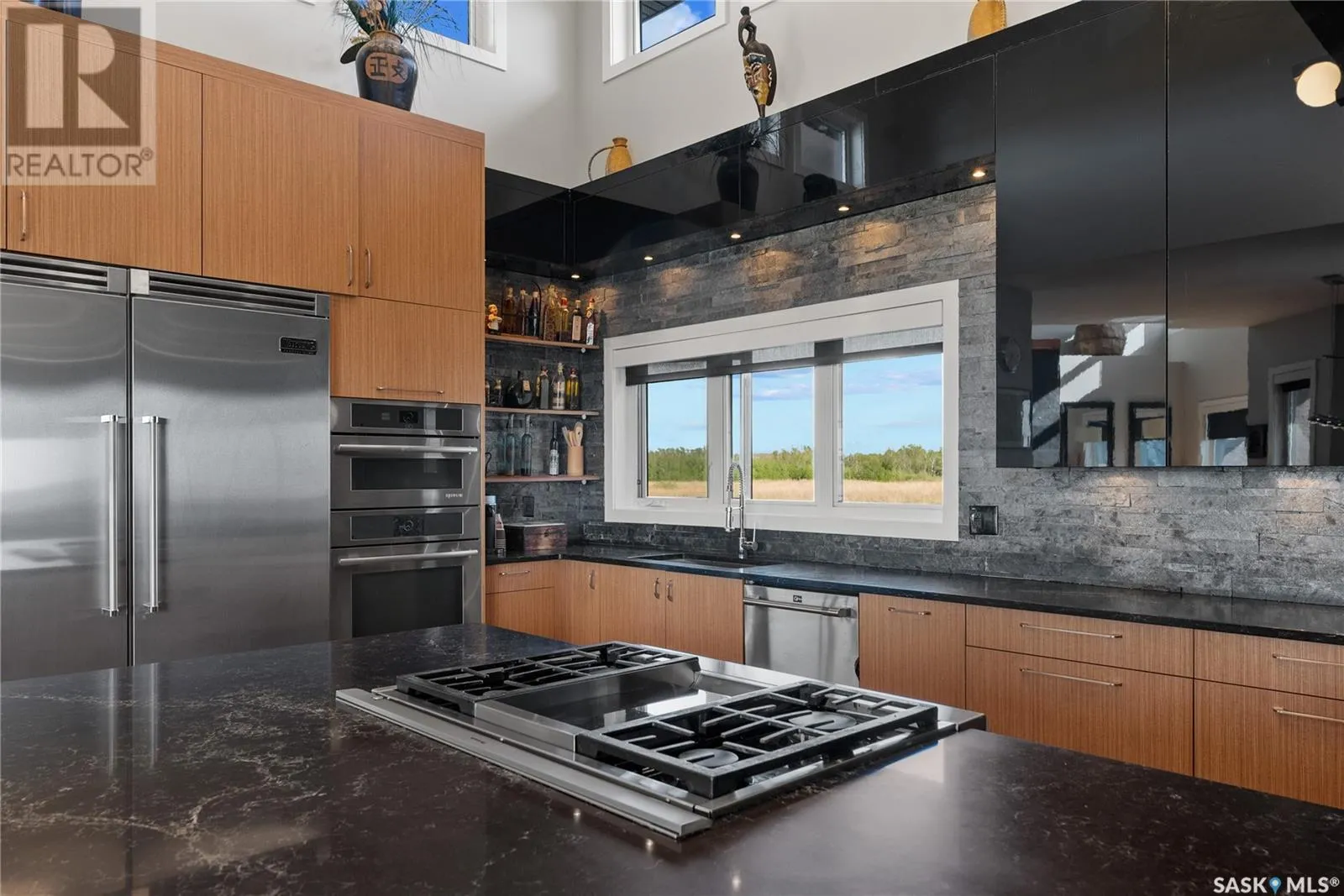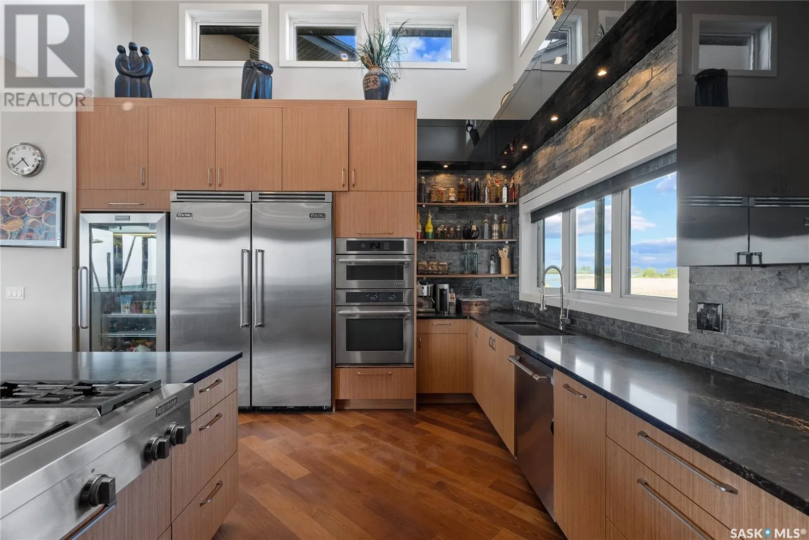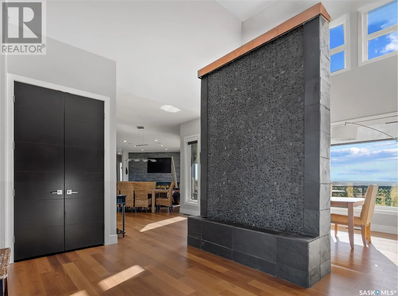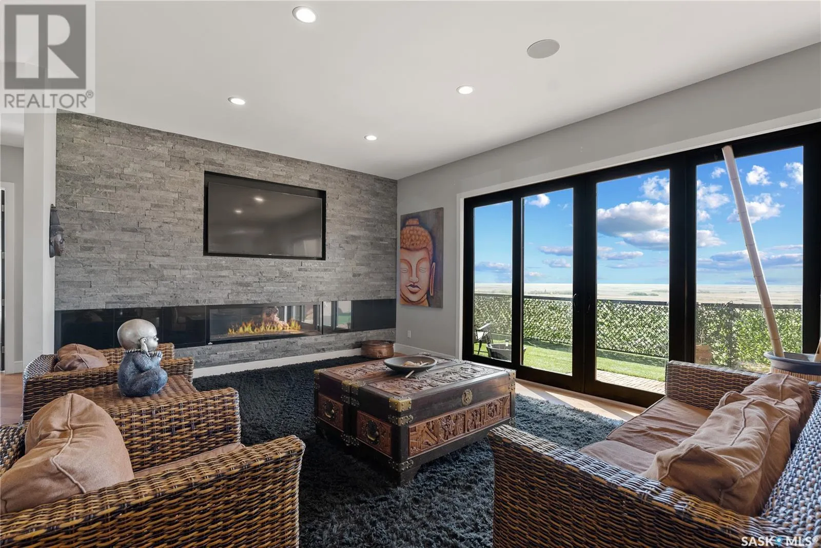EXTRAORDINARY GATED ESTATE â WALKOUT BUNGALOW WITH ATTACHED INDOOR RESORT-STYLE POOL COMPLEX Prepare to be amazed by this 2,583 sq ft walkout bungalow on 5 GATED acres minutes east on Bergheim Road (Mission Ridge). With pavement to the door, stately iron gates, and an impressive asphalt drive, this property welcomes you with curated luxury. A custom modern interior fountain sets the tone for whatâs to come. The main floor boasts a spectacular layout, including a dream kitchen, grand living and dining areas, den, 3 beds, 3 baths, laundry room, and an incredible primary suite. The kitchen features: ⢠Commercial glass-front cooler ⢠Viking and JennAir prof appliances ⢠Gas cooktop, double wall ovens ⢠Tall ceilings w/clerestory windows ⢠Stone backsplash, full-height cabinetry ⢠Large peninsula eating bar The great room stuns with a stone wall and a linear gas fireplace, 2 lounge areas, deck access. The expansive primary suite offers a spa-like experience with an extensively tiled ensuite, inset tub, oversized walk-in shower, dual vanities, and huge walk-in. Downstairs, enjoy 2,500 sq ft of finished space: ⢠3 more bedrooms, 2 full bathrooms ⢠Family+games room ⢠Professional ultimate theatre and gym AND THEN THEREâS THE RESORT⦠An attached 2,000 sq ft indoor pool complex with soaring ceilings, a saltwater pool w/ lights and waterslide, massive hot tub, full bar with 4 TVs, yoga loft, bathroom, hi tech specialized mechanical, glass overhead door to a deck, stamped concrete throughout. Simply paradise â no vacation needed! Outside: 5 scenic acres landscaped/rockscaping, decks and patios with panoramic prairie vistas Additional features:Triple attached garage, Smart home system w/speakers, 12-camera security, 400 amp service, interior by Atmosphere Design, auto blinds, tall ceilings w/clerestory windows, Forced air + boiler, in-floor heat garage and lower level. This home is unmatched in design and lifestyle. Floor plans in supplements. (id:27476)