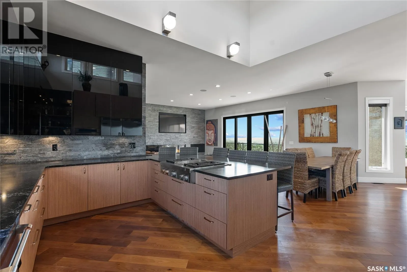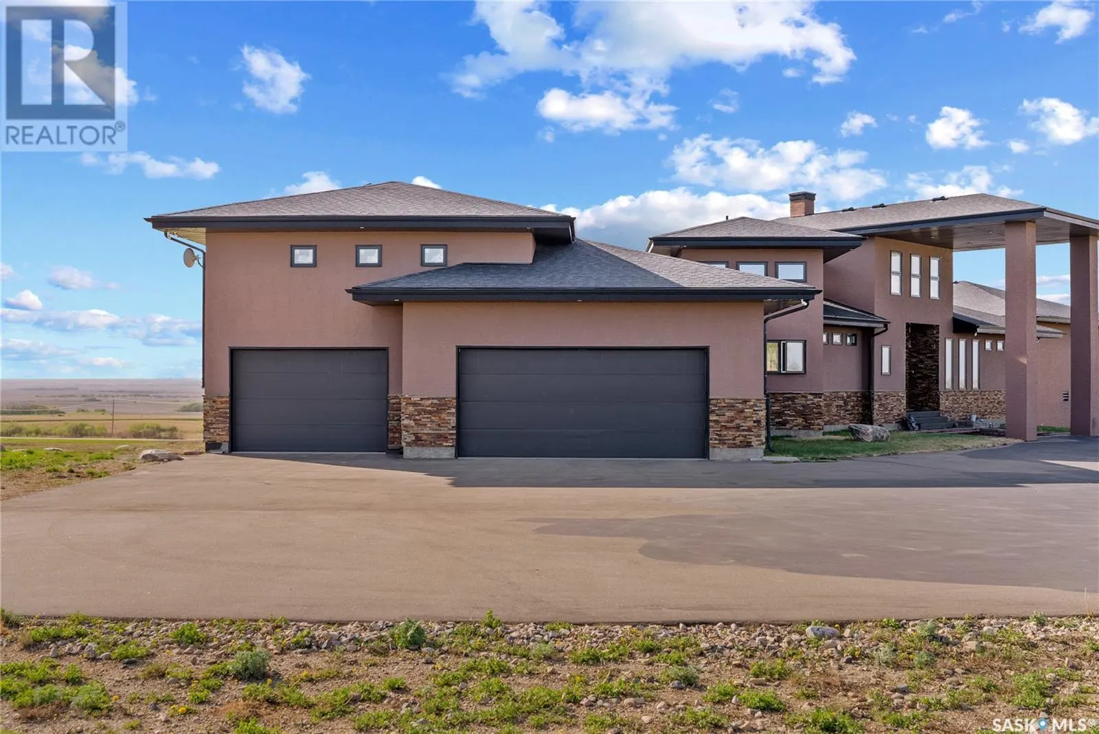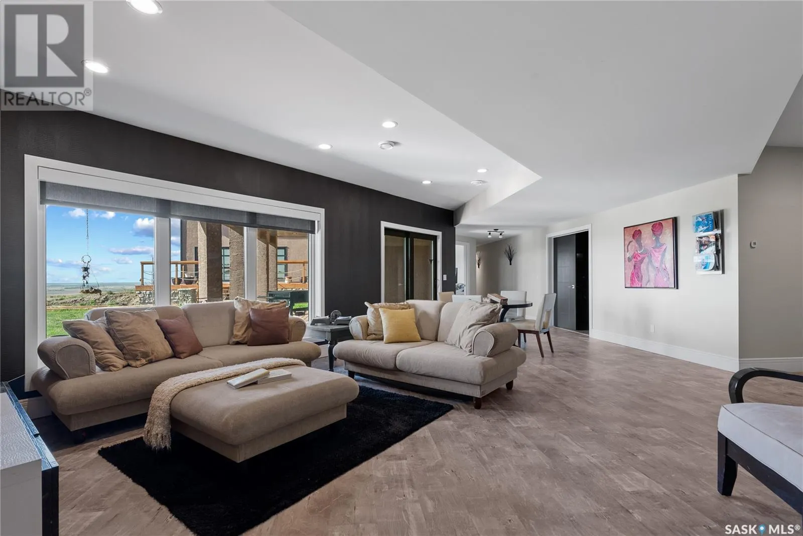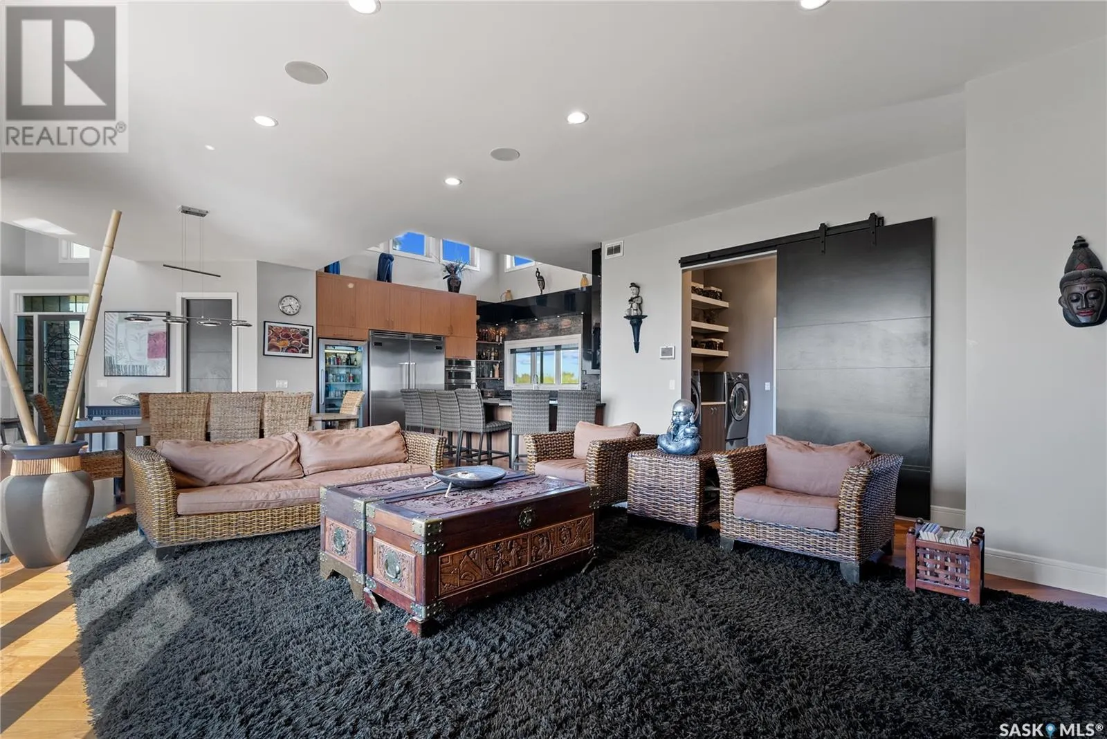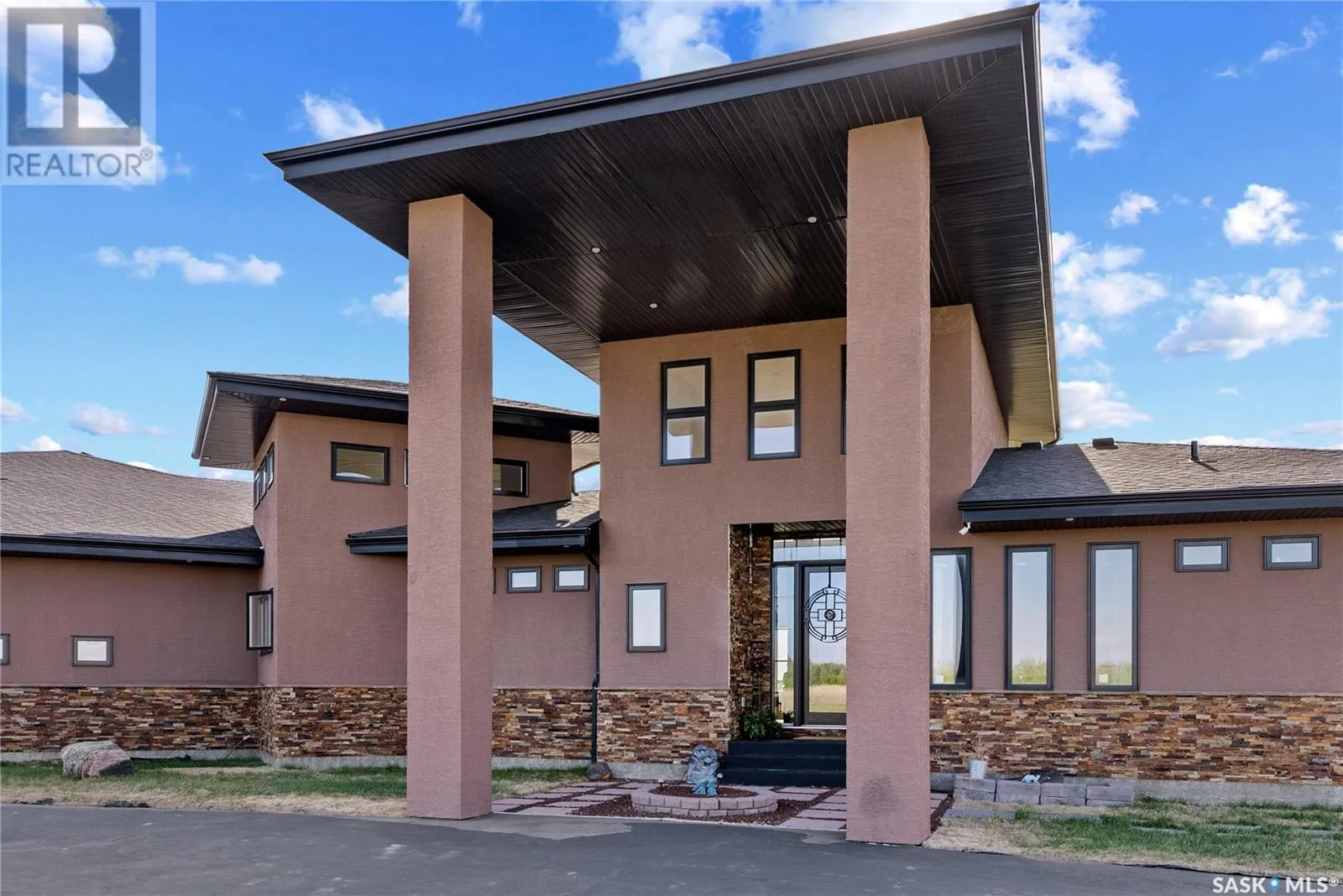 EXTRAORDINARY GATED ESTATE â WALKOUT BUNGALOW WITH ATTACHED INDOOR RESORT-STYLE POOL COMPLEX Prepare to be amazed by this 2,583 sq ft walkout bungalow on 5 GATED acres minutes east on Bergheim Road (Mission Ridge). With pavement to the door, stately iron gates, and an impressive asphalt drive, this property welcomes you with curated luxury. A custom modern interior fountain sets the tone for whatâs to come. The main floor boasts a spectacular layout, including a dream kitchen, grand living and dining areas, den, 3 beds, 3 baths, laundry room, and an incredible primary suite. The kitchen features: ⢠Commercial glass-front cooler ⢠Viking and JennAir prof appliances ⢠Gas cooktop, double wall ovens ⢠Tall ceilings w/clerestory windows ⢠Stone backsplash, full-height cabinetry ⢠Large peninsula eating bar The great room stuns with a stone wall and a linear gas fireplace, 2 lounge areas, deck access. The expansive primary suite offers a spa-like experience with an extensively tiled ensuite, inset tub, oversized walk-in shower, dual vanities, and huge walk-in. Downstairs, enjoy 2,500 sq ft of finished space: ⢠3 more bedrooms, 2 full bathrooms ⢠Family+games room ⢠Professional ultimate theatre and gym AND THEN THEREâS THE RESORT⦠An attached 2,000 sq ft indoor pool complex with soaring ceilings, a saltwater pool w/ lights and waterslide, massive hot tub, full bar with 4 TVs, yoga loft, bathroom, hi tech specialized mechanical, glass overhead door to a deck, stamped concrete throughout. Simply paradise â no vacation needed! Outside: 5 scenic acres landscaped/rockscaping, decks and patios with panoramic prairie vistas Additional features:Triple attached garage, Smart home system w/speakers, 12-camera security, 400 amp service, interior by Atmosphere Design, auto blinds, tall ceilings w/clerestory windows, Forced air + boiler, in-floor heat garage and lower level. This home is unmatched in design and lifestyle. Floor plans in supplements. (id:27476)