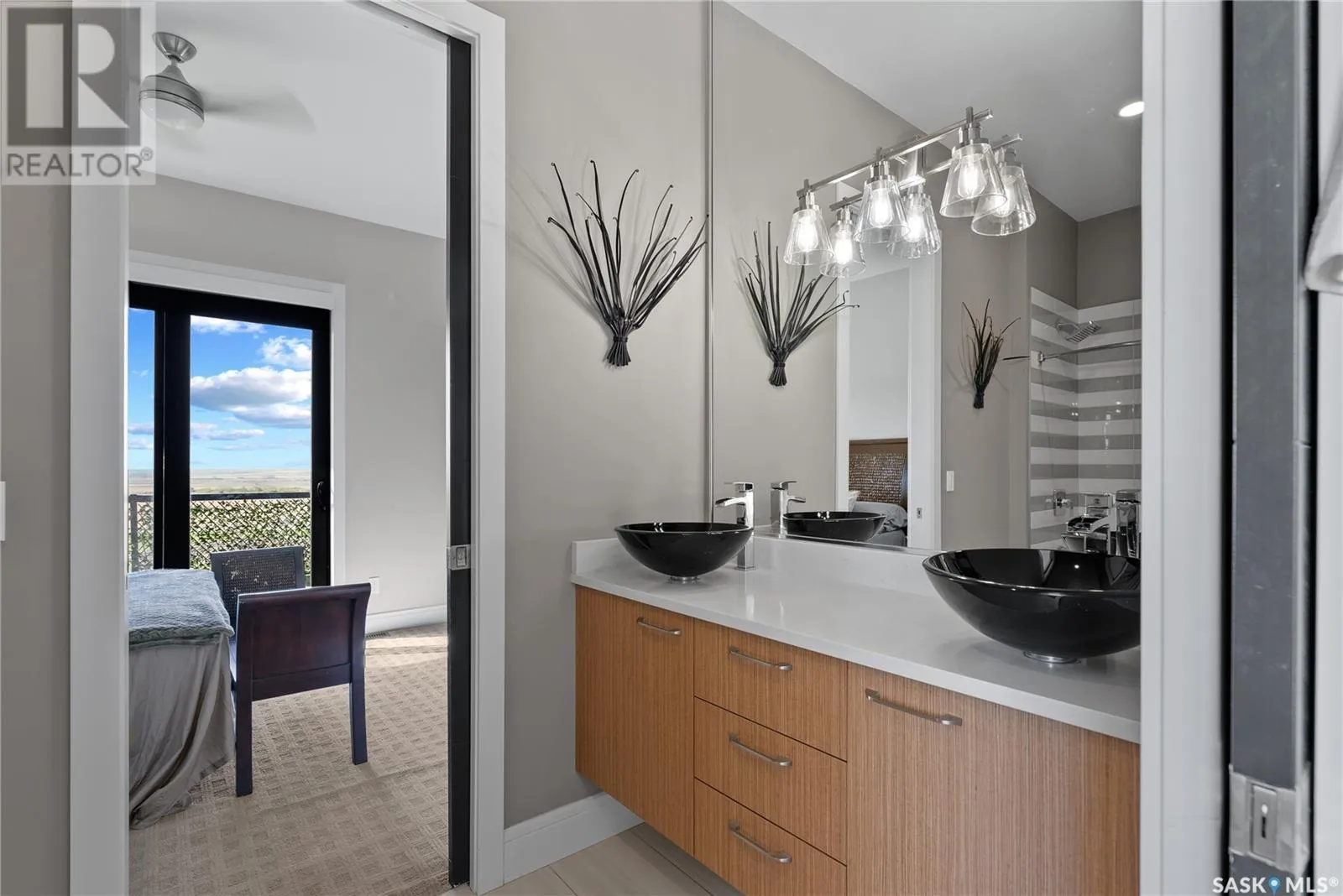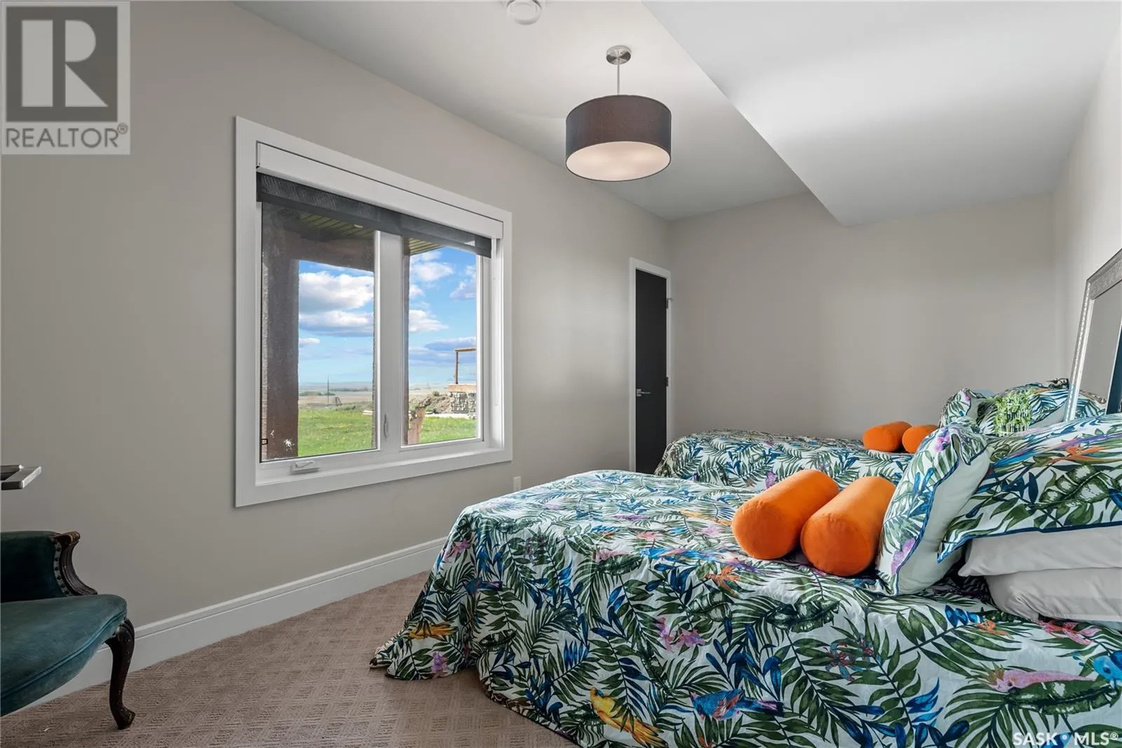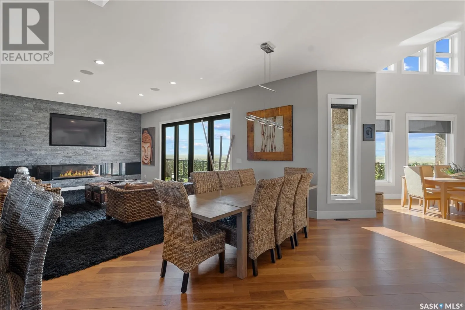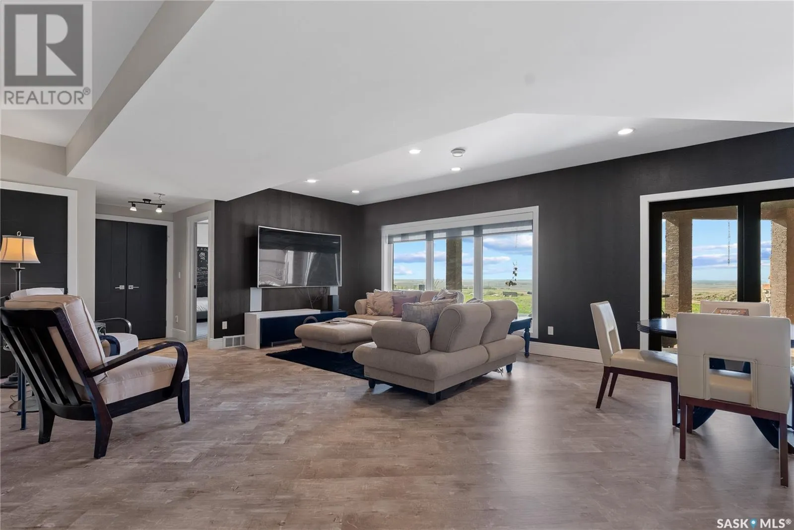 EXTRAORDINARY GATED ESTATE â WALKOUT BUNGALOW WITH ATTACHED INDOOR RESORT-STYLE POOL COMPLEX Prepare to be amazed by this 2,583 sq ft walkout bungalow on 5 GATED acres minutes east on Bergheim Road (Mission Ridge). With pavement to the door, stately iron gates, and an impressive asphalt drive, this property welcomes you with curated luxury. A custom modern interior fountain sets the tone for whatâs to come. The main floor boasts a spectacular layout, including a dream kitchen, grand living and dining areas, den, 3 beds, 3 baths, laundry room, and an incredible primary suite. The kitchen features: ⢠Commercial glass-front cooler ⢠Viking and JennAir prof appliances ⢠Gas cooktop, double wall ovens ⢠Tall ceilings w/clerestory windows ⢠Stone backsplash, full-height cabinetry ⢠Large peninsula eating bar The great room stuns with a stone wall and a linear gas fireplace, 2 lounge areas, deck access. The expansive primary suite offers a spa-like experience with an extensively tiled ensuite, inset tub, oversized walk-in shower, dual vanities, and huge walk-in. Downstairs, enjoy 2,500 sq ft of finished space: ⢠3 more bedrooms, 2 full bathrooms ⢠Family+games room ⢠Professional ultimate theatre and gym AND THEN THEREâS THE RESORT⦠An attached 2,000 sq ft indoor pool complex with soaring ceilings, a saltwater pool w/ lights and waterslide, massive hot tub, full bar with 4 TVs, yoga loft, bathroom, hi tech specialized mechanical, glass overhead door to a deck, stamped concrete throughout. Simply paradise â no vacation needed! Outside: 5 scenic acres landscaped/rockscaping, decks and patios with panoramic prairie vistas Additional features:Triple attached garage, Smart home system w/speakers, 12-camera security, 400 amp service, interior by Atmosphere Design, auto blinds, tall ceilings w/clerestory windows, Forced air + boiler, in-floor heat garage and lower level. This home is unmatched in design and lifestyle. Floor plans in supplements. (id:27476)