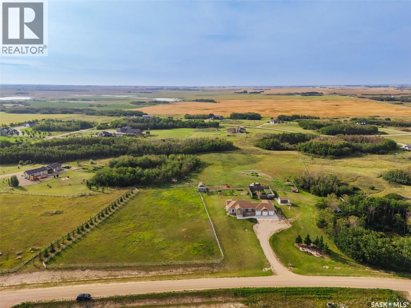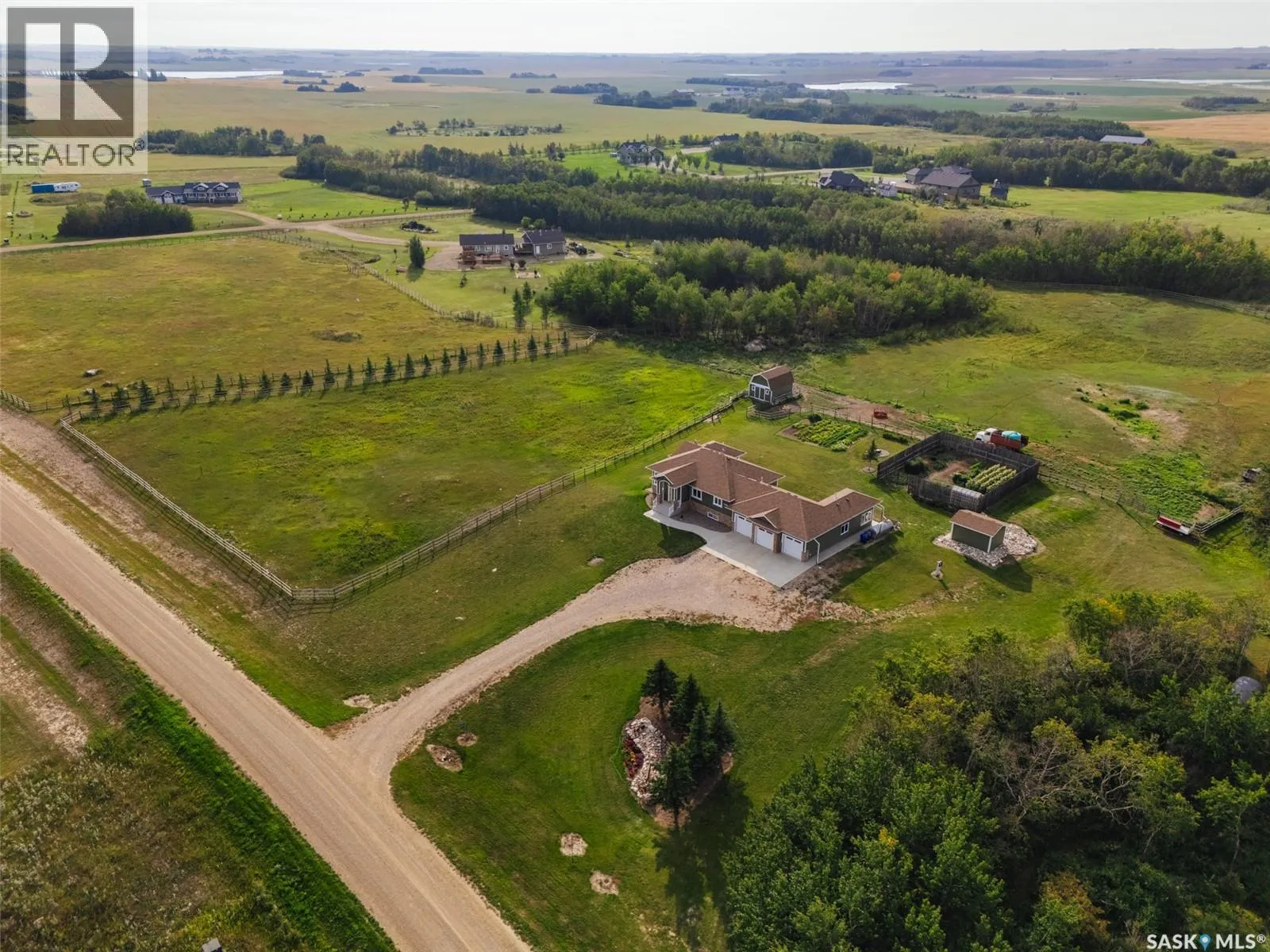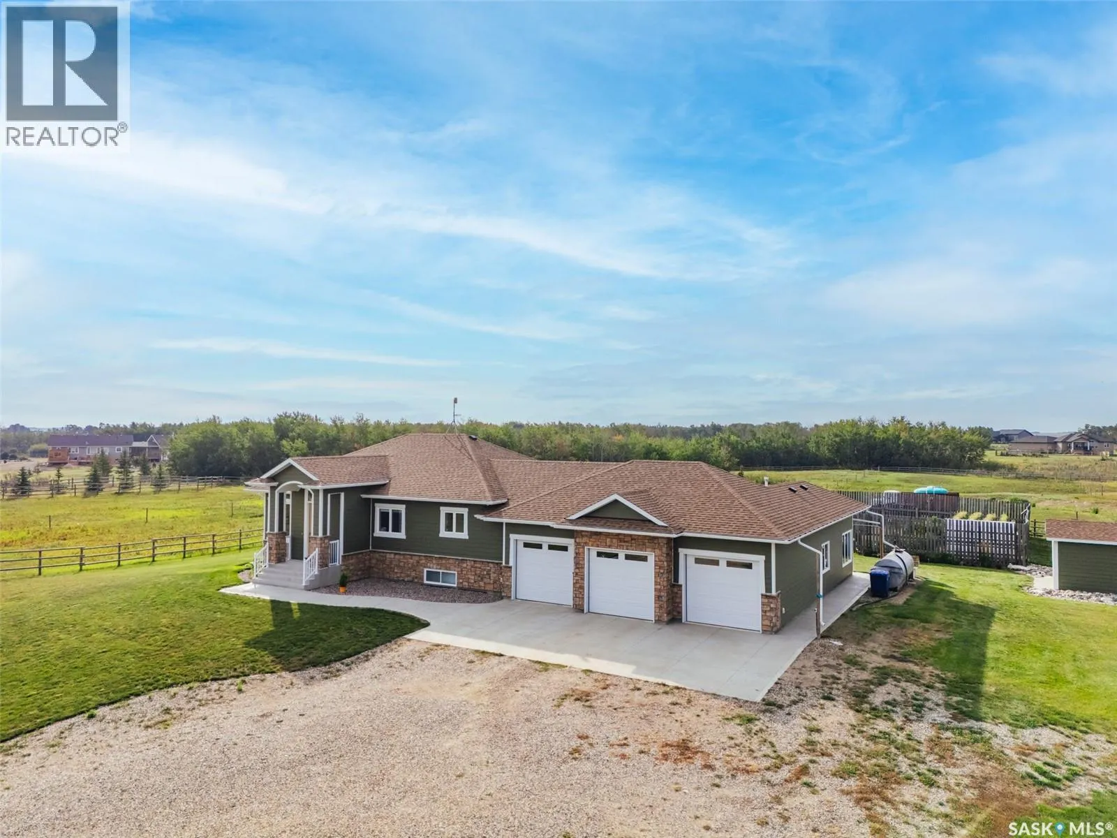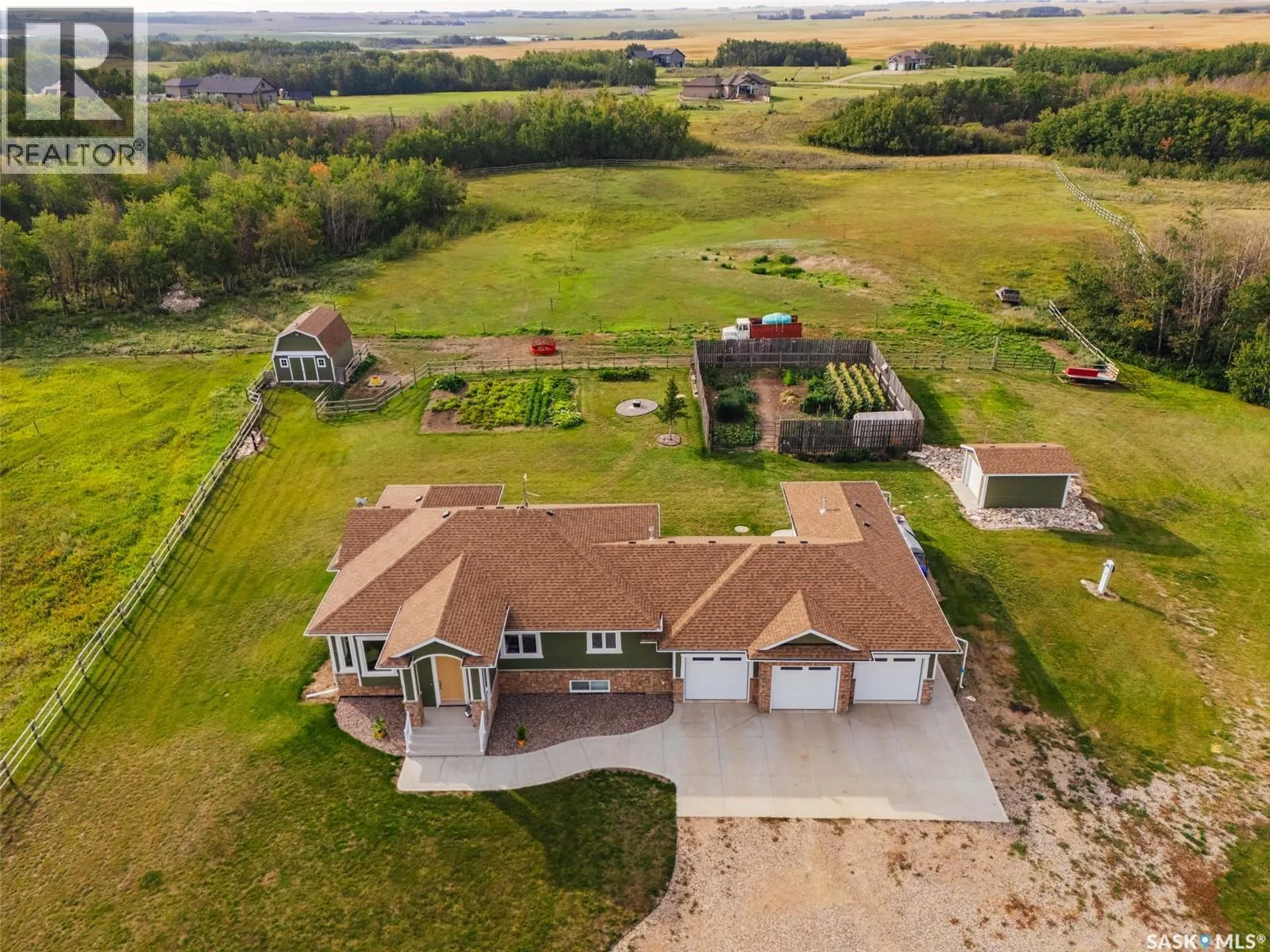 Welcome to 118 Louise Crescent in the coveted acreage community of Cherry Hills â just 15 minutes from Saskatoonâs edge. This 1,502 sq. ft. executive bungalow is a stunning blend of modern design, smart functionality, and country charm. Step inside to discover a bright, open-concept main floor with an exceptional window package that floods the home with natural light. The spacious living room, dining area, and kitchen flow seamlessly under a vaulted ceiling, creating the perfect setting for entertaining or relaxing. The kitchen features quartz countertops, a corner pantry, roll-out drawers, stainless steal appliances. The dining room can easily seat a large extended family for holiday meals and the gas fireplace in the adjoining living room makes for cozy evenings. Hardwood runs throughout the main level, and a covered deck off the dining area allows for year-round BBQ. The primary suite is a lovely retreat, offering a large walk-in closet and an ensuite with a soaker tub beneath a privacy rain-glass window, heated floors, and a walk-in shower. A 2nd large bedroom (or office), another 4-piece bath, and a spacious mudroom/laundry room with built-in cabinetry, quartz countertops, and deep utility sink complete the main floor â all leading to an oversized triple-car garage with a separate workshop bay and a sunlit all-season greenhouse.The fully finished basement features a large family and games area, 2 more bedrooms, 4-piece bath, and a vented cold storage room perfect for preserves or wine. Outside, the 7.14 acre property is 3/4 fenced with treated rail fencing, hotwired, & divided into five paddocks with a 4-season watering bowl sourced by underground lines. Mature spruce trees border the property, and thereâs a drive-in garden shed, an adorable matching horse barn, and 2 fully developed gardens with direct waterlines. Complete with central air, central vac, and window coverings, this Cherry Hills acreage offers comfort with country serenity â a truly rare find. (id:27476)