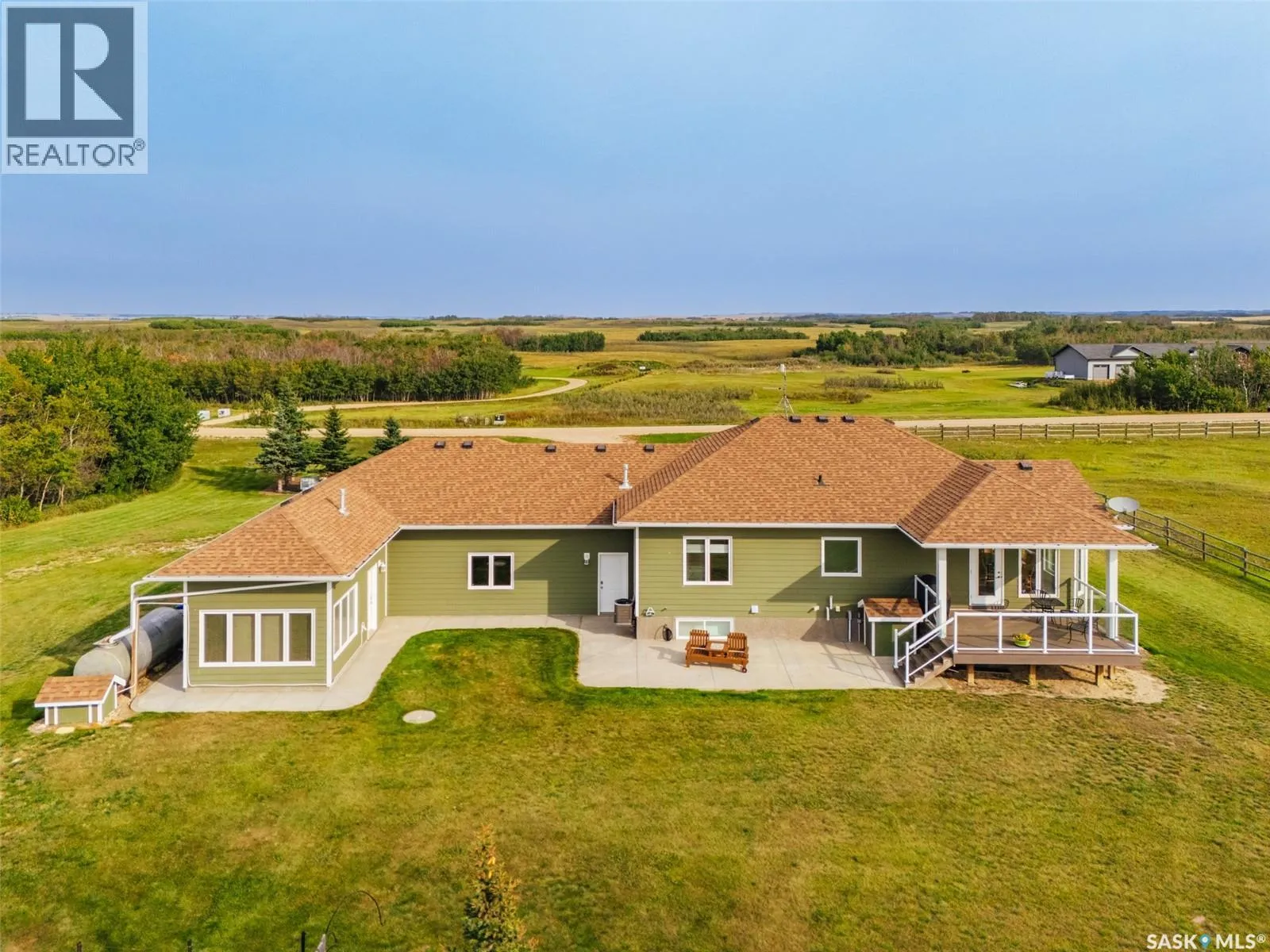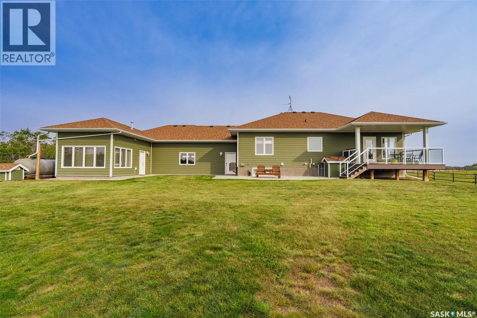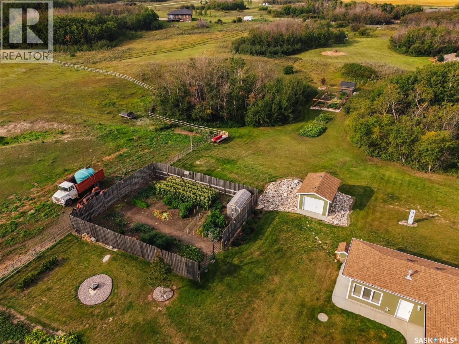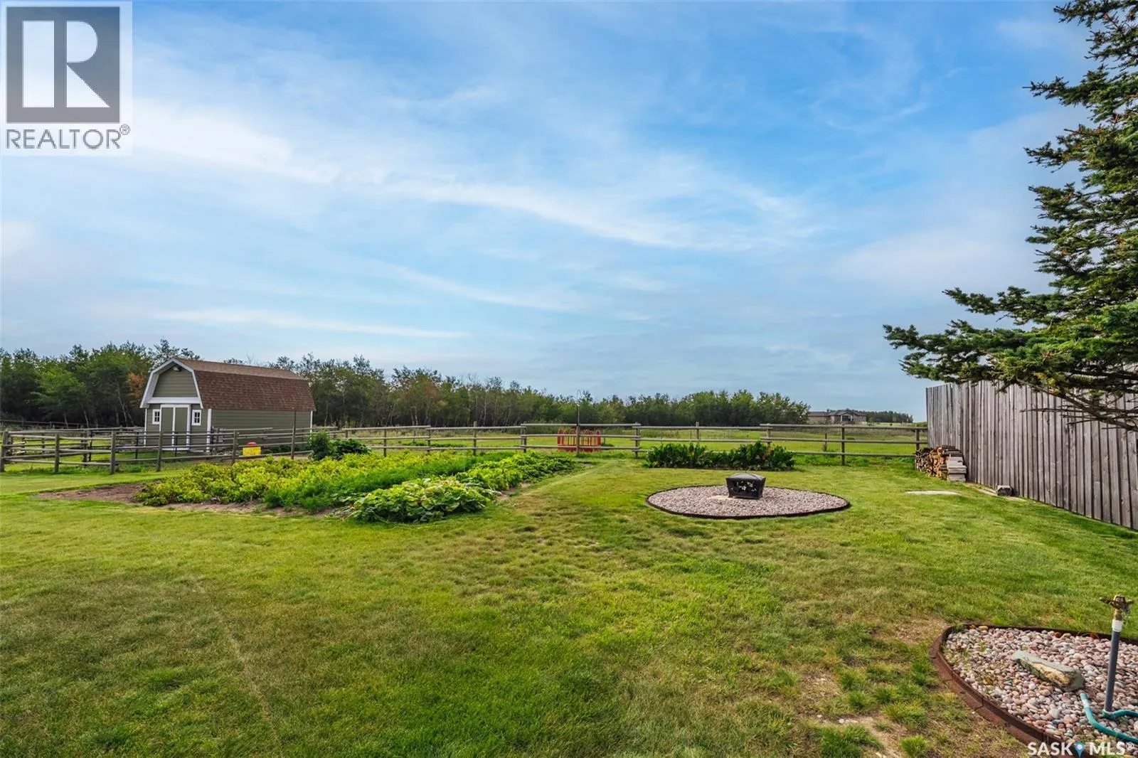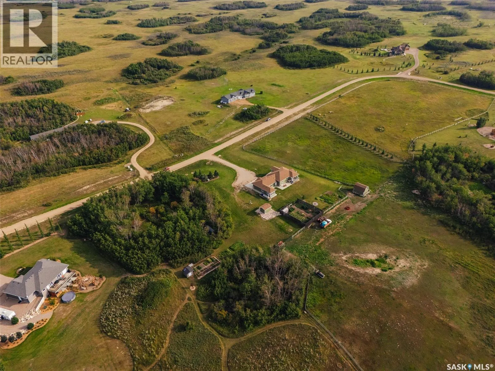 Welcome to 118 Louise Crescent in the coveted acreage community of Cherry Hills â just 15 minutes from Saskatoonâs edge. This 1,502 sq. ft. executive bungalow is a stunning blend of modern design, smart functionality, and country charm. Step inside to discover a bright, open-concept main floor with an exceptional window package that floods the home with natural light. The spacious living room, dining area, and kitchen flow seamlessly under a vaulted ceiling, creating the perfect setting for entertaining or relaxing. The kitchen features quartz countertops, a corner pantry, roll-out drawers, stainless steal appliances. The dining room can easily seat a large extended family for holiday meals and the gas fireplace in the adjoining living room makes for cozy evenings. Hardwood runs throughout the main level, and a covered deck off the dining area allows for year-round BBQ. The primary suite is a lovely retreat, offering a large walk-in closet and an ensuite with a soaker tub beneath a privacy rain-glass window, heated floors, and a walk-in shower. A 2nd large bedroom (or office), another 4-piece bath, and a spacious mudroom/laundry room with built-in cabinetry, quartz countertops, and deep utility sink complete the main floor â all leading to an oversized triple-car garage with a separate workshop bay and a sunlit all-season greenhouse.The fully finished basement features a large family and games area, 2 more bedrooms, 4-piece bath, and a vented cold storage room perfect for preserves or wine. Outside, the 7.14 acre property is 3/4 fenced with treated rail fencing, hotwired, & divided into five paddocks with a 4-season watering bowl sourced by underground lines. Mature spruce trees border the property, and thereâs a drive-in garden shed, an adorable matching horse barn, and 2 fully developed gardens with direct waterlines. Complete with central air, central vac, and window coverings, this Cherry Hills acreage offers comfort with country serenity â a truly rare find. (id:27476)