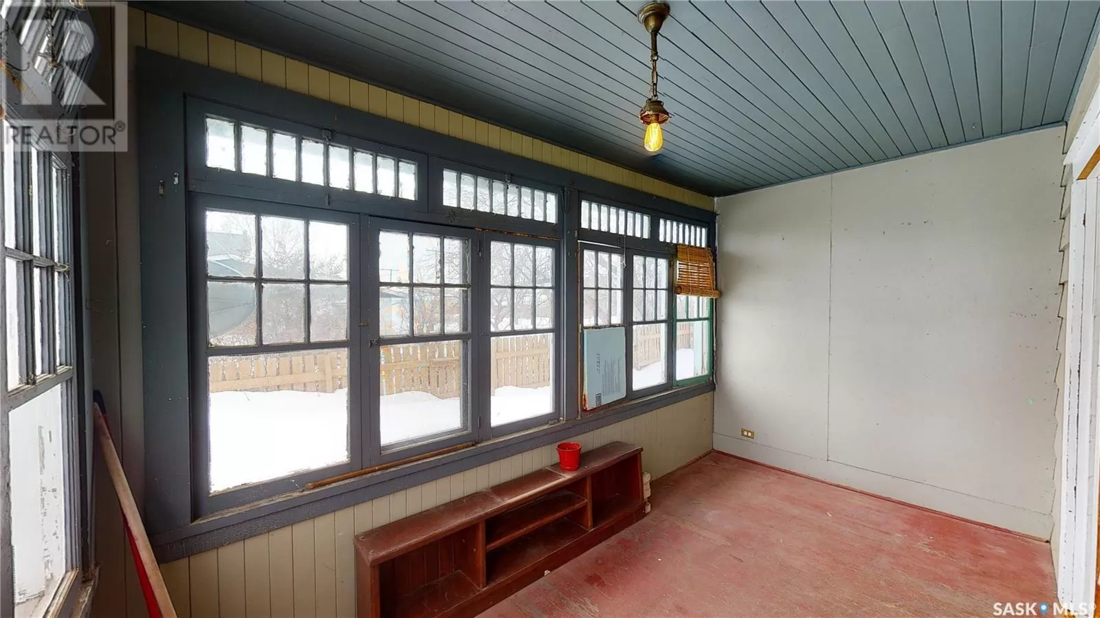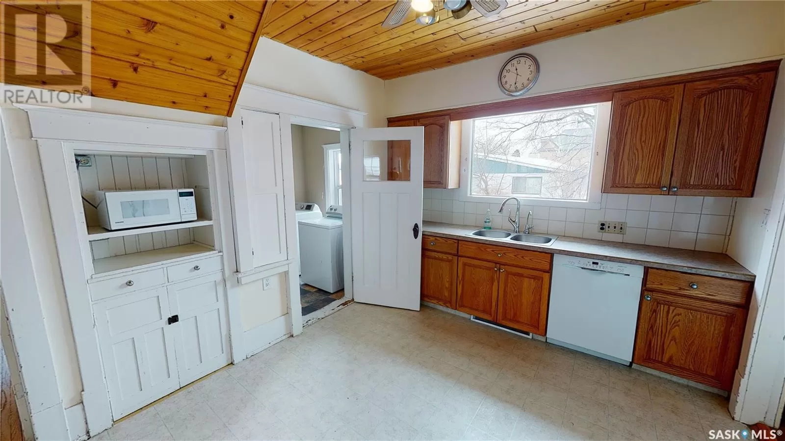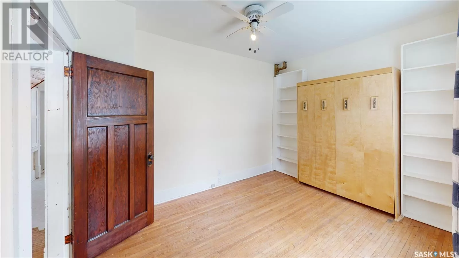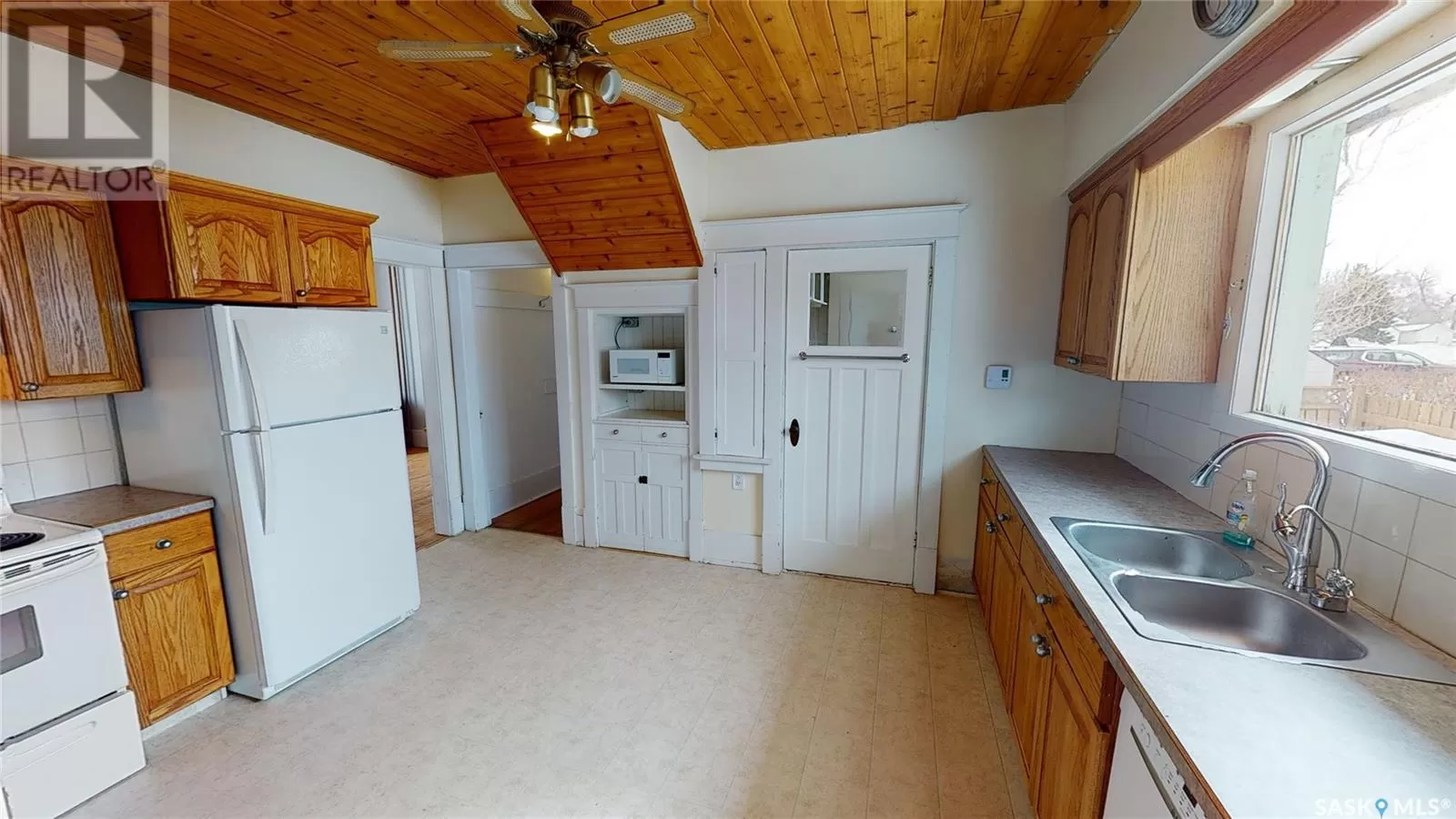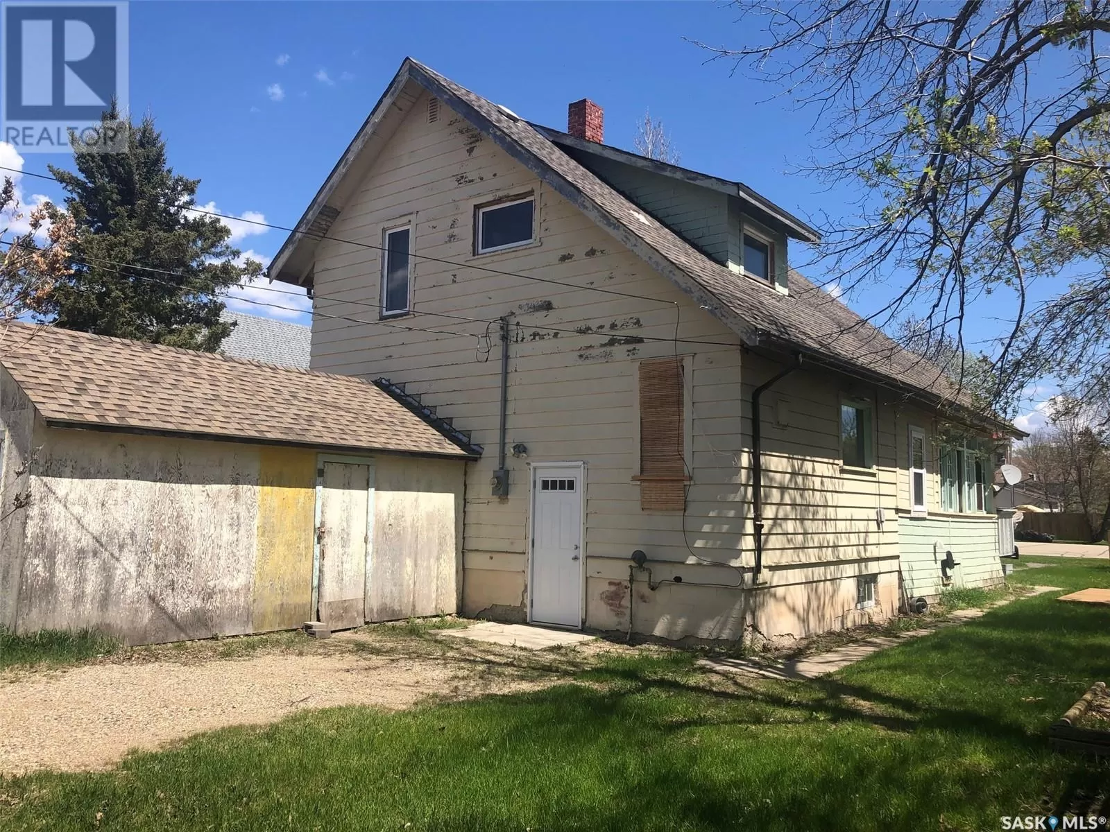 SPACIOUS CHARACTER HOME - 4 BEDROOMS, 2 BATHS, ENCLOSED ORIGINAL SUNROOM - over 1700 sq.ft on a full concrete/masonry foundation. This home has lots of character with original solid wood doors, baseboards/casing, wood floors, good size bedrooms with walk-in closets, L-Shaped upstairs landing with plenty of storage spaces and character features. UPDATES: Fiberglass Shingles (2014); Gas Water Heater (Sept/2020); 100 Amp Panel (electrical inspection completed Nov 2021), Majority of Windows updated to Vinyl, Exterior Cold & Hot Water Taps plus a bonus Soft Water Tap; treated wood side deck. Main Floor - front entry off the sunroom leads to the corner living room; central original staircase accessed from the living room and the kitchen with close access to the dining room & Main Floor Bedroom (office space) that has built-in shelving with Murphy Bed included. Large Kitchen with oak cabinets leads to the 4pc bathroom and to a bonus room currently used for laundry but with space to turn into a pantry/storage. The Back door leads to the kitchen and to the basement. Basement has utility room, storage room, wine making room with Utility sink and lined with galvanized metal walls, plus a large open room with some built-in shelving. The Back yard is partially fenced with parking off the back alley, attached garage has been rewired and currently used just for storage, front yard has a nice cherry tree, grapes, small play house/sand box are near the side deck, small deck off the sunroom. INCLUDES: Fridge, Store, Hood Range, Dishwasher, Washer & Dryer, Dehumidifier, Portable Air Conditioner, Storage Shed. This charming home is worth a view, check out the attached 3D Matterport Tour and contact your realtor for a viewing! (id:27476)