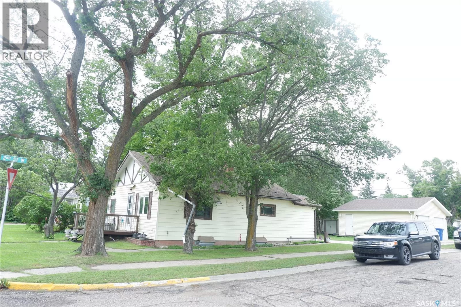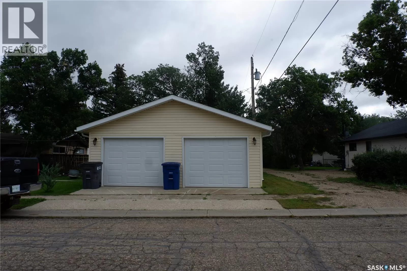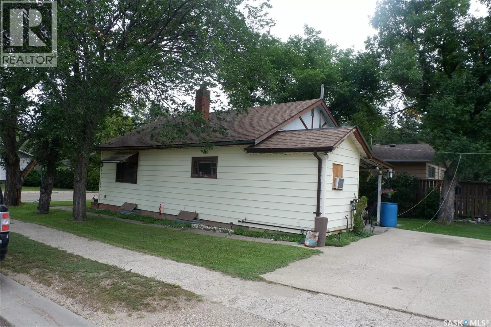 Located in the Town of Assiniboia. Come check out this great home on a corner lot. Newer double detached garage! The home has an eat-in kitchen, living room, 2 bedrooms and 4-piece bath. The basement is partially developed with a 3-piece bath and lots of storage rooms. The furnace has been upgraded to a high efficient natural gas model recently. There is extra parking in the back with a concrete parking pad. This property is currently rented. Good starter home or investment property. Come look at it today! (id:27476)