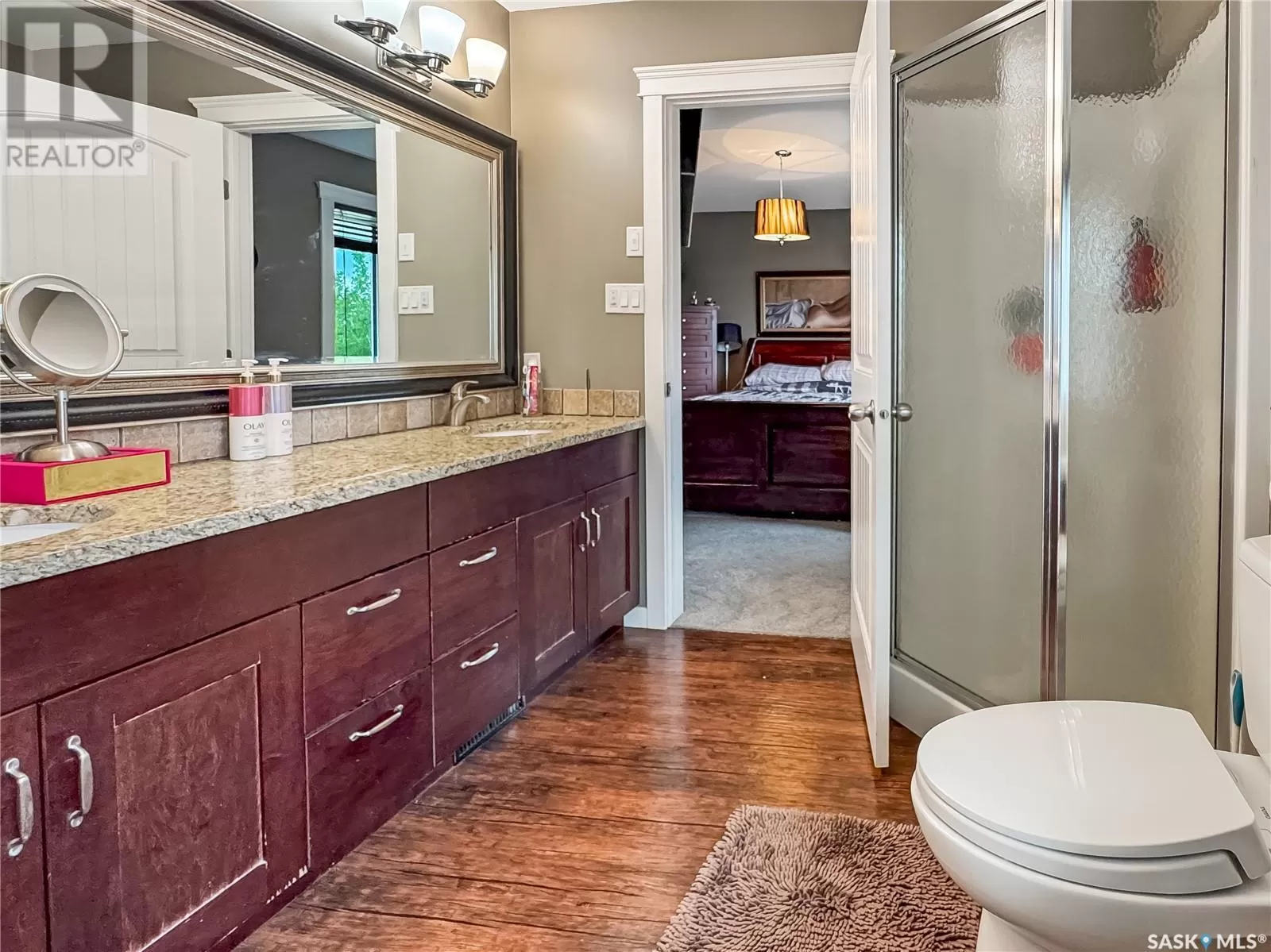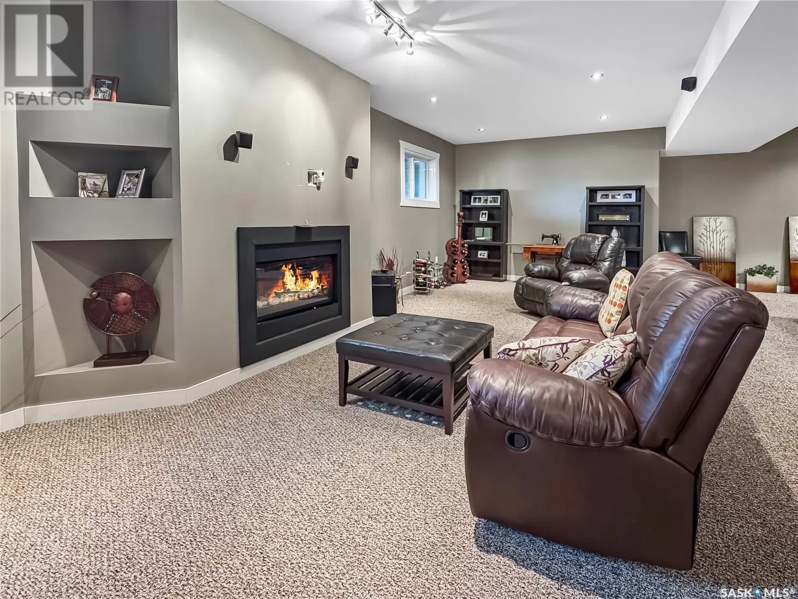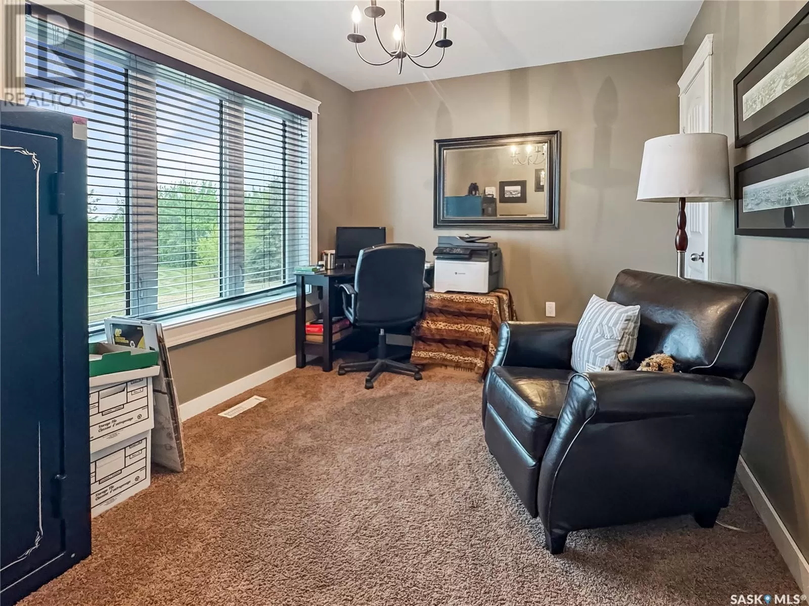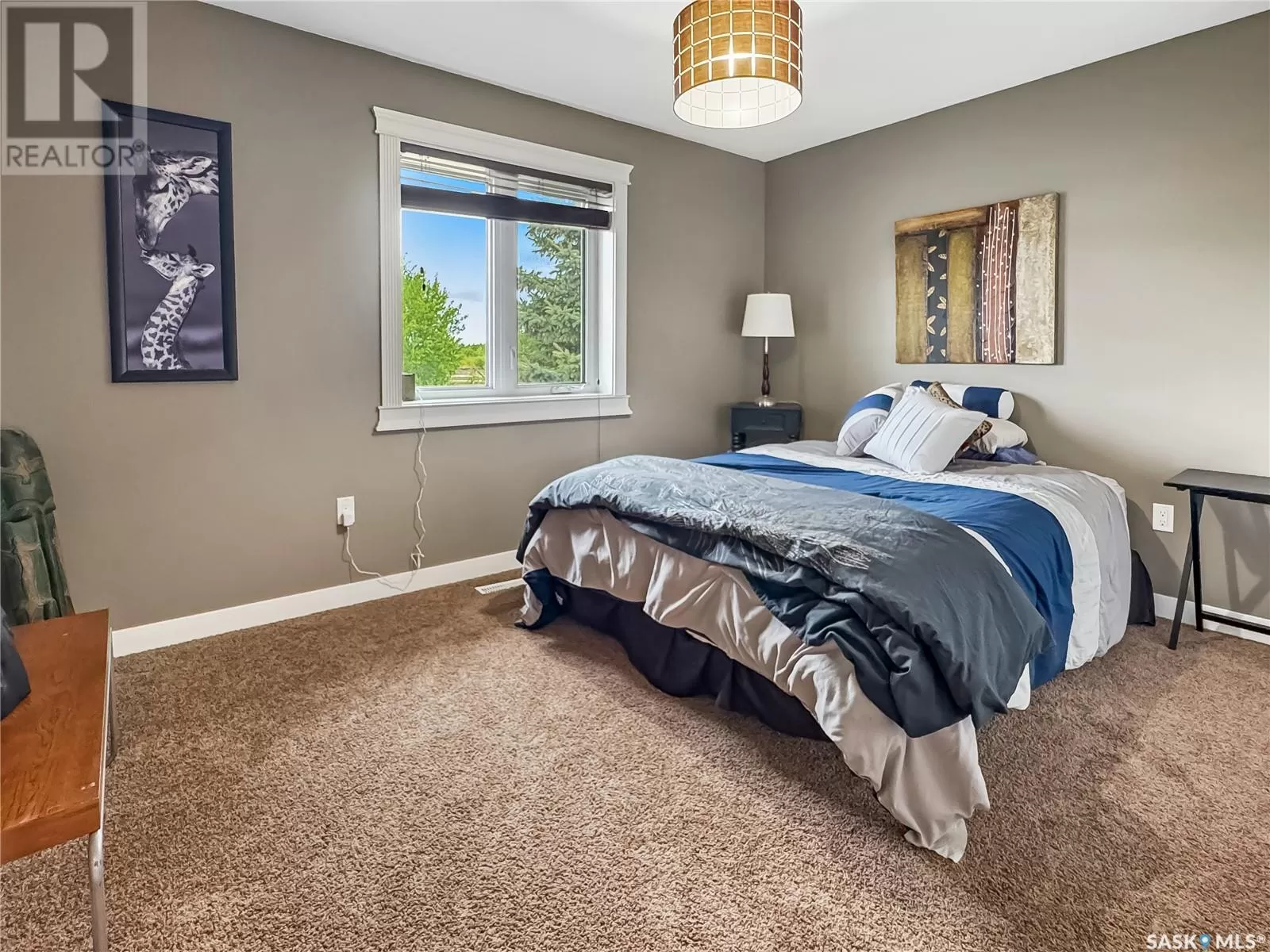 Tucked into the sought-after Battle Ridge Estates, this gorgeous 12.45-acre property offers the perfect mix of modern comfort and peaceful prairie living. From the moment you arrive, this home stands out. A paved driveway leads to a metal security gate, welcoming you into a beautifully landscaped yard equipped with over 100 underground sprinklers to keep everything lush and green. Inside, this spacious 5-bedroom bungalow is built to impress. The main level is constructed with 2x8 walls wrapped in 1.5 inches of Styrofoam insulation, delivering both efficiency and durability. Enjoy elegant finishes throughout including granite countertops, tile and hardwood flooring, and in-floor heat in the basement and garage as well as forced air natural gas furnace to accompany central air conditioning in the summer for the main floor. The heart of the home is the stunning kitchen featuring a massive granite island that flows seamlessly into the dining and living areas. Patio doors lead from the dining space to a large deck overlooking your private view of the natural Saskatchewan plains. The main floor includes three spacious bedrooms, and a luxurious primary suite with walk in closet, a Jacuzzi tub, tiled shower, and dual sinks. Downstairs, the fully finished basement features 9-foot ceilings, an expansive recreation area open to a cozy family room with a natural gas fireplace, two oversized bedrooms, a full bath, and another office or hobby space. The basement is built with 8-inch ICF walls, ensuring long-term strength and insulation. The triple attached garage adds even more value, boasting acid-stained in-floor heated concrete, plus a convenient bathroomâa rare find. There is a massive 40 x 40 pole shed for even more extras storage. Whether youâre seeking space, peace, or a high-end acreage lifestyle, this property offers it all. Move-in ready and built for comfortâcome experience the acreage life without giving up convenience. Call today to book your private showing. (id:27476)