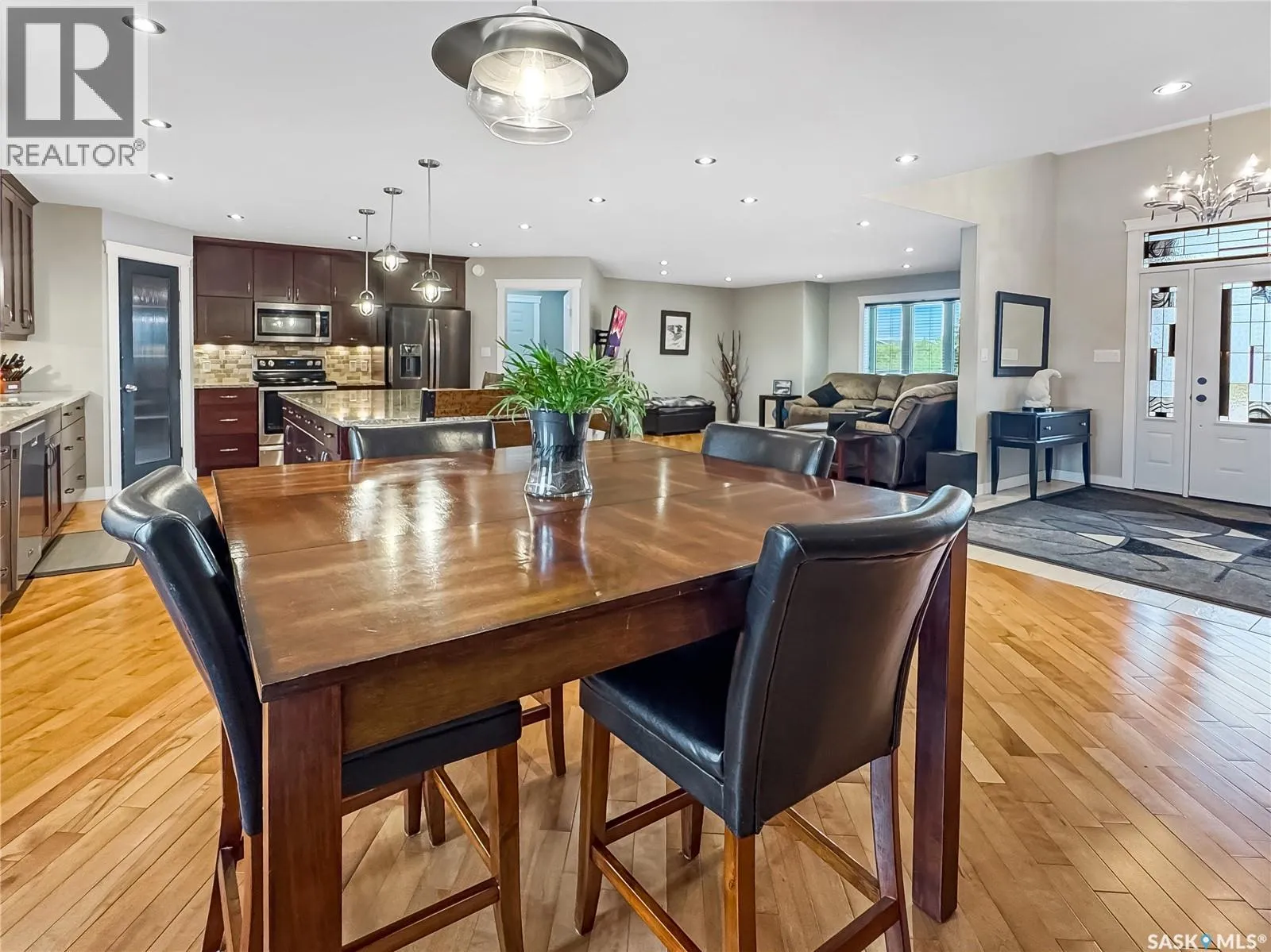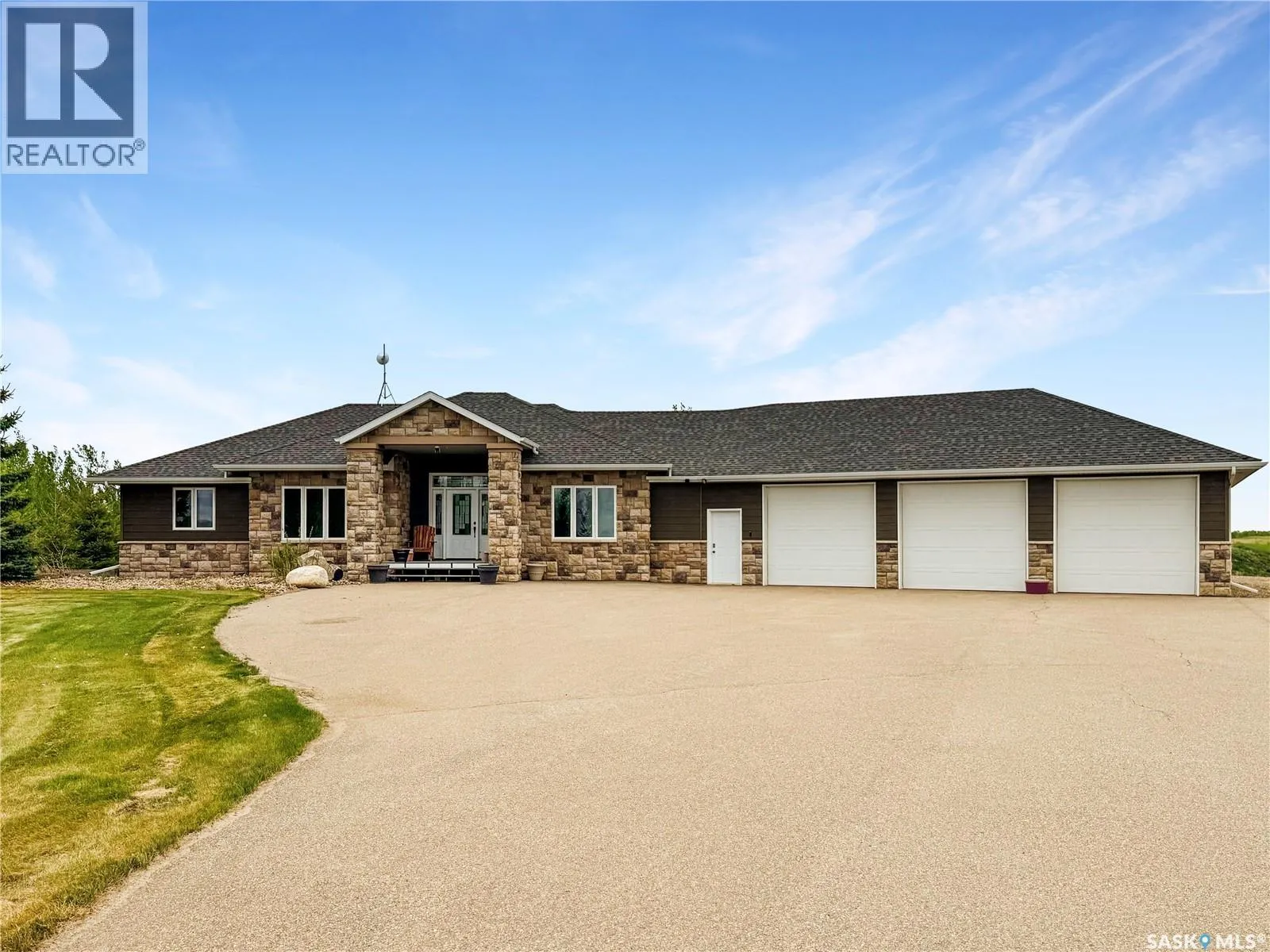 Tucked into the sought-after Battle Ridge Estates, this gorgeous 12.45-acre property offers the perfect mix of modern comfort and peaceful prairie living. From the moment you arrive, this home stands out. A paved driveway leads to a metal security gate, welcoming you into a beautifully landscaped yard equipped with over 100 underground sprinklers to keep everything lush and green. Inside, this spacious 5-bedroom bungalow is built to impress. The main level is constructed with 2x8 walls wrapped in 1.5 inches of Styrofoam insulation, delivering both efficiency and durability. Enjoy elegant finishes throughout including granite countertops, tile and hardwood flooring, and in-floor heat in the basement and garage as well as forced air natural gas furnace to accompany central air conditioning in the summer for the main floor. The heart of the home is the stunning kitchen featuring a massive granite island that flows seamlessly into the dining and living areas. Patio doors lead from the dining space to a large deck overlooking your private view of the natural Saskatchewan plains. The main floor includes three spacious bedrooms, and a luxurious primary suite with walk in closet, a Jacuzzi tub, tiled shower, and dual sinks. Downstairs, the fully finished basement features 9-foot ceilings, an expansive recreation area open to a cozy family room with a natural gas fireplace, two oversized bedrooms, a full bath, and another office or hobby space. The basement is built with 8-inch ICF walls, ensuring long-term strength and insulation. The triple attached garage adds even more value, boasting acid-stained in-floor heated concrete, plus a convenient bathroomâa rare find. There is a massive 40 x 40 pole shed for even more extras storage. Whether youâre seeking space, peace, or a high-end acreage lifestyle, this property offers it all. Move-in ready and built for comfortâcome experience the acreage life without giving up convenience. Call today to book your private showing. (id:27476)